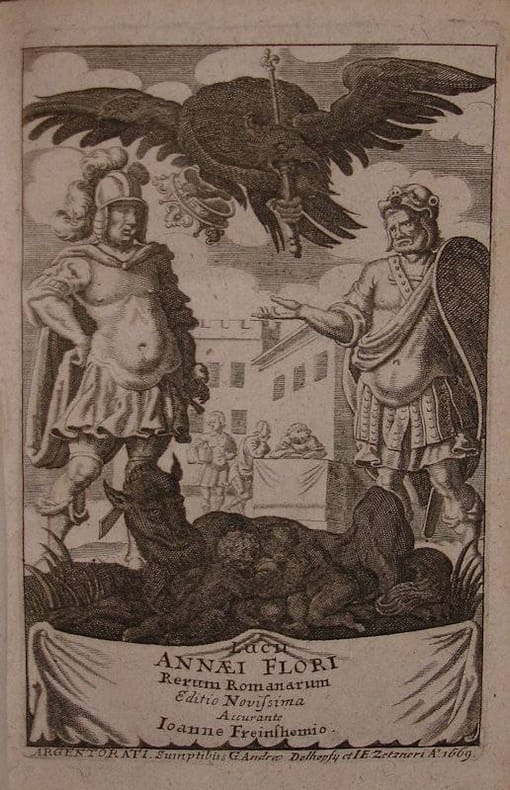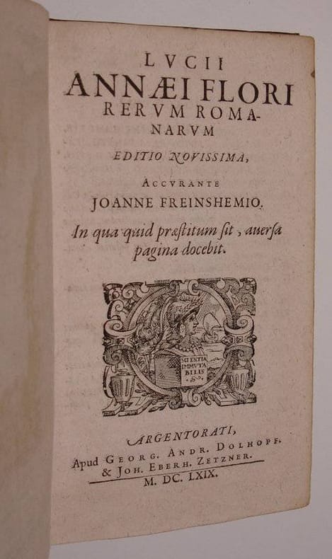 8vo. (32),452,(155, 'Variae lectiones' & index),(1 blank) p.; frontispiece. Vellum 17 cm (Ref: VD17 3:306199X; Schweiger 2,361; Fabricius/Ernesti 2,444; Graesse 2,605) (Details: 5 thongs laced through the joints. Frontispiece depicts two discussing Roman warriors, at their feet the she-wolf and the twins Romulus and Remus, above their head soars a big eagle holding in its claws a crown and a scepter. Woodcut printer's mark, depicting a bust of the Greek goddess Athena) (Condition: 3 thongs of the joint of the lower board snapped. Vellum age-toned & somewhat soiled. Pastedown of the lower board detached. Old ink annotations in the first gatherings. Ten gatherings browning) (Note: Favourite school-book in the 17th century. This is the chief work of the Roman historian Lucius Annaeus Florus, who lived at the beginning 2nd century AD. It is an abridgement of Roman history with special reference to the wars waged up to the age of Augustus. Florus 'shows a certain literary gift, marred, however, by a strong tendency to rhetoric. His brevity often entails obscurity, though he sometimes produces a felicitous epigram. (...) As an historian he is often inaccurate in both chronology and geography, but the work as a whole achieves a limited success as a rapid sketch of Roman military history. It was a favourite school-book in the 17th century'. (OCD, 2nd ed. p. 442) This Florus edition was produced by the German classical scholar Johannes Casper Freinsheim, 1608-1660. He was an excellent representative of the flourishing school of Roman History at the University of Strassburg. 'The editions of the Roman historians published by this school were distinguished for the excellence'. According to Sandys he 'produced excellent editions of Florus'. (Sandys 2, p. 367) . At the end have been added 22 pages with 'Variae Lectiones' and an index of 134 pages, of which Fabricius/Ernesti record that 'In indice multa ad explicandam latinitatem pertinentia sunt'. This edition of 1669 is a reissue of the edition of 1636, also printed by Zetzner in Strassburg. It is based, according to the enumeration on the verso of the title, on earlier editions: 'Flori contextus, a Iohanne Camerte, Ioanne Stadio, Elia Vineto, Iano Grutero, Claudio Salmasio & Isacio Pontano, e manuscriptis codicibus emendatus, in versiculos distinctus'. Freinshemius added many conjectures of his own, consulting older editions. In the introduction however no mention is made of manuscripts, but 'interdum etiam ubi manifesta correctionis ratio est, ex aliorum ingenio nostroque restituimus'. (p. a8 verso)) The editio of Camertis is of 1518, Stadius of 1567, Vinetus of 1576, Gruter of 1597, Salmasius of 1609, Pontanus of 1626. The notes at the end of each caput have been selected from the just mentioned editors, '& quotquot ex aliis philologicis auctoribus, nostrove ingenio depromere licuit' (p. a2 verso)) (Collation: a-b8, A-2P8 (leaf 2P8 verso blank) (Photographs on request)