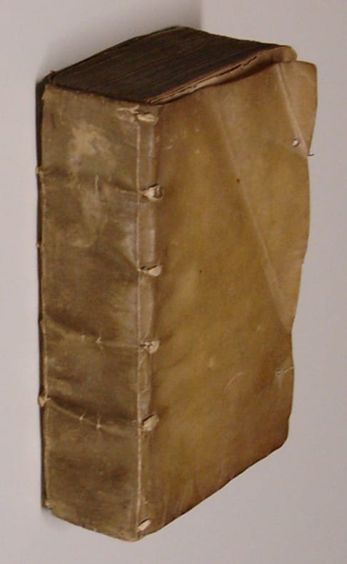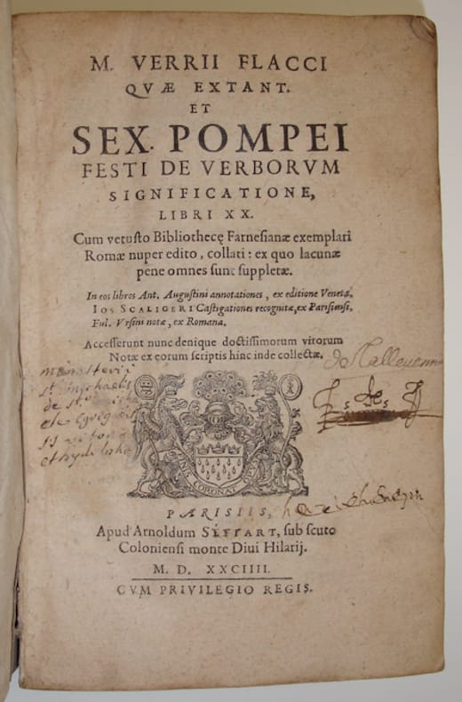 8vo (XXVIII),CCCIX,(1 blank),(22 index),(2 blank); LXXV,(1 blank),(10),CCXVI,(24 index),84 p. Limp vellum 17 cm (Ref: Smitskamp 61; Schweiger 2,355 & 1134; Brunet 5,2 1148; Renouard-1926, n° 1044 (Renouard et alii, 'Imprimeurs et libraires parisiens du XVIe siècle', Paris, 1964)) (Details: 5 thongs laced through the joints. Engraved printer's mark of Arnoldus Sittart on the title, his motto: 'Finis coronat opus', 'the end crowns the work'. (BaTyR : Base de Typographie de la Renaissance, no. 28409) The printer's mark shows the coat of arms of Cologne, the city where Arnoldus Sittart was born: the escutcheon bears 3 crowns and beneath them are twelve drops; the escutcheon is supported by a standing crowned griffin and idem lion; above the shield a helmet with peacock feathers as crest. (See for an explanation Wikipedia 'Kölner Wappen') (Condition: The vellum is probably recycled from another book; that is why the cover is wrinkled, dog-eared, slighlty soiled, and cut short. A small piece of the outer-edge of the backcover has gone. Three names and a small inscription on the title, 1 name has been erased. Partly slightly waterstained at the lower margin. Some hardly visible pinpoint wormholes near the right lower corner of one quarter of the book) (Note: Festus is a 2nd century grammarian, who produced an abbreviation of a lexicographic work by Marcus Verrius Flaccus, a wellknown antiquarian and grammarian living in Augustan Rome. Verrius compiled an enormous lexicon in 80 books, full of unusual, difficult, and archaic words, with discussions about customs, political institutions, beliefs and Roman law. Remains of his work survive in the epitome of 20 books made by Sextus Pompeius Festus. Festus also added examples found in other sources; an other epitome of this epitome of Festus was made in the 9th century by the historian Paulus Diaconus. The original work of Verrius is completely lost, and only 1 manuscript of Festus survived the Middle Ages in a heavily mutilated form. The first reliable text, which was a great improvement compared to earlier editions was published in 1559 by Antonio Agustin, 1517-1586, who made good use of the Farnese manuscript at Naples. He also added a commentary. It remained dominant for 2 centuries. Fulvius added in this edition suggestions concerning Greek material. J.J. Scaliger, 1540-1609, produced a highly acclaimed edition in 1575. He was praised for having successfully completed the gaps and damaged passages of the Farnese manuscript. Grafton says about this edition that 'fluency in conjecture and attention to detail could hardly be raised to a higher level'. (A. Grafton. Joseph Scaliger, a study in the history of classical scholarship, Oxf. 1983, vol. 1, p. 134/160) This edition of 1584 repeats Scaliger's of 1575. The text of Agustin is also printed, followed by 75 p. with his annotations, and followed by a 216 p. commentary by Scaliger; at the end we find the notes of Ursinus) (Collation: +6, *8, a-x8, A-V8, X2, 2A-2E8, 2F2) (Photographs on request)