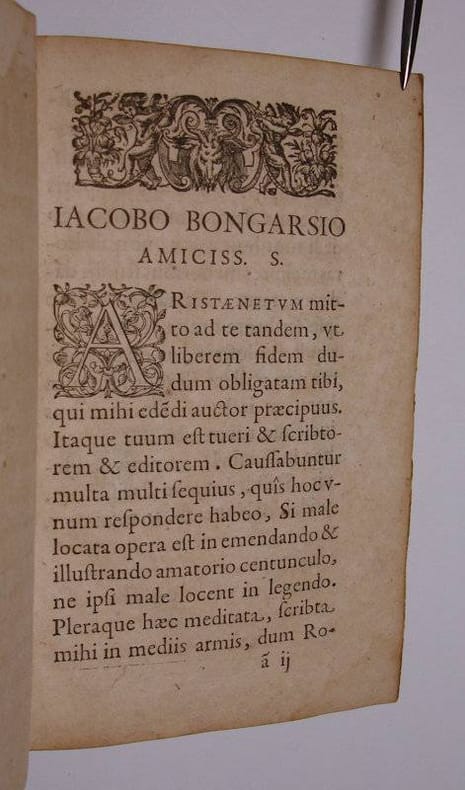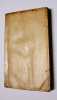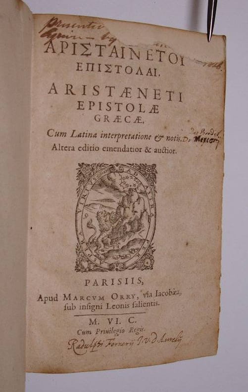 8vo. (VIII),282,(2 animadvertenda),(4 blank) p. Limp vellum 18 cm (Ref: Hoffmann 1,239; Graesse 1,204; Ebert 1065) (Details: Among bibliographers and librarians there is confusion about the date of this book. The date on the title of this second edition of the letters of Aristaenetus is indicated as MVIC. We found in KVK (Karlsruher Virtueller Katalog) records of this title dated 1594, 1596 and 1600. 1594 is definitely wrong, for the Parisian printer Orry published the first edition of this title in 1595, indicated by him as MDLXXXXV, and he repeated it the next year, now with MDXXXXVI. The third edition was published in 1610, with the date MCX. As the second edition cannot preceed the first edition of 1595 (and its repetition of 1596), this second edition comes between 1596 and 1610, so these very unusual Roman numerals MVID (1000, 6, 500) might well mean 1600. 2 thongs laced through the joints. The boards and the back have blind-tooled double fillet borders. All 3 edges gilt. On the title the printer's mark of Orry, depicting a jumping lion on his way to the top of a steep mountain, where a crown of stars awaits him; the motto is: 'Virtus ad astra per aspera'. Greek text with facing Latin translation) (Condition: Vellum age-tanned and slightly spotted. All 4 ties gone. 1 very tiny hole in the upper board. Small bookplate on the front pastedown. Inscription on the front flyleaf. Small strip of the upper margin of the title, with an owner's inscription, torn off, and repaired. Two other old owner's inscriptions on the title, and an owner once added in ink the name of the editor of Aristaenetus '(Josiae) Mercerii Des Bordes'. Lower margin stained in places. Some old annotations & underlinings. A small wormhole in the blank lower margin of the last gathering) (Note: Aristaenetus is the established name of the author of a collection of love letters in two books, probably from the beginning of the 6th century AD. It survives only in one Codex, of which the first folio with the name of the real author is lacking. Aristaenetus (Bestpraiseworthy) is only applied to the sender of the first letter. This is clearly a case of an imaginary letter-writer. The sources used are Plato, Menander, Lucianus, Alciphron, Philostratus, the ancient novels, and love elegies of Callimachus. Aristaenetus draws however in a conventional way a veil over too explicit love-making. The collection is a kind of survey of erotic motives in the literature of Greece and Rome. Everyting erotic however is covered with a veil of prudery. Aristaenetus ends after some cuddling before the bedroom is entered. (Neue Pauly, 1,1087) The collection was allready attributed to Aristaenetus in the 'editio princeps' of Antwerp 1566, edited by J. Sambucus. An (first) edition with a Latin translation was published in 1595 in Paris by Josias Mercier des Bordes. Sometimes this edition and the second edition of 1600 is erroneously attributed to the French scholar Jacques Bongars, 1554-1612. This cannot be correct, for the editor dedicates his Aristaenetus in the 'dedicatio', dated 1595, to Jacobus Bongarsius, whom he thanks for his great support. ('Aristaenetum mitto te tandem, ut liberem fidem dudum obligatam tibi, qui mihi edendi auctor praecipuus.' (p. â2 recto) Mercier was the first to observe that the first letter of the collection was imagined to have been written by one Aristaenetus, and that the collection belonged to the genre of imaginative epistolography. (See p. 198/99 of this edition of 1600) This book on offer is the second revised and augmented edition. Besides the text and translation it offers ca. 90 pages commentary. (Much more on this French calvinist nobleman and scholar, who died in 1626, in 'L'Histoire de La Norville' by l'abbé A.E. Genty (1885), online available at the 'Cercle Généalogique Norvillois')(Provenance: On the front pastedown the bookplate of the Dutch Jewish physican and famous bookcollector Bob Luza, 1893-1980, who survived Bergen-Belsen, and whose library was auctioned in 1981 by Van Gendt. Depicted is a book with the initials 'B.L.' on the upper board, together with the wellknown symbol of the rod of Asclepius, in the background a burning sun. (See for Luza, P.J. Buijnsters, 'Geschiedenis van de Nederlandse bibliofilie', Nijmegen 2010, p. 274-76) On the title the traces of a name at the upper edge. Below the imprint: 'Radulphi Fornerii J.U.D. Aurelii'. Raoul Fornier, or latinized Radulphus Fornerius, 1562-1627, sieur de Rondau, and 'Juris Utriusque Doctor' at Orléans, was like his father Guillielmus Fornerius, professor of law at the University of Orléans at the end of the 16th century. His best known work is 'Rerum quotidianarum libri sex. Quorum tres posteriores nunc primum in lucem prodeunt. In quibus plerique tum juris utriusque, tum variorum auctorum loci vel illustrantur, vel emendantur, multa etiam ad antiquitatis studium pertinentia tractantur. Auctore Radulpho Fornerio Gul. F. antecessore Aurelio'. It was first published in Paris in 1600. The 4th edition dates from 1644. This work is a proof of his excellent knowledge of Latin. He suggested a number of sound emendations and elucidated obscure passages) (Collation: a4; A-R8, S4, T4 (last 2 leaves blank) (Photographs on request)