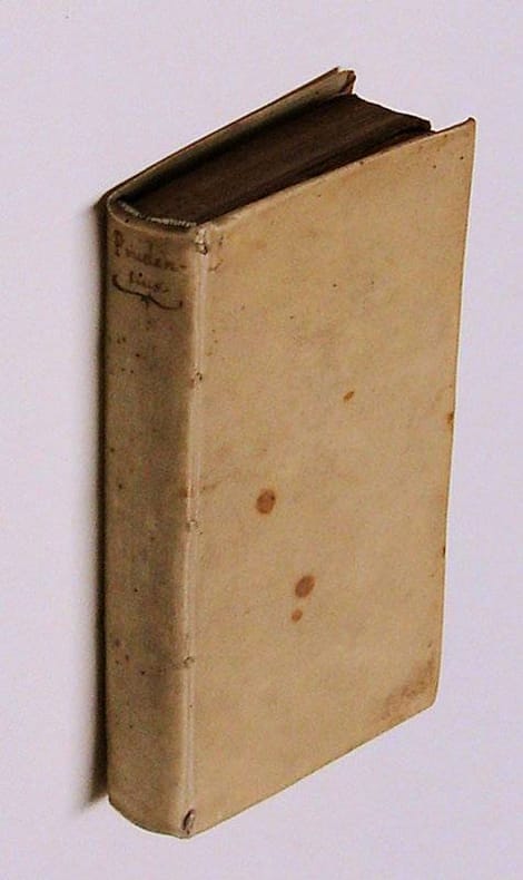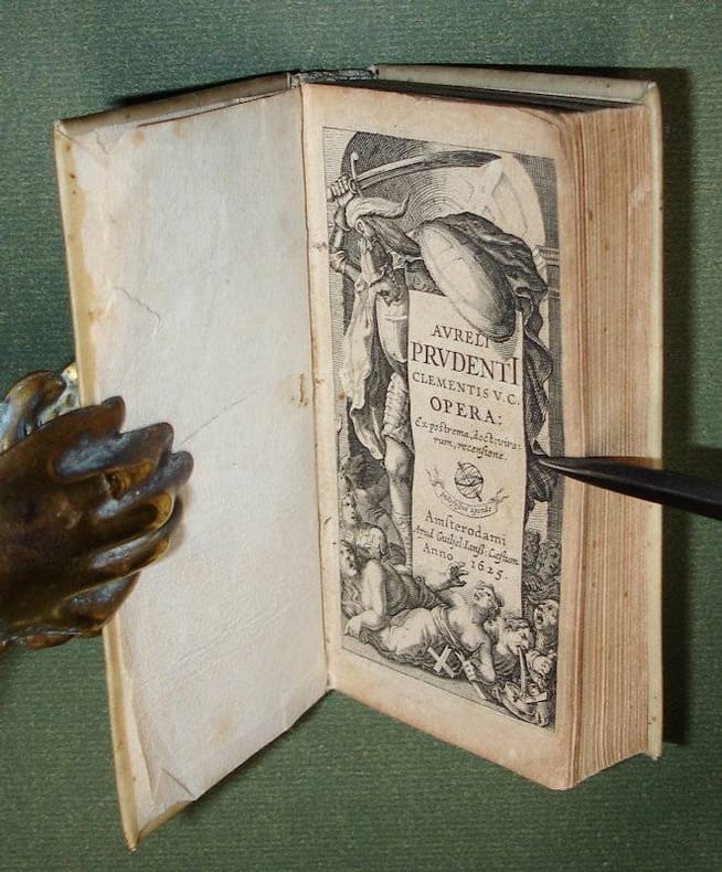 12mo. 261,(1 blank) p. Vellum. 11.1 cm Horatius Christianus (Details: 5 thongs laced through the joints. Engraved title, it depicts a huge Christian warrior who makes mincemeat of heathens and heretics. There in no introduction, only the text) (Condition: Some small spots on the boards. The edges of the front flyleaf are thumbed and show 2 tears. Upper edge of first leaves slightly thumbed. Very tiny hole in inner margin of the title) (Note: The Roman poet Aurelius Clemens Prudentius, born 348/49, died after 405 A.D., of Spanish origin, was besides a man of letters also an industrious public servant. He was a fervent Christian, who had not cut himself off from the culture of the ancient world. 'He regarded the pagan literature and art not as things to be rejected but as part of the inheritance into which Christian Rome enters'. ('Prudentius', ed. H.J. Thomson, Cambr. Mass., 2000, vol. 1 p. IX, (Loeb Classical Library)) 'It is as a poet in whom is embodied a reconciliation between the new faith and the old culture, and in whom Christian thought claims rank in the world of letters, that Prudentius is historically important'. (Op. cit. p. X) He 'was a pioneer in the creation of a Christian literature, and has the credit of originating new types of Christian poetry, the literary hymn, the moral allegory, and what has been called the Christian ballad'. (Op. cit. XII) His hymns are odes in which pagan mythology is replaced by stories from the Bible. By the great English scholar Richard Bentley he was described as 'Christianorum Maro et Flaccus'. 'Prudentius was much read in the Middle Ages. His influence is also visible in medieval art. More than 300 manuscripts survive. Allthough this edition of 1625 is not very rare, it is not to be found in the usual reference works, Schweiger, Dibdin, Moss, Graesse, Ebert, or Brunet) (Provenance: On the front flyleaf in old ink: 'A.E. Ihre') (Collation: A-Q8, R4 (minus leaf R4, R3 verso blank) (Photographs on request)