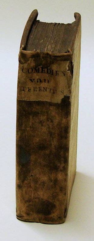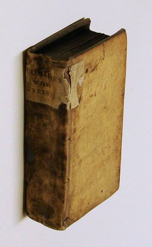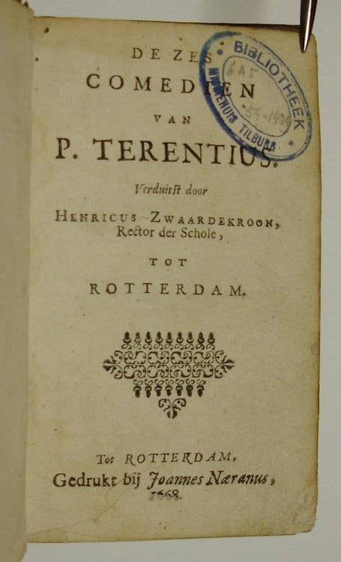 12mo. 498,(6 blank) p. Vellum 12.5 cm (Ref: Geerebaert 138,11,6; OiN 362) (Condition: Binding scuffed, spotted and soiled. Frontispiece removed. Oval stamp on the title. Some worming in the blank upper margin, occasionally nibbling at letters. Paper yellowing) (Note: The late antique grammarian Aelius Donatus (4th century A.D) wrote not only a commentary on the plays of the Roman playwright Publius Terentius Afer, ca. 190-159 B.C., but also a short biography, in which he tells that Terentius was born in the Roman province Africa and that he came as a slave in the houshold of the senator Terentius Lucanus. He adopted his name when he was manumitted. Terentius is the author of 'fabulae palliatae', which means 'plays in Greek cloths'. He adapted Greek plays, especially those of the Greek playwright Menander, to the taste of the Romans. Six of his comedies have survived. For later generations he became a model for elegant Latin. His style was closer to everyday conversation than Plautus', an earlier contemporary comic playwright, whose style was more extravagant. He was quoted by Cicero, Horace, Persius and the Church Fathers. Ever since antiquity he lived also a long and influential life in schools as a model for Latin language and rhetoric. In the Middle Ages he was read for his moral sentences. He was imitated by the German abbess Hrotsvitha of Gandersheim (ca. 935 - ca. 973) in her 'Dramenbuch', with which she wanted to create a Christian alternative for the pagan comedies. With the coming of humanism Terentius enjoyed a renaissance in the classroom and on stage. Scholars rejected the 'barbaries' of Medieval Latin and chose the elegance of Cicero and Terentius as their model. In his 'De ratione studii' (1511) the Dutch humanist Desiderius Erasmus, 1466-1536, encouraged the study of Terentius for his language and moral utility. 'Among Latin writers, who is more valuable as a standard of language than Terence? He is pure, concise, and closer to everyday speech and, by the very nature of his subject matter, is also congenial to youth'. (The Classical Tradition, 2010, p. 930) Erasmus published later in life, in 1532, an edition of Terentius' plays. Erasmus seems to have learned the whole of Terentius by heart in his youth. He admired the author for his 'latinitas' and his civilized humor. His ideal as a humanist and pedagogue was the creation of better men with the help of the classics. He held the opinion, that schoolboys should read Terentius over and over again. Thus they could master a pure Latin style, and learn at the same time good morals. Several Dutch humanists wrote 'Dialogi pueriles', fictitious dialogues to train schoolboys to converse in Latin; conversations which much Terentius in it. The first Dutch translation of Terentius appeared in 1555 in Antwerp. Almost one century later 2 other new translation followed. In 1646 the remonstrant reverent Henricus Oosterhaern published a prose translation in Rotterdam. His translation is as literal as possible. His aim in didactic. He hopes that his readers will polish their speech and style when reading Terentius, that they will learn from Terentius a 'suyvere en cierlijke manier van spreken en schryven'. (P.J.M. van Alphen, Nederlandse Terentius-vertalingen in de 16e en 17e eeuw, Tilburg 1954, p. 95) Two years later, in 1648, Rotterdam saw the next and more elegant prose translation, now by another remonstrant, the schoolmaster Henricus Zwaerdecroon, since 1634 Rector of the 'Schola Latina Erasmiana'. (NNBW 5.1182/83) In the dedication in this edition to his 'alumnus' Adrianus de Matenesse, Zwaerdecroon dwells on the diligence and enthousiasm he and other old schoolboys displayed while reading Terentius. On their request, Zwaerdecroon tells us, and because they are leaving for the university he made this translation. Sometimes we find in the Dutch translation words or passages printed in italics. Those words and passages have been added to improve the Dutch, and to explain matters. The edifying comedies of Terence were not only read by schoolboys. The Dutch philosopher Spinoza must also have studied his Terentius very thoroughly. In his work hundreds of quotations and borrowings from Terence can be traced. Spinoza used them to define and illustrate human feelings, weaknesses and passions. (F. Akkerman, Spinoza's tekort aan woorden, Leiden, 1977, p. 3) In the same year as this edition (1648) the Rotterdam printer Naeranus brought a translation only edition on the market. This translation was reissued again in 1668, this edition) (Provenance: Stamp on the title: 'Bibliotheek Missiehuis Tilburg) (Collation: A-X12 (leaves X10, X11 & X12 blank. leaf A2, the frontispiece, gone) (Photographs on request)