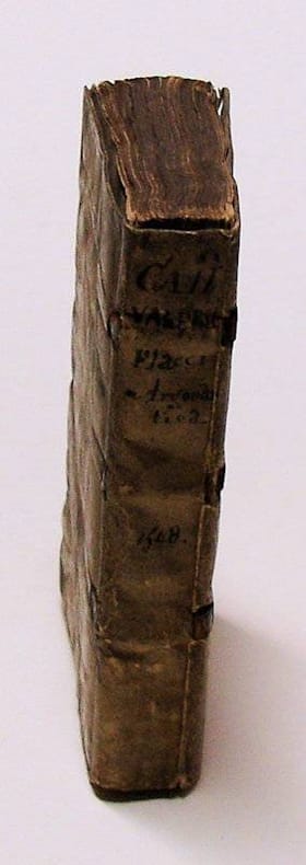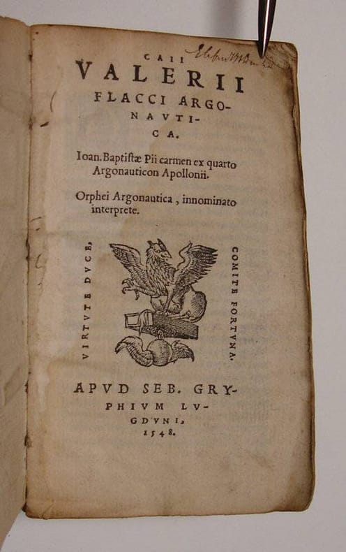 16mo. 308,(1 colophon),(1 blank) p. Limp vellum 11.5 cm (Ref: USTC 149936; Schweiger 2,1099, incorrect (See note): 'Nachdruck der Strassb. Ausg. Die Vorrede der Aldine u. die des Engentinus sind mit abgedr.'; Graesse 6/2 241; Ebert 23289; cf. Brunet 5,1045) (Details: Printed completely in italics. On the title the printer's mark of Sebastianus Gryphius, depicting a griffin, which mythological animal symbolizes courage, diligence, watchfulness, and rapidity of execution, used as a pun of his family name Gryph or Greif. From the claws of this creature hangs a big rectangular stone, symbolizing Constancy, beneath which hangs a winged globe, symbolizing Fortune. The motto is 'Virtute duce / comite fortuna', 'Virtue thy leader, fortune thy comrade', a quote from a letter of Cicero to Plancus (Epistulae ad Familiares, liber X,3)) (Condition: Vellum soiled and wrinkled. All four textile fastening ties gone. Both pastedowns damaged and detached. Front hinge partly loosening, but holding. Front flyleaf removed. Faint dampstain in the first 5 quires. Some small old ink annotations. Right upper corner of leaf d3 (p. 53/4) torn off without loss of text. Corners slightly bruised) (Note: The bibliographies of Schweiger, Ebert and Graesse state that this 'Argonautica' edition of 1548, published by Sebastianus Gryphius, is a reissue of the Valerius Flaccus edition of 1525, edited in Strassburg by Philippus Engentinus. This is not correct. In the first place, this Gryphius has exactly the same title as the Aldus edition of 1523, which was produced by the Italian humanist scholar Giovan Battista Pio, latinized as Ioannes Baptista Pius. It contains also the same text, that is, the preliminary pages, the 'Argonautica' of Valerius Flaccus book I-VIII verse 467, and also a continuation of book VIII, taken from Apollonius Rhodius' earlier Greek version of the 'Argonautica', translated into Latin by Ioannes Pius. At the end we find a Latin translation of an unknown hand of the 'Orphei Argonautica'. Pius' continuation of Book VIII to X starts where a premature death overtook Valerius Flaccus, and prevented him to finish the epic. The poem breaks off abruptly with the pursuit of the Argo by Absyrtus, brother of Medea. This continuation is repeated in our Gryphius edition of 1548, but is absent in the Strassburg edition of Engentius, as are the preliminary pages. Furthermore, the Strassburg edition ends at verse 466 of book VIII: 'Temptat & ipse gemens, & tempora currere dictis. FINIS'. This line is the last but one in The Gryphius and Aldus edition, in both the last verse is (467): 'mene aliquid metuisse putas? me talia velle?' The bibliographers were probably mislead by the adoption at the end by Gryphius of the dedication of Philippus Engentinus, dated 1525, from his Strassburg edition. Not much is known about the Roman poet Valerius Flaccus, who wrote an epic 'Argonautica', and who died in 92 or 93 A.D. It is agreed by 'practically all modern authorities that the 'Argonautica' was never completed, and that its imperfect conclusion must not be put down to mutilation of a manuscript or omission to complete a copy. There is plenty of internal evidence of unrevised work, both in the language and the details of the plot and incidents. As to the former, there are many passages where it is necessary to mark a lacuna or to supply a line to complete the sense'. (Valerius Flaccus, with an English translation by J.H. Mozley, Cambr. Mass., 1972, p. VIII) As all the poets of his time Valerius Flaccus was strongly influenced by Vergil, but he 'is a better poet than they, in so far he is less excessively rhetorical than Lucan, and a more original genius than Statius'. (OCD 2nd ed. p. 1105) His 'Argonautica' is indebted to the 'Argonautica' of the Greek poet Apollonius Rhodius, who flourished ca. 200 B.C., but it is certainly not a close imitation. The differences are in the portrayal of the characters and the incidents in the story. 'The 'Orphei Argonautica' (Orphic Argonautica) was once believed to be among the oldest Greek poems, but today it is known that the poem is the work of a late Antique author working in the fourth century CE or later and writing in a form of Greek that consciously imitated (often wrongly) the diction and vocabulary of Homer. The poem of 1,376 hexameter verses takes the form of a first-person account of the Argonauts' voyage from the mouth of Orpheus, who views himself as the hero, addressing the poem to his disciple Musaeus. The poem (...) found fame in the early modern period along with other Orphic poetry as a prefiguration or distortion of Biblical truths'. (The Orphic Argonautica, translated by Jason Colavito) (Collation: a-t8, u4 (minus blank leaf u4; u3 verso blank) (Photographs on request)