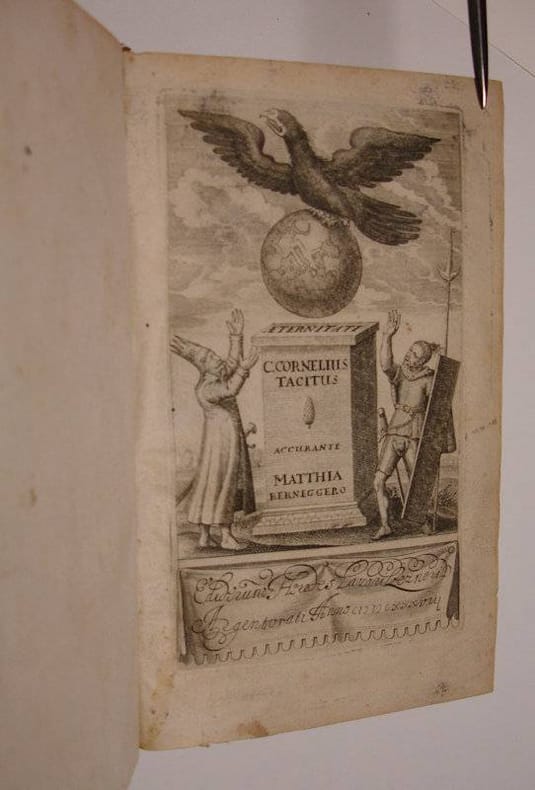 8vo. (XVIII,1122,(2 blank)) p. Overlapping vellum 17 cm (Ref: VD17 547:695101K; Schweiger 2,1002; Dibdin 2,452; Moss 2,643; Graesse 6/2 9; Fabricius/Ernesti 2,398) (Details: 6 thongs laced through the joints. Engraved title, depicting an altar, left of which stands a Roman emperor, right a German warrior; on the surface of the altar the text 'Aeternitati', for Eternity; just above the altar hangs the globe, upon which stands an eagle with spread wings. This scene seems a combination of two Roman coins. It was perhaps made after the verso side of a coin struck by Constantine the Great in Trier in 321 A.D.; on this coin there is however no eagle; a scene consisting of a globe on which an eagle stands, is to be seen on a denarius of Caracalla, struck after 217 A.D. This frontispiece is purely propagandistic in its presentation. It depicts not so much the struggle between the Romans and the German tribes, that Tacitus tells about. It rather symbolizes the claim of the Holy Roman Empire (Sacrum Romanum Imperium, Heiliges Römisches Reich), that it was the legitimate successor 'for eternity' of the Roman Empire. The imperial banner of the Holy Roman Empire depicted a black eagle) (Condition: Vellum age-tanned and slightly worn & spotted. Head of the spine chafed. Front & rear joint starting to split for 1 cm. Some old ink underlinings. Paper browning. Bookplate on the front pastdown) (Note: The Roman historian Publius Cornelius Tacitus offered ammunition for many intellectual and political battles in 16th and 17th century Europe. The turmoil caused by the emerging new monarchies in England, France en Spain, civil and religious wars in Italy and Germany, and the plague, made Tacitus' account of the state of the early Roman Empire increasingly topical and relevant. The debate Tacitus provoked in intellectual circles was of course on Roman history, but also on literary style, in Latin and the vernacular, but more so on historical and political thought. Tacitus ideas were not original, but he brought them in a forceful lapidary way, oneliners ready for the use in debate. Tacitus became in a corrupted world 'the one true guide for those involved in the awful revolution of modern times: he "teaches well the mode of life under tyrants, just as he teaches tyrants how to establish tyranny'' '. (The Classical Tradition, Cambr. Mass., 2010, p. 921) The French humanist scholar Muretus (Marc Antoine Muret, 1526-1585) declared that 'Tacitus' descriptions of lost liberty, failed revolutions, vicious civil wars, and mad emperors amounted to a theater of our time'. (Op. cit., ibid.) The editor of this Tacitus edition, the German classical scholar Matthias Bernegger, 1582-1640, was the founder of the School of Roman history at Strassburg, where a protestant university was founded in 1621. The model of this school was the Flemish editor of Tacitus, Justus Lipsius, 1547-1606, who was one of the most learned men of his day. His great Tacitus editions placed and still places Lipsius in the front rank of classical scholarship. Our Tacitus edition of 1664 is an exact reissue of Bernegger's Tacitus, that was first published in in Strassburg in 1638. It includes 'many excellent notes and emendations due to his pupil and son-in-law Johannes Casper Freinsheim (1608-1660), the foremost representative of this school'. (Sandys,J.E., 'A History of Classical Scholarship', N.Y., 1964, p. 367) The edition offers also a 144 page treatise 'Ioannis Freinshemii expositio locorum cornelianorum intactorum interpretibus, aut secus acceptorum' and an elaborate and exemplary 272 page 'Index in Tacitum confectus industria et labore Melchiore Freinshemii'. Lipsius praised Tacitus as a teacher of vital political lessons. In his Politica (Politicorum sive Civilis doctrinae libri sex, 1589) 'a brilliant textbook in mosaic form, composed of passages from the ancients, far more of them taken from Tacitus than from any other source - Lipsius showed how to make a version of Tacitus' analysis of empire fit the practical needs of the modern governing classes'. (The Classical Tradition, Cambr. Mass., 2010, p. 921) Bernegger, professor of History, from 1613 till his death in 1640, produced a revised and augmented edition of Lipsius' Politica, which was published posthumously in Strassburg in 1642. It saw several reissues in that city and in Frankfurt. Bernegger was from his appointment in Strassburg in 1613 the starting point of the so-called Lipsian tradition, an historic-political school of thought in late humanist philology, which exercised well into the 18th century influence on the German protestant universities of Jena, Altorf, Marburg and Strassburg ('Justus Lipsius, Politica: Six Books of Politics Or Political Instruction', Edited with translation and introduction by J. Waszink, Assen 2004, p. 194/95) Bernegger lectured on Lipsius' Politica, and like Lipsius he considered Tacitus' view on politics the best guiding principle leading to 'prudentia' in the turmoil of his time.) (Provenance: Bookplate: 'Bibliothek Oberherrlingen, E.M. 1839'. Eugen von Maucler, 1783-1859, was a German politician and bibliophile. His library was located at 'Schloss Oberherrlingen' near Ulm; see for Eugen von Maucler, his library, a portrait, and a picture of the bookplate: Wikipaedia)(Collation: a8 (minus leaf a8), b2; A-4A8, 4B2 (leaf 4B2 blank)) (Photographs on request)