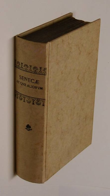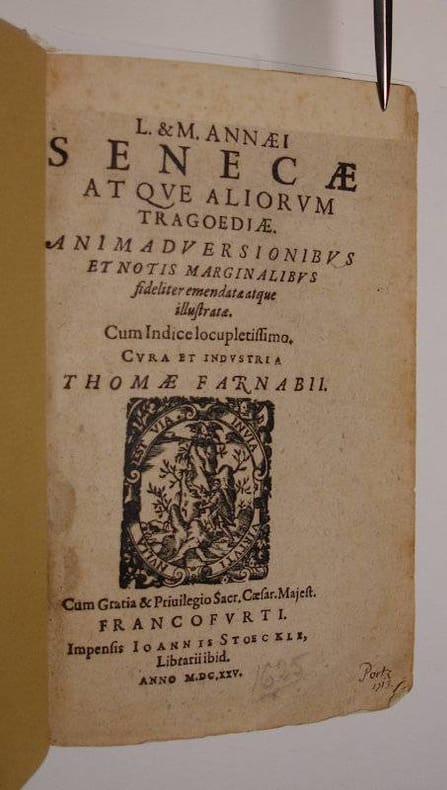 8vo. (XVI),481,(3),(58 index) p. Modern hardback 17 cm (Ref: VD17 23:284078M; Schweiger 2, 939/40; Graesse 6/1, 358/59; Ebert 20934; cf. Brunet 5,286) (Details: Second half 20th century binding. Woodcut printer's mark on the title, depicting a man climbing a steep rock, on top of which sits an eagle on a nest; the motto: 'Nulla est via invia virtuti') (Condition: Title slightly soiled. Small name on the title. The blank upper margin of the title has been cut off and repaired with a strip of paper. Paper yellowing) (Note: The English classical scholar Thomas Farnaby, latinized as Thomas Farnabius, ca. 1575-1647, explains in the short preface to this edition that he attributes, following Lipsius, Delrio, J. Scaliger and D. Heinsius, the Medea, Troades and the Phaedra to the Roman author/philosopher Lucius Annaeus Seneca Philosophus, the Hercules Oetaeus to quispiam poetaster, and the Octavia to a nec felicior artifex. The other plays, the Hercules Furens, Phoenissae, Oedipus, Agamemnon and the Thysestes he attributes to one Marcus Seneca Tragicus. Nowadays these plays are attributed to Lucius Annaeus Seneca; the Octavia is certainly spurious, and of the Hercules Oetaeus it is acknowledged that the language and metre resemble Seneca's. There is 'widespread agreement that Seneca's tragedies are important dramas and that the question whether they were composed for recitation or for performance is largely irrelevant. (...) Modern opinion is divided over the extent of Stoic doctrine in them; the majority incline toward judging them solely as dramas. Knowledge of the tragedies was spotty in late antiquity; (...). The earliest complete manuscript is the Codex Etruscus from Italy in the 11th century. It was read by Poliziano and was the basis of the edition of J.F. Gronovius (Amsterdam 1661), the first reliable printed text. (...) Seneca was by far the most important classical model for Renaissance tragedy, at a time when Greek tragedy was hardly known. (...) There is philosophical reflection, especially in the choruses, but that is not their main purpose, and there is psychological subtlety, despite the rhetoric. (...) Julius Caesar Scaliger in his Poetices maintained that Seneca surpassed the Greek tragedians in dignity (maiestas) and had greater polish and brilliance (cultus ac nitor) than Euripides. (The Classical Tradition, Cambridge Mass., 2010, p. 876) The greatest scholarly achievement of Thomas Farnaby were his editions of classical Roman poets and playwrights, accompanied by thorough Latin notes, such as Juvenal (1612), the tragedies of Seneca (1613), Martialis (1615), Lucanus (1618), Vergil (1634), Ovid's Metamorphoses (1636), Terentius (1651) 'As a school teacher, a rhetorical theorist and an editor of classical texts, Farnaby was one of the most influential scholars of the early seventeenth century. His schoolbooks on rhetoric were highly popular in the schoolroom, he collaborated and corresponded with some of the most distinguished continental scholars of his day, and his editions contributed greatly to the development of early modern textual criticism'. (DBC 1,308/9) Farnaby's edition of Seneca's tragedies, which was first published in London in 1613, was reissued several times, in Amsterdam in 1633, 1656 and 1678) (Provenance: On the title the name: 'Portz, 1713'. On the front flyleaf the name of 'Lennart Hakanson', 1939-1987, professor of Latin at the university of Uppsala) (Collation: ):(8, A-2L8 (minus blank leaf 2L8) (Photographs on request)