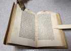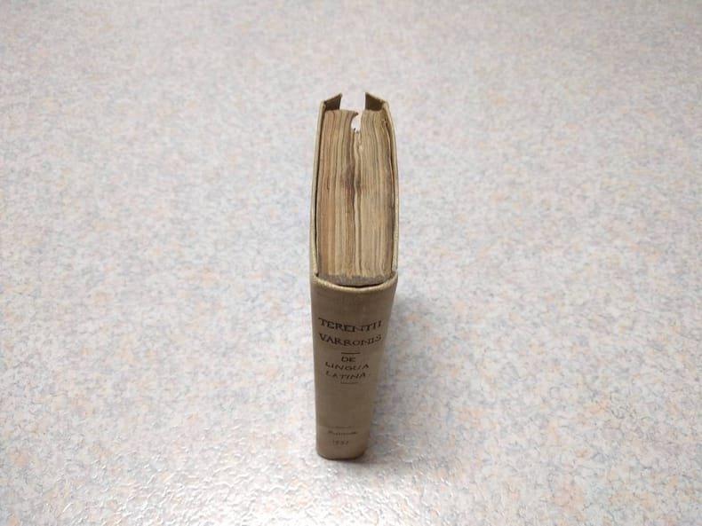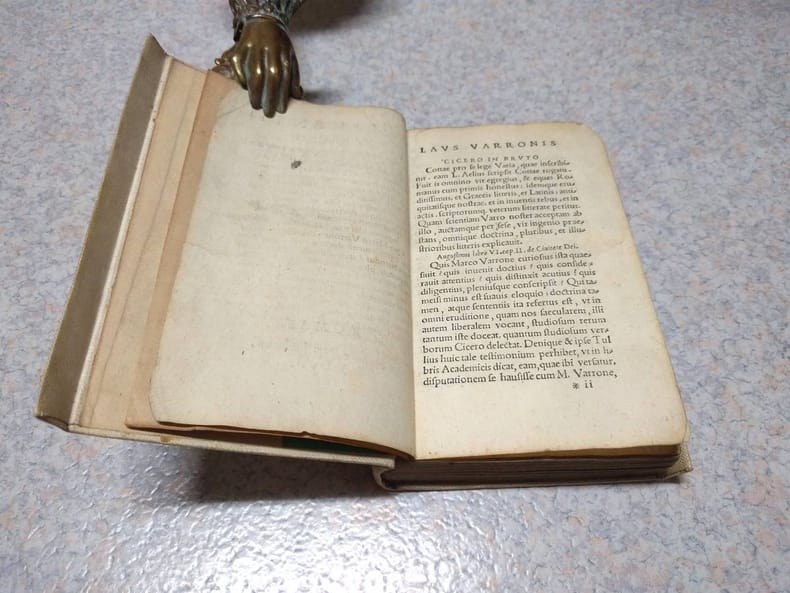 8vo. (XXIV),211,(1 blank),(43 index),(1 blank),(99 index),(1 blank) p. Modern cloth 17 cm (Ref: EDIT16 CNCE 35852; Schweiger 2,1118; Brunet 5,1092; Graesse 6/2, 263; Ebert 23393) (Details: A vellum look-a-like cloth binding from ca. 1900. See for this date the provenance below) (Condition: Binding somewhat soiled. Both flyleaves browning. Title and last page dust-soiled. Small piece of the right upper corner of the first 2 leaves worn away. Blank right upper corner of 88 pages, somewhere in the middle of the book, cut off. Some foxing. A few allmost invisible pinpoint wormholes at the right edge of the first half. Some wormholes in the margin of 50 pages of the index, sometimes nibbling at a few letters) (Note: The Roman Encyclopaedist Marcus Terentius Varro, 116-27 B.C., was a landowner on a large scale, and member of the senatorial class. Though the bulk of his works are lost, he is considered to be the greatest scholar ancient Rome produced. His writings cover nearly every domain of science, except mathematics. 'A remarkable fact is that he was not a dry pedant, but one whose works included witty and lively sketches of life, side by side with long and very erudite treatises'. (H.J. Rose, 'A handbook of Latin Literature', London 1967 p. 220) The 'de re rustica' is his only complete work that is preserved. Of the 'de lingua latina' (on the latin language), Varro's principle work in 24 books on language, only 6 books remain fairly complete, the books 5 to 10. Book 1 was the introduction, 2/4 were on etymology in general, 5/7 on the etymologies of particular classes of words. 'It hardly need be said that Varro does not group them as a modern philologist would, and has no idea of the immutable or nearly immutable phonetic laws which govern the development of speech'. (Op. cit. p. 222) Books 8/12, are on declension (declinatio), including the additions of suffixes and the like. Books 12/24 were on syntax. The style is plain, but with 'all its faults and its incompleteness, however, the work is of much importance in the history of linguistic study'. (Op.cit., ibid.) 'De lingua latina' is a work of great importance in the history of linguistic studies. During the Renaissance a renewal of interest in Latin grammar occurred. Medieval vocabulary and terminology, and sloppy grammar were rejected, and the primary of the Latin of the classical period was reasserted. This process was stimulated by the gradual rediscovery of previously unknown texts of classical authors, among which Varro's de lingua Latina was one of the most important. The printed text of de lingua latina is based on an 11th century manuscript Florentinus F, and was first published in 1471. The Spanish humanist Antonio Agustín Albanell, 1517 - 1586, latinized as Antonius Augustinus, is now remembered as the first canon law historian, and not as a classical scholar. This edition of 1557 of 'de lingua latina' of Varro is a reissue of an edition which was first published in Rome in 1554. In it Agustín followed 'the interpolated manuscripts and banished every archaism from the text, a process that met with protest from Turnebus and Scaliger'. (E.J. Sandys, A history of Classical Scholarship, N.Y., 1964, 2,160) This edition, notwithstanding the criticism of both great scholars, remained the standard text till that of Spengel of 1826. Agustín lists on p. 1 the names of the scholars who contributed 'emendationes' to his edition: Pomponius Laetus, Angelus Tifernas, Fran. Rolandellus, Aldus Manutius, Michael Bentinus, Angelus Colotius, Octavius Pantagathus, Petrus Victorius, Ant. Augustinus, Gabriel Faernus) (Provenance: Small green booklabel pasted on the front pastedown of 'George Gregory, Bookseller to H.M. Queen Alexandra, Bath'. George Gregory lives on in the name of the antique prints department, the George Gregory Gallery, of the British antiquarian bookseller George Bayntun. Bayntun tells on his website that George Gregory established his bookshop in Bath in 1846 and proudly proclaimed it to be 'The Worlds Book Store'. He held the Royal Warrant as Bookseller to Queen Alexandra, and was President of the Antiquarian Booksellers Association from 1915 to 1918. George Bayntun and W.J. Crudgington bought the business in 1924 and moved into new premises in Green Street, Bath. This book was sold by Gregory, so its binding must be older than 1924, or more probable 1918. This edition must be rare, the last recorded copy in 'Rare Books Hub, formerly the Americana Exchange' dates from 1964) (Collation: *-2*8, A-M8, N6; O-P8, Q6 (leaf Q6 verso blank); Aa-Ff8, Gg2 (leaf Gg2 verso blank) (Photographs on request)