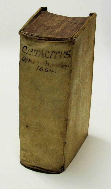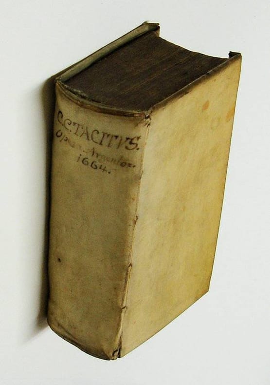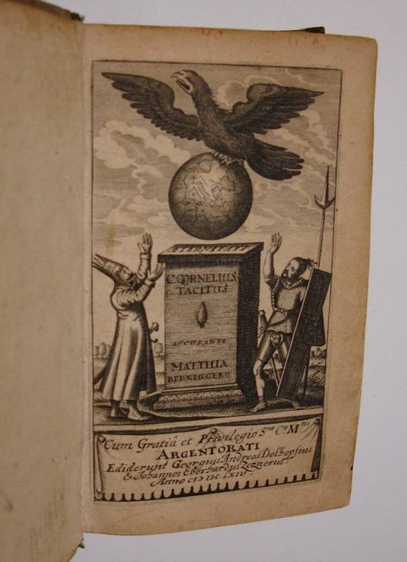 8vo. (XVIII,1122,(2 blank)) p. Overlapping vellum 17 cm (Ref: VD17 547:695101K; Schweiger 2,1002; Dibdin 2,452; Moss 2,643; Graesse 6/2 9; Fabricius/Ernesti 2,398) (Details: 6 thongs laced through the joints. Engraved title, depicting an altar, left of which stands a Roman emperor, right a German warrior; on the surface of the altar the text 'Aeternitati', for Eternity; just above the altar hangs the globe, upon which stands an eagle with spread wings. This scene seems a combination of two Roman coins. It was perhaps made after the verso side of a coin struck by Constantine the Great in Trier in 321 A.D.; on this coin there is however no eagle; a scene consisting of a globe on which an eagle stands, is to be seen on a denarius of Caracalla, struck after 217 A.D. This frontispiece is purely propagandistic in its presentation. It depicts not so much the struggle between the Romans and the German tribes, that Tacitus tells about. It rather symbolizes the claim of the Holy Roman Empire (Sacrum Romanum Imperium, Heiliges Römisches Reich), that it was the legitimate successor 'for eternity' of the Roman Empire. The imperial banner of the Holy Roman Empire depicted a black eagle) (Condition: Vellum age-tanned and slightly worn & spotted. Head of the spine chafed. Front & rear joint starting to split for 1 cm. Some old ink underlinings. Paper browning. Bookplate on the front pastdown) (Note: The Roman historian Publius Cornelius Tacitus offered ammunition for many intellectual and political battles in 16th and 17th century Europe. The turmoil caused by the emerging new monarchies in England, France en Spain, civil and religious wars in Italy and Germany, and the plague, made Tacitus' account of the state of the early Roman Empire increasingly topical and relevant. The debate Tacitus provoked in intellectual circles was of course on Roman history, but also on literary style, in Latin and the vernacular, but more so on historical and political thought. Tacitus ideas were not original, but he brought them in a forceful lapidary way, oneliners ready for the use in debate. Tacitus became in a corrupted world 'the one true guide for those involved in the awful revolution of modern times: he "teaches well the mode of life under tyrants, just as he teaches tyrants how to establish tyranny'' '. (The Classical Tradition, Cambr. Mass., 2010, p. 921) The French humanist scholar Muretus (Marc Antoine Muret, 1526-1585) declared that 'Tacitus' descriptions of lost liberty, failed revolutions, vicious civil wars, and mad emperors amounted to a theater of our time'. (Op. cit., ibid.) The editor of this Tacitus edition, the German classical scholar Matthias Bernegger, 1582-1640, was the founder of the School of Roman history at Strassburg, where a protestant university was founded in 1621. The model of this school was the Flemish editor of Tacitus, Justus Lipsius, 1547-1606, who was one of the most learned men of his day. His great Tacitus editions placed and still places Lipsius in the front rank of classical scholarship. Our Tacitus edition of 1664 is an exact reissue of Bernegger's Tacitus, that was first published in in Strassburg in 1638. It includes 'many excellent notes and emendations due to his pupil and son-in-law Johannes Casper Freinsheim (1608-1660), the foremost representative of this school'. (Sandys,J.E., 'A History of Classical Scholarship', N.Y., 1964, p. 367) The edition offers also a 144 page treatise 'Ioannis Freinshemii expositio locorum cornelianorum intactorum interpretibus, aut secus acceptorum' and an elaborate and exemplary 272 page 'Index in Tacitum confectus industria et labore Melchiore Freinshemii'. Lipsius praised Tacitus as a teacher of vital political lessons. In his Politica (Politicorum sive Civilis doctrinae libri sex, 1589) 'a brilliant textbook in mosaic form, composed of passages from the ancients, far more of them taken from Tacitus than from any other source - Lipsius showed how to make a version of Tacitus' analysis of empire fit the practical needs of the modern governing classes'. (The Classical Tradition, Cambr. Mass., 2010, p. 921) Bernegger, professor of History, from 1613 till his death in 1640, produced a revised and augmented edition of Lipsius' Politica, which was published posthumously in Strassburg in 1642. It saw several reissues in that city and in Frankfurt. Bernegger was from his appointment in Strassburg in 1613 the starting point of the so-called Lipsian tradition, an historic-political school of thought in late humanist philology, which exercised well into the 18th century influence on the German protestant universities of Jena, Altorf, Marburg and Strassburg ('Justus Lipsius, Politica: Six Books of Politics Or Political Instruction', Edited with translation and introduction by J. Waszink, Assen 2004, p. 194/95) Bernegger lectured on Lipsius' Politica, and like Lipsius he considered Tacitus' view on politics the best guiding principle leading to 'prudentia' in the turmoil of his time.) (Provenance: Bookplate: 'Bibliothek Oberherrlingen, E.M. 1839'. Eugen von Maucler, 1783-1859, was a German politician and bibliophile. His library was located at 'Schloss Oberherrlingen' near Ulm; see for Eugen von Maucler, his library, a portrait, and a picture of the bookplate: Wikipaedia)(Collation: a8 (minus leaf a8), b2; A-4A8, 4B2 (leaf 4B2 blank)) (Photographs on request)