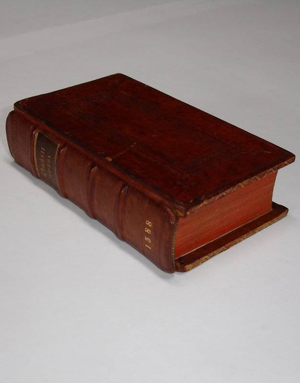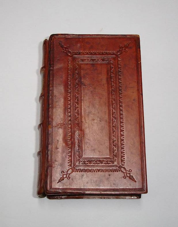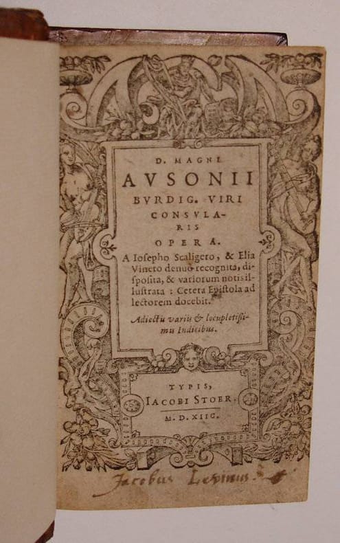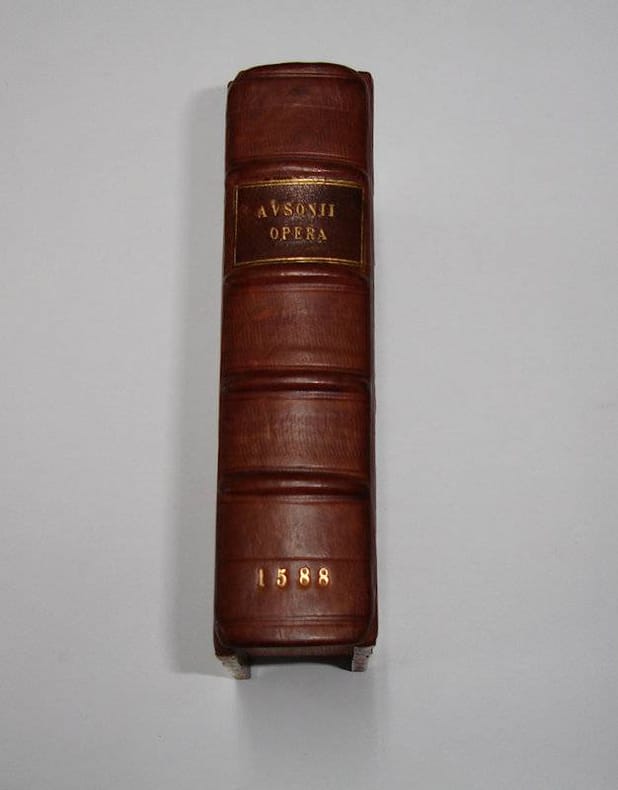 16mo. 2 volumes in 1: (XXXII),350;247,(1 blank),(14 indices) p. 18th century calf, back recently and decently restored. 13 cm (Ref: GLN-3290; Schweiger 21; Graesse I,259; Smitskamp p. 118) (Details: Back with 4 raised bands, recently and expertly restored. Morocco shield with gilt lettering in second compartment. Boards with blind triple fillet borders. Elaborately blind tooled rectangles on both boards. Edges of the boards gilt, edges of the bookblock dyed red. Title within woodcut borders, right edge of the title slightly cut short. The second volume has a title of its own, it contains 'Iosephi Scaligeri Iul. Caes. F. Ausonianarum lectionum libri duo', to which have been added notes of A. Turnebus, Hardianus Junius, G. Canter, J. Lipsius & E. Vinetus) (Condition: Endpapers renewed. First title slightly soiled and having a name on it) (Note: Decimus Magnus Ausonius of Burdigala (Bordeaux), ca. 310-394, was according to H.J. Rose an example of the senile degeneration of 4th century Latin literature, and the first glimmer heralding the full day of French literature. He wrote trifles, sometimes pretty or clever, often tiresome. (H.J. Rose, 'A History of Latin Literature', London 1967, p. 527/29). H.G. Evelyn White, the editor of the Loeb edition, is even more negative: 'As poetry (...) the great mass of his verse is negligible'. The chief value of Ausonius' work is according to him historical. (Loeb Classical Library, Ausonius, Cambr. Mass., 1919. p. VII) The 'Neue Pauly' is more positive: 'Ausonius repräsentiert eine Kultur der Bewahrung und des Erbes. Allenthalben greift er auf die griech. und lat. Lit. zurück, über die er souverän verfügt, und gestaltet anspielungs- und voraussetzungsreiche pretiöse Gebilde von formalem Raffinement'. (Der Neue Pauly, 2,334) Alexander Souter is in the Oxford Classical Dictionary full of praise: 'His numerous poems, written in various metres (...) are of considerable interest, in both subject-matter and style. There are over a hundred epigrams, some of which are in Greek and others translated from Greek. There are 25 letters. His correspondence with Paulinus of Nola is the most notable part of these. The Ephemeris includes many poems in various metres, dealing with daily life. The Parentalia is a collection of short poems in memory of deceased relatives of the poet. The Commemoratio Professorum Burdigalensium is of interest for the history of education. (...) This account by no means exhausts the list of minor poems, throughout which the author's minute knowledge of Virgil is apparant and his Christian faith is not obtruded. His most important poem is the Mosella which still attracts readers. It is a rhetorically fashioned laudatio in 483 hexameters and describes in considerable detail the various fish to be found in the river as well as some of the fine buildings on the banks and other features, the whole constituting a series of episodes, composed, like the rest of Ausonius' verse, according to rule'. (OCD 2nd ed. p. 154) The 2 French scholars mentioned on the title, Joseph Juste Scaliger,1540-1609, and Elie Vinet, or Elias Vinetus, 1509-1587, had probably nothing to do with the editing of this new Ausonius edition of 1588. It was produced, according to the very short preface, by the jurist P.B. Cestius I.C, or Petrus Baudoza Cestius, 1557-1627. It is further explained that it is based on the earlier edition of Scaliger, Antwerp 1575, with corrections of typographical errors. Vinetus had published an edition with his commentary in 1580) (Provenance: Name on title: 'Jacobus Levinus'. At the end of volume 1 written: 'John Rocherus, 1794') (Collation: -8 a-y8 (minus blank leaf y8); A-Q8, R4 (minus last blank leaf R4) (Photographs on request)