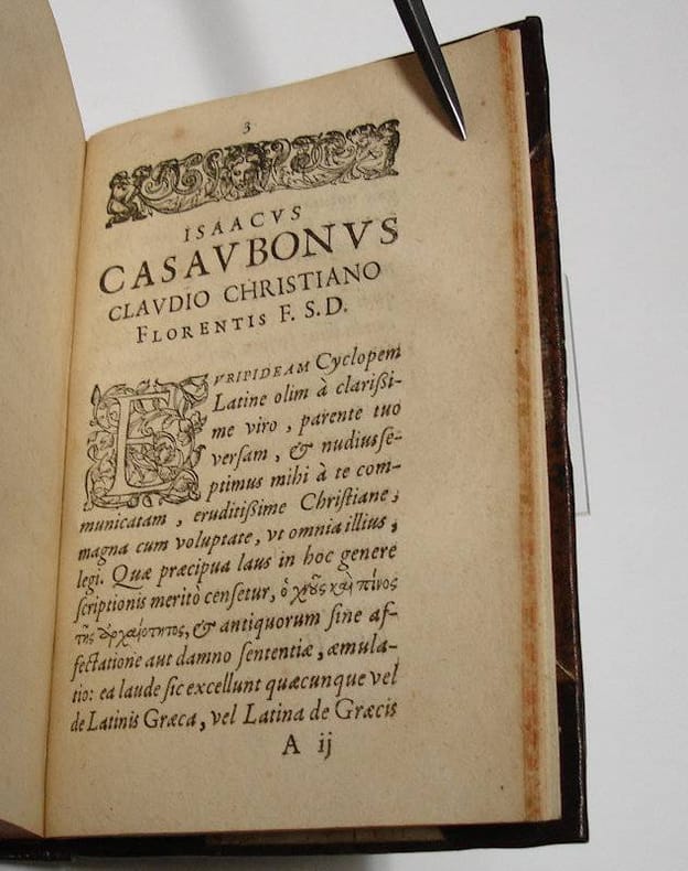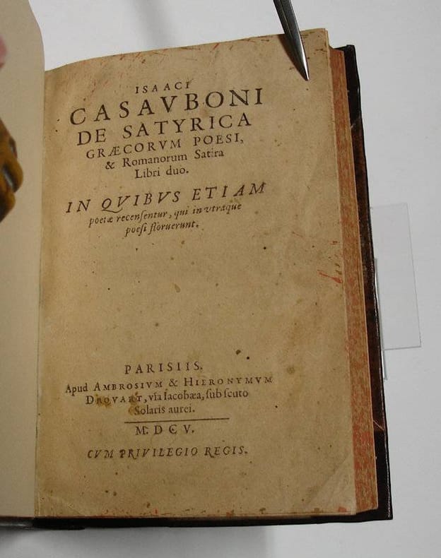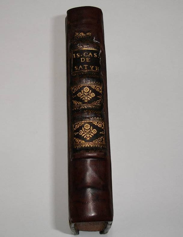 8vo. (XVI),356,(2 addenda),(2 blank),38,(2 blank) p., 1 text engraving. Restored full calf 17 'Casaubon produced the first critical survey of literary history in his 'De Satyra Graecorum Poesi & Romanorum Satira', which has gone through many editions and can fairly be called a model of its kind'. (Wilamowitz) (Ref: Brunet 1,1613/14; Ebert 3628) (Details: Binding tastefully and expertly restored, antique style. Back with 4 raised bands. The remains of the original gilt back skillfully attached to the spine. An engraving of an ancient gem on p. 67) (Condition: Title slightly spotted; paper slightly yellowing) (Note: The French scholar Isaac Casaubon, latinized as Casaubonus, 1559-1614, was of Huguenot parents. He studied in Geneva, where he succeeded the Cretan Franciscus Portus as professor in 1582. In 1596 he left for Montpellier to teach. In 1599 the king of France invited him to come to Paris, to aid in a proposed 'restoration' of the university. 'At Paris he had the title 'Lecteur du Roi', but owing doubtless to his remaining true to his protestant principles, he was not appointed to an actual professorship'. (Sandys 2,207) After the murder of Henry IV he had to leave France, and accepted an invitation to come to England, where he was given a pension. He produced many important and often still unsuperseded editions and commentaries, such as Diogenes Laertius (1583), Aristotle (1590), Athenaeus (1596-1600), Historiae Augustae (1603) and Persius (1605). Isaac Casaubon's 'De Satyrica Graecorum Poesi et Romanorum Satira libri duo' is the central text in the Renaissance theory of satire, and still is from a modern point of view. It's importance for modern scholarship lies in the decisive disentanglement of the Greek and the Roman satiric traditions. Casaubon proved with massive learning that the literary genre of the satire had nothing to do what so ever with Greek Satyrs, as was believed by great scholars as J. Scaliger and D. Heinsius, who insisted that Greek and Roman satire formed a single tradition, and that this genre was essentially a dramatic form, descended from Satyr plays. Casaubon's view that the satire derives from 'satura' or 'satira', meaning 'full', as in 'satira/satura lanx', has been accepted by modern scholarship as accurate. A 'satura lanx' was a plate full of all kinds of first fruits, i.e. religious offerings of the first agricultural produce to the gods. ('De Satyrica', liber II, p. 318) Such plates (lances) were simply called 'saturas', medleys full of different things. (Idem p. 319) 'Sic apud Latinos quaelibet mixtura specierum diversarum 'satura' sit dicta'. (Idem p. 321) Laws with interpolations were also called 'saturas'. The 2nd century Roman linguist Sextus Pompeius Festus Pompeius, Casaubon adds, observed: 'Satura est lex multis aliis legibus conferta'. (Idem p. 321) So 'simillime igitur & poëmatia quo breviter multi perstringebantur, SATURAE, vel, ut posterius coeptum pronuntiari, SATIRAE dictae sunt'. (p. 323) At the end has been added a Latin translation of the Cyclops of Euripides, made by Q. Septimus Florens Christianus. The translation is preceded by a short praefatio, which is dedicated to Claudius Christianus, son of Florens. Casaubon praises the father, and tells that he has proven (in caput VI of liber I, p. 207/29) that the Cyclops is a Greek Satyr play, the only one that survived completely. Florens Christianus, Florent Chrétien, was a French poet, born in 1541, who was the author of satires against Ronsard. He translated also several classical authors) (Collation: a8, A-Y8, Z4 (leaf Z4 blank), A-B8, C4 (leaf C4 blank)) (Photographs on request)