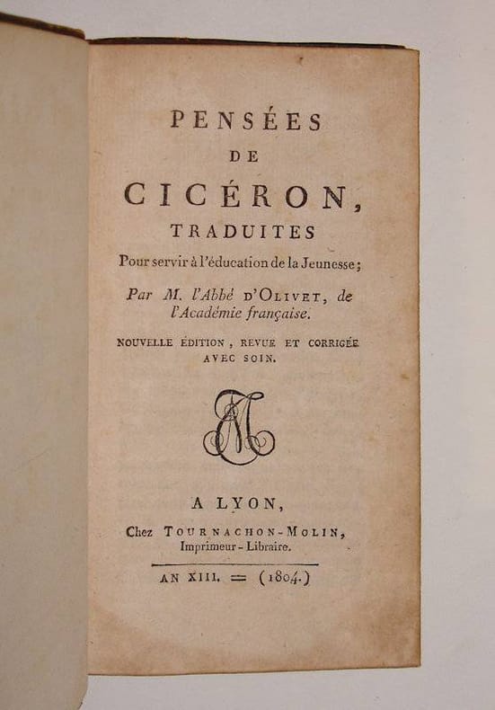 12mo. 317,(1) p. Calf 17.5 cm (Details: Back ruled gilt, boards with gilt borders. Marbled endpapers) (Condition: Binding scuffed, back rubbed, corners slightly bumped. Stamp on the verso of the front flyleaf. Paper slightly yellowing) (Note: This is a thematically organized anthology of texts of the Roman politician, rhetor and philosopher Cicero, 106-43 A.D, mostly taken from his philosophical works. It has 12 chapters: I, 'Sur la religion; II, Sur l'homme; III, Sur la conscience; IV, Sur les passions; V, Sur la sagesse; VI, Sur la probité; VII, Sur l'éloquence; VIII, Sur l'amitié; IX, Sur la vieillesse; X, Sur la mort; XI, Songe de Scipion; XII, Pensées diverses'. Opposite of d'Olivets French translation is the Latin text. The 'Pensées de Cicéron traduites pour servir à l'éducation de la jeunesse' was produced by the French scholar, grammarian and translator Pierre-Joseph Thoulier d'Olivet, also known as the 'abbé d'Olivet', 1682-1768. He wrote about French grammar and prosody, and translated speeches of Cicero (1726/27), his De Nature Deorum (1731) and Tusculanae Disputationes (1732). The 'Pensées de Cicéron', were first published in 1744. Voltaire observed about d'Olivet: 'Nous lui devons les traductions les plus élégantes et les plus fidèles des ouvrages philosophiques de Cicéron, enrichies de remarques judicieuses. Toutes les uvres de Cicéron imprimées par ses soins et ornées de ses remarques, sont un beau monument qui prouve que la lecture des anciens nest point abandonnée dans ce siècle. Il a parlé sa langue avec la même pureté que Cicéron parlait la sienne, et il a rendu service à la grammaire française par les observations les plus fines et les plus exactes'. (See for d'Olivet Wikipédia) (Provenance: On the verso of the front flyleaf the withdrawal stamp of 'Koninklijk Huis-Archief', which is the archive of the the Dutch Royal Family) (Collation: A-N12, O4 (minus blank leaf O4) (Photographs on request)