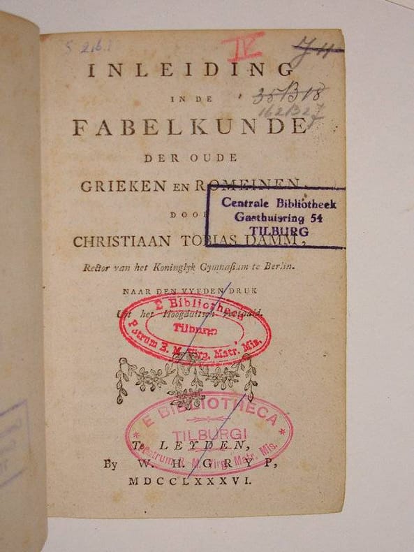 8vo. (II),VIII,348,(XX) p. Half calf 16 cm (Details: Back ruled gilt. Marbled endpapers) (Condition: Binding scuffed, back rubbed, corners bumped. Stamp on front flyleaf, 3 stamps on the title) (Note: Christian Tobias Damm, 1699-1778, 'Rector am köllnischen Gymnasium zu Berlin', 'im grauen Kloster' in the 'Klosterstrasse' was a solid classicist, and one of the first German scholars who stressed the excellence of Greek literature and its language compared to Roman literature and language. He also stressed the necessity of imitating the Greek examples for the improvement of national education. He wanted to make the masterpieces of Greek poetry accessable for a general public with litteral and trusty translations. He produced a Lexicon Pindaricum, and Novem lexicon Graecum etymologicum et reale, cui pro basi substratae sunt concordantiae et elucidationes homericae et Pindaricae. (Berlin, 1765) He also made a much criticized translation of Homer. One critic accused him of having murdered Homer. He had more success with his manual of Greek and Roman mythology: 'Einleitung in die Götterlehre und Fabelgeschichte der ältesten griechischen und römischen Welt'. (Berlin 1763) (Allgemeine Deutsche Biographie 4 (1876), p. 718) This manual remained in use in Germany well into the 19th century, and was translated into Dutch and Norwegian. The manual was reissued several times in Holland. The Dutch publisher of this 1786 edition misunderstood 'Köllnisches Gymnasium' and had 'Koninglyk' (Royal), printed on the title page) (Collation: pi1, *4, A-Z8, 2A2) (Photographs on request)