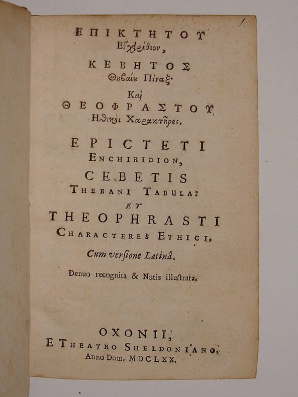 8vo. (XV)(1),143(1);95(1),8 p. Calf 15.5 cm (Ref: Oldfather 175, see also 114; Ebert 6771; not in Hoffmann; only 2 copies in the British Libraries; cf. Brunet 2,1012, who mentions an edition of 1707) (Details: Back ruled gilt, and with 4 raised bands. Black morocco shield in second compartment. Boards ruled with double fillet borders. Greek text with facing Latin translation) (Condition: Cover scuffed and worn at the extremes. Head of the spine gone for 1 cm. Front joint beginning to split. Corners bumped) (Note: This book is the first publication for the market, i.e. 'real book', printed in the famous Sheldonian Theatre, which was named after the Chancellor of the University, and archbishop of Canterbury, Gilbert Sheldon. The building, a work of Christopher Wren, was completed in 1668. The Vice-Chancellor of the University John Fell 'the most powerful man on the University' in those days 'persuaded Sheldon that, when not in use, the building might be used for printing. Composing frames and presses, (no less than five, a large number then) all built locally, were moved in before the builders were out, late in 1668 or early 1669'. (N. Barker, 'The Oxford University Press and the spread of Learning, 1478-1978, Oxf., 1978, p. 15) In F. Madan's 'Oxford books, a bibliography of printed works relating to the University and City of Oxford, or printed or published there' (Oxford, 1895-1931) we found for 1670 only a few small occasional publications, e.g. some epicedia (funeral songs), or more or less internal University documents, such as the 'Parecbolae sive excerpta e corpore statutorum Universitatis Oxon. in usum juventutis academicae'. The only real book 'e Theatro Sheldoniano' in 1670 is this Epictetus/Cebes/Theophrastus edition. (Madan, vol. 3 (1931), no. 2853) For the previous year of 1669 Madan mentions only the imprint 'e theatro Sheldoniano' for the occasional poem of Corbet Owen, 'Carmen Pindaricum', a bad poem by the way, which was recited at the opening of the Theatre on the 9th of July 1669. In order to understand the following search for the identity of the editor of this anonymous 1670 edition, one should know that an expanded edition 'e Theatro Sheldoniano' was printed in 1680 (also anonymously), and another one in 1707. The 1707 edition mentions on its title an editor, 'C. Aldrich' (Carolus, Charles Aldrich), student of 'Christ Church'. Later bibliographers assumed that this same Aldrich must also have been responsible for the anonymous 1670 & 1680 editions. Now Aldrich's dates are 1681-1737. (See for Charles Aldrich 'A directory of the parochial libraries of the Church of England and the Church of Wales' by N.R. Ker & M. Perkins, London 2004, p. 235, s.v. Henley-On-Thames, where the story of his library is told) So, Charles Aldrich cannot have produced the edition of 1670, nor that one of 1680. He however gives us a clue to the identity of the editor of the 1680 edition. The real editor of the 1680 edition, we must conclude, is most probably the classical scholar, Dean of Christ Church, bishop of Oxford, John Fell, because Aldrich tells us on page a4-recto of his 'Ad Lectorem' that he 'minime deflexisse' from 'illa Felli editione' of 1680. This could mean of course 'from the edition of the University Press, led by John Fell', but this seems far fetched. More probable is that Aldrich refers to an Epictetus edition of 1680, which was produced by Fell himself. The name on the title of the 1707 edition caused later bibliographers (Fabricius/Harles, Bibliotheca Graeca, Hamburg, 1796, volume V, p. 80, but also Oldfather in his 'Bibliography of Epictetus', no's 114 and 117) to ascribe the 1670 and 1680 edition erroneously to Aldrich. As shown above, the almost certain editor of the 1680 edition is John Fell. On the title of the 1680 edition even the phrase on the title of 1670 'denuo recognita & notis illustrata' was copied. That it is a reprint (with the addition of passages from Prodicus and Cicero, not yet found in the first edition) of 1670 is proved by the reproduction in 1680 of the 1670 misprint of 'viderà' for 'videre' on page A4-verso of the preface. In the preface of 1670 it is admitted that the edition is based on earlier ones, especially those of Meric Casaubon and Salmasius, but the editor claims to have filled some 'lacunae' and to have corrected the Greek text and Latin translation (by Meric Casaubon, first published in 1659), not only with the help of the printed sources, but also by collating manuscripts from the Bodleian Library and the Library of the New College. (A3-verso) From the abundant notes of others he offers only an anthology (sylva), to elucidate some matters. These notes can be found at the end of the book, and they number only 8 pages. The notes are brief, for the editor says that he does not approve of voluminous books, stuffed with unnecessary knowledge. To underline his loathing he tells the reader that he left the job of compiling this 'sylva' of notes to a 'juvenis studiosus' who had plenty of time for that (cui otium magis suppetebat). (A3-verso & A4-recto) The tone of the writer of the preface is mature and very confident, he surely is a proud and advanced scholar. This leaves us in Oxford ca. 1670 with only one person, John Fell, 1625-1686, a great classical scholar, Dean of Christ Church, bishop of Oxford, and Architypographus of the University Press from 1672. He had a high reputation as a Grecian and a philologist, and published editions of Cyprian, Aratus, Theocritus, Athenagoras and other classical authors. (N. Barker, 'The Oxford University Press and the Spread of Learning', Oxf., 1978, p. 14-26; see also the 11th edition of the Encyclopaedia Britannica, s.v. John Fell) It is more than appropriate to assume that Fell produced the first 'real' book, be it for students, for the press of his University. For the founding of the revived Press of the University of Oxford was his work alone. Epictetus and the 2 other works in this volume have be