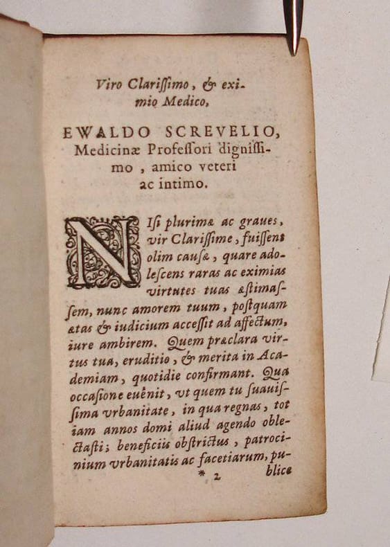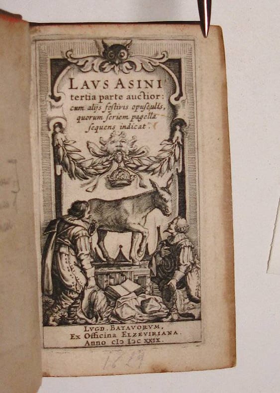 24mo. (XX),438,(2 blank) p. Contemporary calf 10.5 cm (Ref: Willems 315; Berghman 1247; Rahir 286; Brunet 3,84; Graesse 3,233) (Details: Binding ruled blind. Engraved title, depicting 2 learned gentlemen, perhaps Ewaldus Schrevelius, to whom the book is dedicated, and Heinsius' friend Adolph Vorstius, who both doff their hats for an ass) (Condition: Binding scuffed and with a few scratches, corners bumped. Small piece of leather gone at the foot of the spine. Both pastedowns detached) (Note: The 'Laus asini' (ad Senatum Populumque eorum, qui ignari omnium, scientias hoc tempore contemnunt) was published anonymously for the first time in 1623. An augmented edition appeared in 1629. The author is according to all critics the Dutch classical scholar and neolatin poet Daniel Heinsius, 1580-1655. It makes fun of people in an Erasmian spirit, and seems to have lost none of its topicality. The aim is, Heinsius tells in the 'ad lectorem', to vindicate men of letters and those who love to learn, from the contempt of ignorant people, who not only heartily ridicule (liberrime... illudunt) them, but also culture (eruditioni) and the sciences. (leaf *6 recto & verso) This eulogy is a satire on ignorance and voluntary servitude of the ass. It is hard to fathom, because of the complexity of its style, and the overabundance of erudition, (or put more positively, the veritable fireworks of learned allusions) which often obscures matters. The first edition of 1623, which contained the 'Laus Asini' only, is augmented in this second edition with 6 other pieces, 1: an Menippean satire 'Cras credo, hodie nihil', 2: 'Epistola, qua agitur an, & qualis viro literato sit ducenda uxor', 3: 'Laus pediculi, ad Conscriptos Mendicorum Patres', 4: 'Epistola de poetarum ineptiis & saeculi vitio', 5: 'Argumentum Batrachomyomachiae', 6: 'Viro Nobilissimo Ioanni Milandro, Domino de Poederoeye, Principi a Secretis: de Graeculis, quos illi commendaverat'. At the end Heinsius added a short letter to H. Grotius, and a consolation poem for his friend Baudius, on the occasion of the death of his wife) (Collation: *6, 2*4, A-2N6, 2O4 (leaf 2O4 blank) (Photographs on request)