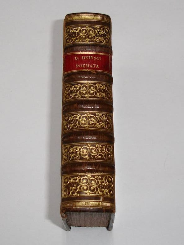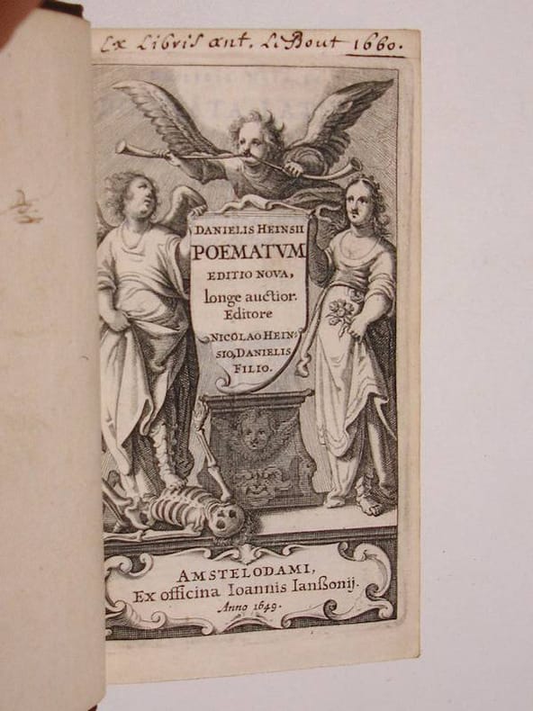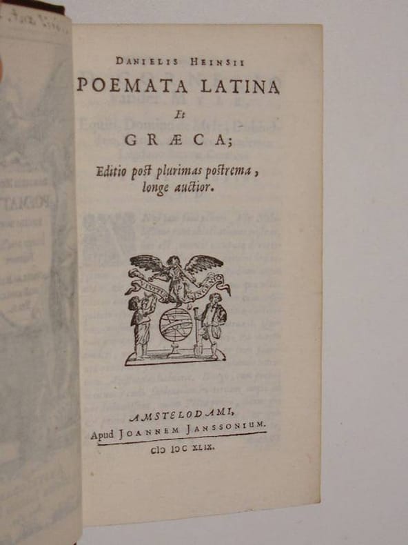 12mo. (XII),666,(2 errata),(4 blank) p., frontispiece. Calf 13.5 cm 'Elegantly printed edition of Heinsius' collective neo-Latin & neo-Greek poetry' (Ref: STCN ppn 850068738; Cf. Willems 1613; Berghman 865; Rahir 2013; Ebert 9380; Brunet 3,84; Graesse 3,232; Ebert 9380) (Details: Back elaborately gilt, with 5 raised bands, and with a red morocco letterpiece in the second compartment. Boards with tripple fillet gilt borders, within which is another tripple fillet rectangle with cornerpieces. Marbled endpapers. Engraved frontispiece, depicting a kind of altar on which rests a shield with text; the altar is flanked by an angel and a girl; the angel tramples on a skeleton; above this scene soars a winged Fama, blowing two horns) (Condition: Joints slightly rubbed. Two small wormholes in the leather at the foot of the spine, and some damage to the lower edge of lower board for ca. one cm. Small hole in the leather of rear cover. On the blank upper margin of the frontispiece an ownership entry) (Note: The Dutch classical scholar of Flemish origin Daniel Heinsius, 1580-1655, who enjoyed international fame as an editor of classical texts, theorist of literary criticism, historian and neolatin poet, was professor of Poetics at the University of Leiden since 1603, extraordinarius Greek since 1605. After the death of J.J. Scaliger, to whose inner circle he belonged, he held the chair of Greek, from 1609 till 1647. He is best known for his edition of Aristotle's treatise on poetry (1611), which he studied in connection with the 'Ars Poetica' of Horace. This edition is 'the only considerable contribution to the criticism and eludication of the work that was ever produced in the Netherlands. (...) In his pamphlet 'De tragoediae Constitutione', published in the same year (1611), he deals with all the essential points in Aristotle's treatise, giving proof that he has thoroughly imbibed the author's spirit. (...) It was through this work that he became a centre of Aristotelian influence in Holland. His influence extended, in France, to Chaplain, and Balzac, to Racine and Corneille; in Germany to Opitz; and in England to Ben Jonson'. (J.E. Sandys, 'A history of classical scholarship, N.Y., 1964, vol. 2, p. 314) Heinsius was a representative of the great age of Neo-Latin in the Low Countries, which encompasses the 16th century, and a good part of the 17th century. Here the Anacreontic-Petrarcan love poetry in Latin was kept alive. (J. IJsewijn, 'Companion to Neo-Latin studies', vol. 1, Leuven 1990, p. 154) This volume of Heinsius' poetry, which was, as the text of the frontispiece tell us, edited by his son Nicolaus Heinsius, opens with early work, the three books of Sylvae, followed by Hipponax, an Ode to Molinus, 3 books of Elegiae, and the Monobiblos. Then comes the 'Herodes Infanticida, tragoedia', followed by Heinsius' last long Latin poem 'De contemptu mortis', a didactic poem in 4 books, wherein arguments, Platonic, Stoic and Christian, are set forth which explain why man should not fear death. Then Heinsius' Epigrams and occasional poetry, the 'Elegiarum iuvenilium libri'. At the end we find Heinsius' literary tour de force, his Greek poems, which were inspired by Theocritus and the Anthologia Graeca. It opens with 'Peplus' (Gown), a series of epigrams which Heinsius composed on Greek authors and philosophers. This part is followed by occasional poetry in Greek which Heinsius wrote for his contemporaries, like Casaubon, and by a section with Heinsius' Latin translations of Greek poetry. The collection closes with the 'Liber adoptivus', which contains occasional poetry addressed to Heinsius by J.J. Scaliger, J. Dousa, H. Grotius et alii. This edition of 1649 is a reissue of an edition of the collected greek and latin poetry of Heinsius, which was published by Heger in Leiden in 1640) (Provenance: 'Ex libris 'Ant. La Bout, 1660', or 'Ant. LaBout') (Collation: *6, A- D12, 2E-2F6 (leaves 2F5 & 2F6 blank)) (Photographs on request)