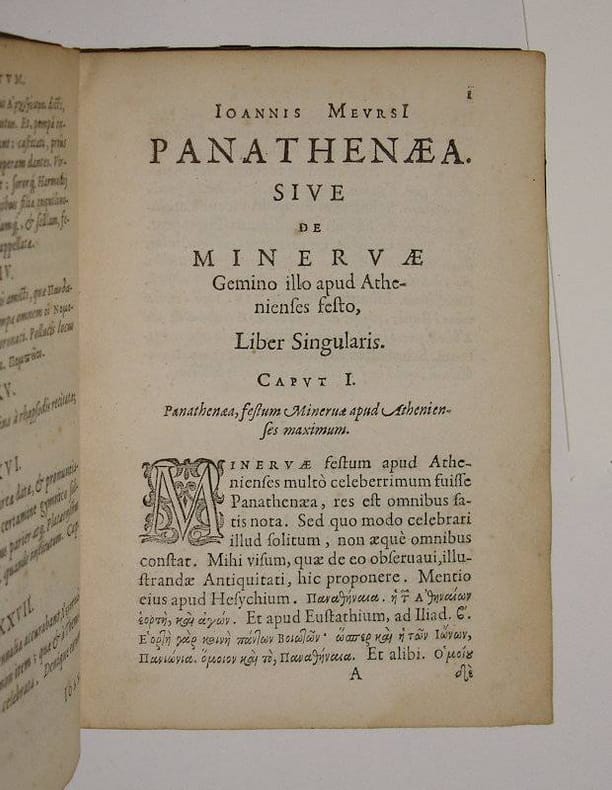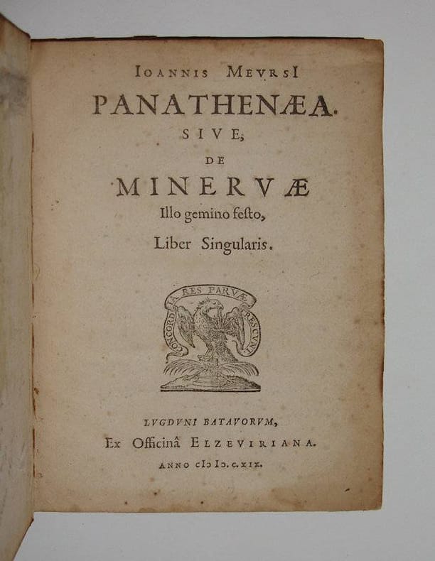 4to. (VIII),48 p. Calf 18 cm (Ref: Wiilems 161; Rahir 131; Berghman 1977) (Details: Woodcut printer's mark on the title, depicting an eagle with spread wings on a pedestal; the bird holds in its beak a set of 7 arrows bound together; the motto reads: 'Concordia res parvae crescunt'; the bundle of arrows symbolizes The Dutch Republic of the Seven United Netherlands (also Provinces); since its foundation in 1588 the motto of the United Provinces was 'Concordia res parvae crescunt', in Dutch: 'Eendracht maakt macht', a still popular motto in the coat of arms of many countries. The saying was coined by the Roman historian Sallust. (Bellum Jugurthinum, caput 10)) (Condition: Binding very scuffed: leather on the back wearing away; scratches on the boards; front joint partly split and broken; corners bumped. Front flyleaf gone. Title dustsoiled. Some light foxing on the first and last pages. Right lower corner of the last gathering faintly waterstained) (Note: The Dutch classicist and ancient historian Johannes Meursius (Johannes van Meurs), 1579-1639, was professor of History and Greek since 1610/13 in the university of Leiden. He studied under the genius J.J. Scaliger, and is best known for the 'editiones principes' of a number of Byzantine authors he produced, and the 'editio princeps' of the 'Elementa Harmonica' of Aristoxenus (1616). He edited also the 'Timaeus' of Plato with the commentary and translation of Chalcidius (1617). He wrote much on the history of ancient Greece, on Eleusis, and especially on the antiquities and festivals of Athens and Attica. His work was widely used as source by later ancient historians. (J.E. Sandys, 'A history of classical scholarship', 1964, p. 311) The tradition of studying the 'Athenian Festivals' goes back to antiquity, was kept alive during the Renaissance, and is still flourishing today. The real mark of a festival is the breadth of participation, i.e. whether large groups of the population participate in the celebration. The Panathenaea, or Panathenaic Games, were held every four years in ancient Athens and are doubtless the best known of all Greek festivals, with the exeption of Eleusis. It was held in honour of Athena, in the form of Athena Polias, the protectress of the city. There were two kinds of Panathenaea, the lesser one, often called Panathenaea, without any epithet, and greater Panathenaea, which had the adjective µe???a. The difference between the two festivals was, that the greater one was more solemn and luxurious, and that the peplus of Athena was brought to the Parthenon on the Akropolis in a magnificent procession. The great Panathenaea were held every fourth year, in the third year of every Olympiad, and lasted a number of days. There were solemn and very munificent offerings and rituals, a torch-race, or lampadephoria/lampadarium, was held between the Athenian phylai, athletic competitions, chariot races, musical, dance and reciting contests were organized, and there was an abundance of food and entertainment. The chief solemnity was the procession to the temple of Athena Polias, where a vestment, the peplos, was consecrated and offered to the goddess. Meursius treats all these aspects, constantly referring to ancient sources. It is clear that all later research on the subject is based on the foundations he laid) (Collation: *4, A-F4) (Photographs on request)