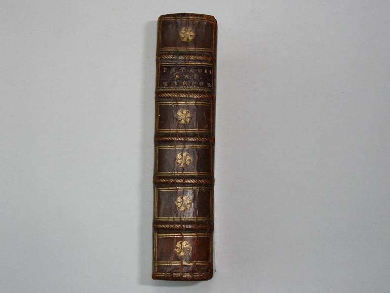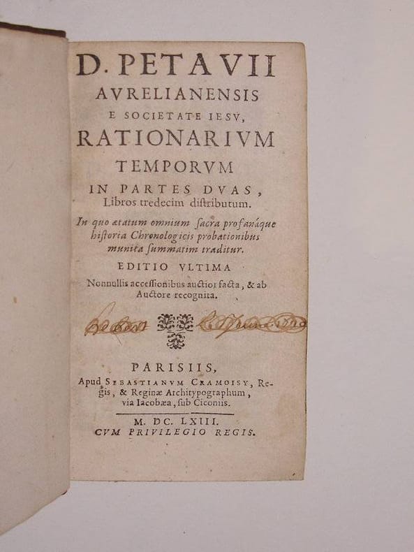 12mo. 2 volumes in 1: (XX),526 (recte 516),(76 index),(2 blank); 241,(7 index),(2 blank) p. Calf. 15 cm (Details: Back gilt, and with 5 raised bands; red morocco letterpiece in the second compartment. Marbled enpapers) (Condition: Binding worn at the extremities. Corners bumped. Owner's entry on the title. Small label on the front pastedown partly removed) (Note: This 'Rationarium Temporum' of the French Jesuit classical scholar, historian and theologian Denis Pétau, latinized as Dionysius Petavius, 1583-1652, is a summary, made for a greater public and for the use at schools, of his great work on chronology 'De Doctrina Temporum', which he published in 1627. The summarized version 'Rationarium Temporum' first appeared in 1633, and was reissued/revised/augmented many times. It was also translated into French, English and Italian. In KVK we counted till 1745 22 Latin editions, of which 8 were published by Cramoisy in Paris between 1633 and 1673. Petavius devoted a large part of this 'Doctrina Temporum' to the vehement criticism of 'De Emendatione Temporum' of the great protestant French scholar J.J. Scaliger, 1540-1609, who is considered to be the first serious modern student of chronology. The Jesuits however considered Scaliger, who lost no opportunity to attack them, an heretic and a great danger to the catholic church. Their opinion on his 'De Emendatione Temporum' (1593) was that it was worthless (frivolum) and a pack of lies (commentitum). Especially Scaliger's denial of the authenticity of the works of Dionysius Areopagita raised their anger. The Jesuits believed that Scaliger undermined the authority of the church, for in the work of Dionysius Areopagita the Jesuits found proof of the 'transsubstantiation', the belief that the substance of the bread and wine used in the sacrament in the Eucharist changed into that of the body and blood of Christ. (J. Bernays, 'Joseph Justus Scaliger', Berlin 1855, p. 81) Dionysius Petavius, a member of the Jesuits, an order called colloquially 'God's Soldiers', took up the fight against Scaliger with the publication of his 'Doctrina Temporum' of 1627. Petavius was a brilliant scholar, and he succeeded in correcting and improving the chronological labours of Scaliger on many points, even though his criticism directed against the protestant scholar was unfair and mean. The science of locating historical events in the ancient world in time is ultimately based on the work of Scaliger and Petavius) (Provenance: Name on the title of 'Hebert Le Jeune, 1720', lightly crossed out. The remains of the small bookplate on the front pastedown are of a Jesuit library) (Collation: a8, e2; A-2A12, 2B8, 2C2 (leaf 2C2 blank); A-K8, L2, M2 (2M2 blank) (Photographs on request)