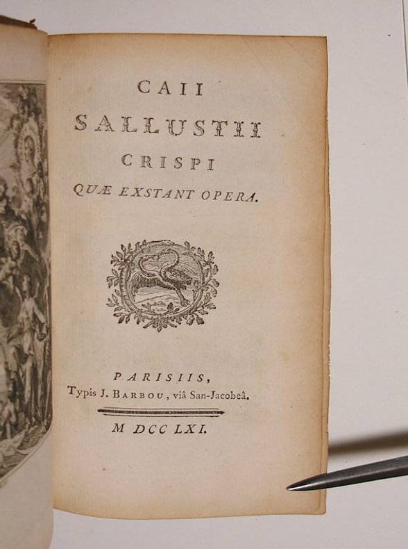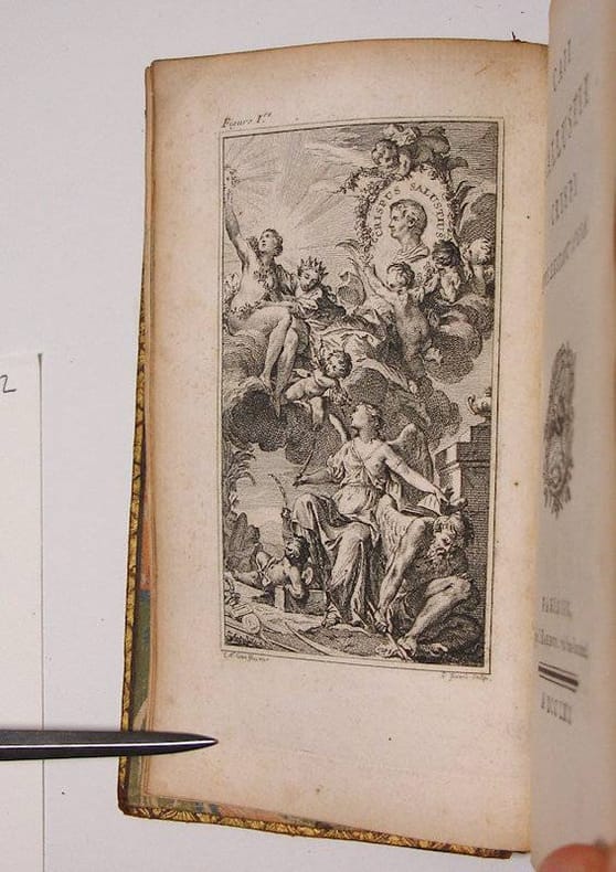 Parisiis Typis J. Barbou 1761 1 vol. in-12 ( 9 x 15,5 cm ) ( poids = 250 g ) 7XXXVI (dont t. ) , 348 pp. . 3 planches HT et HP dont le frontispice , d' après Charles-Nicolas Cochin fils , gravées par Fessard . Comprend : Vita C. Sallustii Crispi e sinceris monumentis depromta , Veterum scriptorum et nonnullorum recentiorum de Sallustio judicia et testimonia , L. A. Flori Bellum Catilinarium , C. Sallustii Crispi Catilina seu bellum Catilinarium , Corollarium de Sallustio quaedam dissimulante in Catilinae historia , C. Sallustii Crispi Jugurtha seu bellum Jugurthinum , Epistolae duae ad C. Caesarem Sallustio adscriptae , C. Sallustii Crispi Historiarum fragmenta , C. Sallustii Crispi Declamatio in M. Tullium Ciceronem , In Sallustium declamatio quae Ciceroni falso tribuitur , Index rerum , Index verborum , Catalogus praecipuarum Crispi Sallustii editionum . Marque typographique aux deux cygognes par Papillon , au titre . 7 bandeaux dont 3 d' après et par Papillon , 2 par de La Fosse . Nombreux culs-de-lampe . Plein veau marbré de l' époque . Dos lisse cloisonné et fleuronné , p. de titre rouge . Triple filet doré encadrant les plats . Roulette dorée sur les coupes et les chasses .Toutes tranches dorées . Gardes papier marbré coquille . Manquent la coiffe inf. et du cuir à une coupe du premier plat . De légers frottés . Coins légèrement émoussés . Intérieur frais .