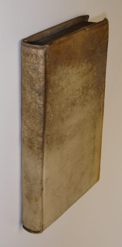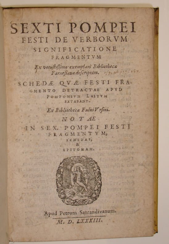 8vo. (1),196,(18),62 p. Vellum 17 cm (Ref: 1 GLN 3005; Schweiger 2,354, Smitskamp 60) (Details: Six thongs laced through the joints. Veritas printer's device on the title: a woman, the naked truth, seated on a cubus, holding a radiant sun in her right hand; in her left hand she holds an opened book and a palm leaf; her feet rest on the globe; the garland of fruit which surrounds her shows a ribbon with the text in Greek: 'Alêtheia Pandamatôr', i.e. 'Allmighty Truth'). (Condition: Vellum partly soiled. Right margin of title slightly thumbed; title slightly browning) (Note: Festus is a 2nd century grammarian, who produced an abbreviation of a lexicographic work by Marcus Verrius Flaccus, a wellknown antiquarian and grammarian living in Augustan Rome. Verrius compiled an enormous lexicon in 80 books, full of unusual, difficult, and archaic words, with discussions about customs, political institutions, belief and Roman law. Remains of his work survive in the epitome of 20 books made by Sextus Pompeius Festus. Festus also added examples found in other sources; the original work of Verrius is completely lost, and only 1 manuscript of Festus survived the Middle Ages in an heavily mutilated form. The first reliable text, which was a great improvement compared to earlier editions was published in 1559 by Antonio Agustin, 1517-1586, who made good use of the Farnese manuscript at Naples, and aimed at reconstructing the text in a strict alphabetical order from A to V, with the help of other Medieval epitomes of Festus. GLN 15-16 states that this edition is a reissue of an edition published in 1581 in Rome. According to Smitskamp 60 Fulvius Ursinus simply reproduces Scaliger's edition without mentioning his name. In the praefatio to the 62 pages with learned notes the reader is assured that this edition (of 1583) is a faithful transcription of the sole surviving MS of Festus) (Collation: A-N8, O4; A-C8, D8 (minus leaf D8) (Photographs on request)