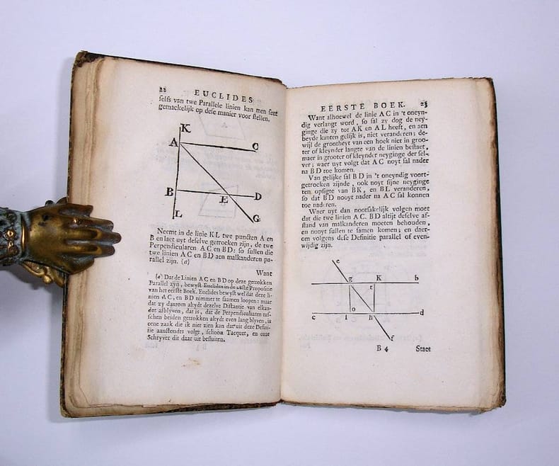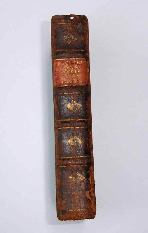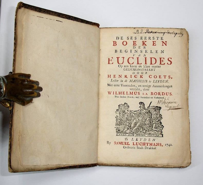8vo. (X),435,(1 blank) p. Half calf 17.5 cm (Ref: Geerebaert 36,9,b; OiN 174) (Details: Back with 4 raised bands. Red morocco shield in the second compartment. Title in red & black. Numerous woodcut geometric illustrations in the text) (Condition: Cover worn. Back rubbed. Small tear in the head of the spine. Two old ownership entries on the title) (Note: Euclides was a Greek mathematician who lived in the 3rd cent. B.C. He wrote the most famous book in the history of mathematics, the 'Elements'. His work was intended for teaching, and follows a deductive approach. 'Euclid's fame is unquestionably attached to the success of the Elements. The number and relative antiquity of manuscript copies, the number of translations, abridged versions, and other adaptations, the variety of comments that have sprung from his text which has enjoyed a large number of editions, prove the immense significance it has had in the history and teaching of mathematics'. (The Classical Tradition, Cambr. Mass. 2010, p. 345/6) Henrick Coets, the translator of this text, was appointed professor of Mathematics (Lector der Wiskunde in het Nederduitsch) of the University at Leiden in 1701. He was to teach mathematics in Dutch. He died in 1730. He wrote also two books on sundials. (Van der Aa, 3,601) This is the 3rd revised edition produced by a successor Wilhelmus La Bordus, who was promoted to the same chair in 1734. He died in 1757. (Van der Aa, 2-1, 912)) (Provenance: Near the upper edge of the title 'B.E. Paravicini di Capelli'. The Dutchman Bartholomeus Eduard Paravicini di Capelli was born in Breda in 1724. His family was of Swiss origin. He may have used this book during his studies and later. Since 1788 he was the Chief of the artillery of the Dutch army. In 1794/95 he fought in the Allied Forces against the French army in the North of France. He died in 1810. The second name on the title is also of a gunner, and reads: 'W. Frowein, Sergeant'. He too may have read and used this book to his advantage. In the 'Nederlandsche Staatscourant' no. 240, of 25 nov. 1842, we found that one 'W. Frowein', sergeant major, was promoted by King William of the Netherlands to First Lieutenant of the second Batallion of the Artillery of Gelderland) (Collation: *6 (minus blank leaf *6); A-2D8, 2E2 (leaf 2E2 verso blank)) (Photographs on request)