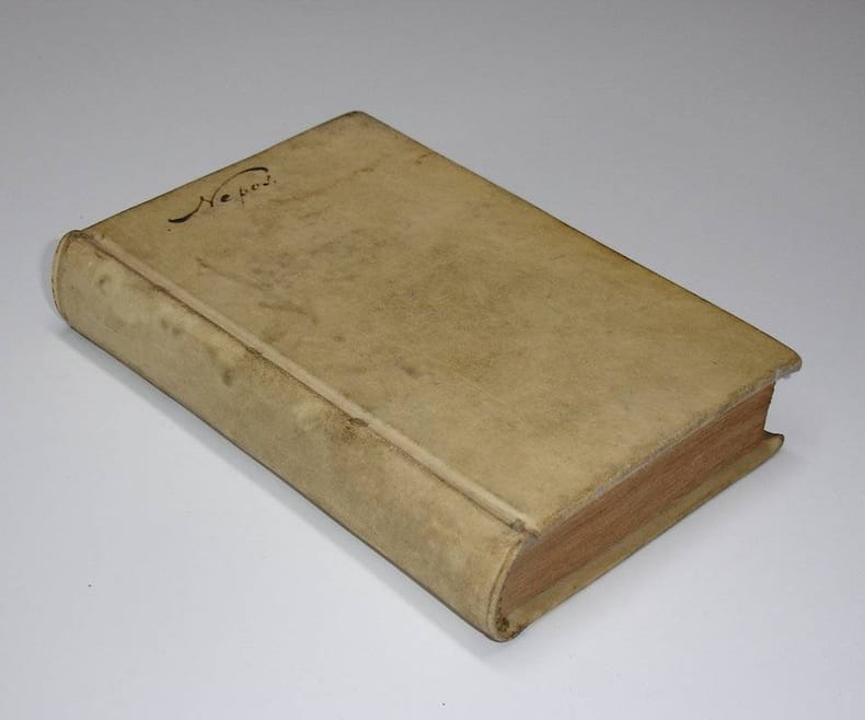 8vo. (XVI),411,(36 index),(1 blank) p. Vellum 16 cm (Ref: Not in Schweiger) (Details: Five thongs laced through both joints. Title in red & black. Engraved printer's device on the title, depicting Hermes and Athena, between them the fountain struck by Pegasus, it's motto: 'Ex hoc fonte licet cuique levare sitim') (Condition: Vellum soiled. 'Nepos' in curly ink letters on both boards. Some old ink annotations in the margins) (Note: This is a school edition with notes of the only surviving complete work of the Roman historian Cornelius Nepos, ca. 100-24 B.C., De excellentibus ducibus exterrarum gentium, also known as De excellentibus Viris. This very well preserverd schoolbook was produced after the manner of the Dutch schoolmaster Johannes Minellius, an industrious and successfull compiler of schoolbooks. He published the works of several classical authors with ample notes which were easy to understand by young schoolboys who were still inexperienced in Latin, or just lazy. Minellius, or Min-ellius, born ca. 1625, was educated at the Schola Erasmiana at Rotterdam, and was from 1650 onward till his death in 1683 a Praeceptor at that school. Minellius' schoolbooks with accompanying annotations were a tremendous success. In 1653 he published his first, Sallustius, then Valerius Maximus in 1661, Florus in 1664, Terence in 1665, Vergil in 1666, Horace in 1668 and Ovid in 1684. His books were reissued many times, and his manner was followed by schoolmasters all over Europe, who wanted to participate in his success and who produced school-editions ad modum Joanni Minellii. At the end of the 17th and in the 18th century his editions were widely used on Dutch grammar schools. After that they were barred from the schools because they were too unscientific, and offered too much help. They were esteemed to be pontes asinorum (Van der Aa 12,2 p. 873). Minellius never published a Nepos edition. The printer/bookseller of this Nepos nevertheless announces on the very first page of the Lectori that this is an edition cum notis Minellii. In the following preface the anonymous compiler however eases off the pedal, and explains that Minellius never touched Nepos, but that the publisher asked him to make a Nepos secundum ejusdem institutum. Cornelius Nepos is the author of the first surviving ancient collection of biographies. De excellentibus etc. contains the lives of 20 Greek generals, and the Carthaginians Hamilkar and Hannibal. Nepos corresponded with Cicero and was close with Cicero's friend Atticus. The collection served probably as a model for Plutarch's Vitae Parallelae. In his own days and in late antiquity Nepos was considered to be a source of importance. The churchfather Hieronymus included him in his De viris illustribus (392 A.D.) in his list of great authors and historians) (Collation: *8, A-2E8 (leaf 2E8 verso blank)) (Photographs on request)
