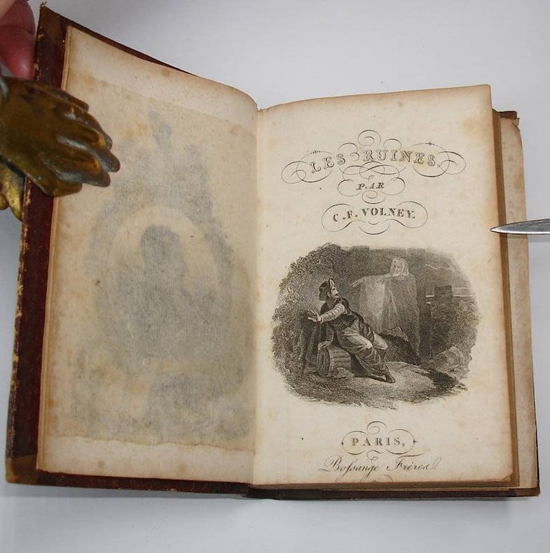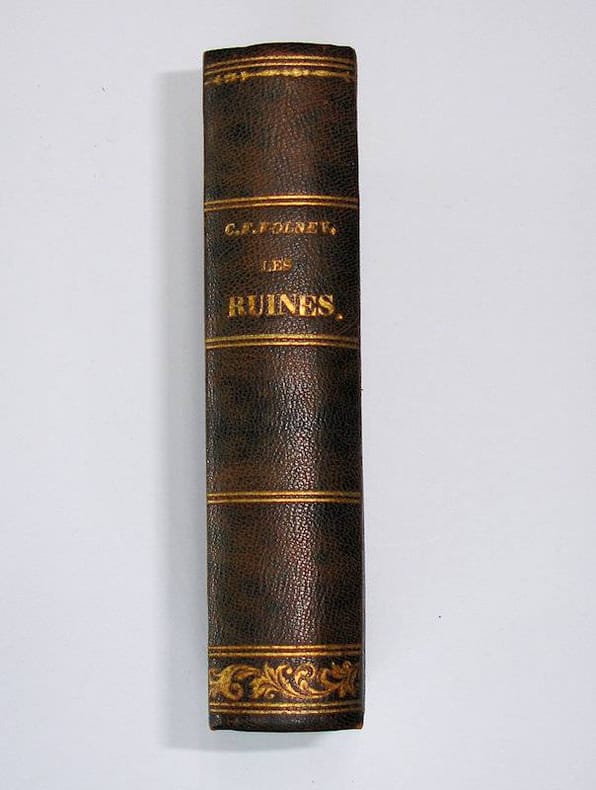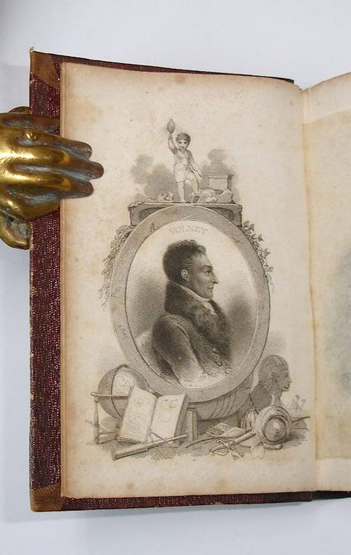 XXV,(1 blank),383,(1 blank) p., engraved portrait, engraved frontispiece, 1 engraved plate, and 2 folding tables, showing a map of Europe, Africa & Asia, and a celestial map with the signs of the zodiac. Half calf 13.5 cm (Condition: Boards and corners somewhat scuffed. Some slight foxing) (Note: The French historian, philosopher and orientalist Constantin François de Chassebuf de Volney, 1757-1820, is one of the founding fathers of the Black Athena theory. After a trip to the Middle East in 1782 he suggested that the ancient Egyptians were originally black Africans, and that the Egyptians of his time were mulats with mixed blood. 'Les anciens Égyptiens étaient de vrais Nègres de l'espèce de tous les naturels d'Afrique; et dès-lors, on explique comment leur sang, allié depuis plusieurs siècles à celui des Romains et des Grecs, a dû perdre l'intensité de sa première couleur, en conservant cependant l'empreinte de son moule originel (...); de penser que cette race d'hommes noirs, aujourd'hui notre esclave et l'objet de nos mépris, est celle-là même à qui nous devons nos arts, nos sciences, et jusqu'à l'usage de la parole'. (Voyage en Syrie et en Égypte, pendant les années 1783, 1784 & 1785, Paris 1785, p. 75/6) In 1791 Volney published his 'Les Ruines, ou méditations sur les révolutions des empires', an essay on the philosophy of history. 'L'auteur se met en scène sur les ruines de Palmyre; et là il se livre à de profondes méditations sur la destruction de tant d'empires à qui leur puissance colossale semblait promettre une éternelle durée, et qui n'en ont pas moins obéi à cette loi de la nature qui veut que tout périsse. Dans ce même ouvrage, Volney établit la nécessité de la tolérance religieuse, reconnue aujourd'hui par tous les esprits éclairés. (...) Les Ruines n'en passent pas moins pour une des productions les plus remarquables de la littérature de la fin du XVIIIe siècle'. (Wikipédia s.v. Volney) Some of the central ideas in Les Ruines stirred the imagination of its readers. It predicted the final union of all religions by the recognition of the common truth underlying them all, and stated that empires rise if government allows enlightened self-interest to flourish) (Photographs on request)