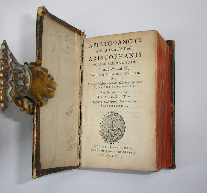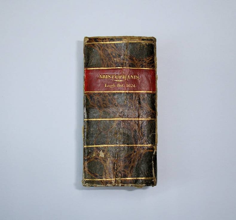 12mo. (XXIV),935,(1),56 (recte 60) p. Contemporary boards 14 cm (Ref: Breugelmans 1624,2, with a note on the date, he suggests a date after 1626; Hoffmann 1,254, a very elaborate description; Dibdin 1,299; Smitskamp, The Scaliger Collection 5; Brunet 1,453; Moss 1,94: 'a beautiful edition'; Graesse 1,207; Ebert 1090) (Details: Greek text and Latin translation. Binding: marbled paper over boards. Back ruled gilt, and with a red letter label. Edges dyed red. Printer's device on the title: a shoveling farmer, above his head the motto 'fac & spera'. 6 woodcut initials) (Condition: Binding worn at the extremities. Paper on both joints split. Back rubbed. Front flyleaf gone. Inner hinge a bit weak. The title leaf shows two small tears in the gutter) (Note: This edition has been praised by some critics; it contains a few short but useful notes by the famous French scholar Joseph Scaliger, 1540-1609. Of the Greek comic playwright Aristophanes, ca. 455-385 BC, born in the radical democracy of Athens, survive 11 plays. In a less free society his genre became obsolete in his own time, and was later replaced by the harmless plays of Menander. 'Aristophanes' comic mode- a dramatic free form with an almost improvisational feel, great poetic and linguistic inventiveness, highly topical satire (public figures being named and personated on stage), and obscenity, beyond almost any subsequent standard of acceptability'- never again became a major theatrical tradition'. (The classical tradition, Cambridge Mass., 2010, p. 69) This opinion seems outdated. Aristophanes sounds very much like modern satyric comedy. He seems to be the creator of his own genre. The 2nd edition of the OCD, 40 years older, sounds more sympathetic. 'He had a keen eye and ear for the absurd, and the pompous; his favoured media are parody, satire, and exaggeration to the point of phantasy, and his favourite targets are men prominent in politics, contemporary poets, musicians, scientists and philosophers, and (...) for a wide public'. (OCD 2nd ed. p. 113) Serious scholarly work on the text of Aristophanes begins in the 16th century, with Petrus Victorius, J.J. Scaliger and his friend Willem Canter. A new edition with Scaliger's notes was published posthumously in 1624 by Maire in Leiden, this edition. That Scaliger, a man with a sharp tongue, who had loads of ennemies, was an admirer of the comic playwright is no wonder. The following epigram can be read in the introduction to Scaliger's text of 1624: Ut templum Charites quod non labatur, haberent,/ invenere tuum pectus Aristophanes (The Graces have found for themselves a temple that would not fall down, your breast, Aristophanes). (p. *8 verso) The notes of Scaliger originate from two printed editions once owned by the great man himself, and furnished for publication by the Dutch scholar G.J. Vossius, 1577-1649 The Latin verse translations of the Plutus, Nubes, Ranae, Equites and Archanenses were made by Nicodemus Frischlinus, that of the Vespae, Pax and Lysistrata by Q, Septimius Florens Christianus, and a prose translation of the Aves, Ecclesiazusae and Thesmophoriae by Andreas Divus. (Typographus lectori p. *2 recto). After the Greek text of Aristophanes' plays starts at page 898 a 16 page section 'Index vocum et versuum proverbialium', followed by 18 pages with 'Notae excerptae ex variis lectionibus, emendationibus, et coniecturis virorum doctorum, ac potissimum duobus exemplaribus manu Josephi Scaligeri emendatis, e Bibliotheca Gerardi Vossii.' At the end we find the 56 (recte 60) page Fragments section, which was once edited by the Dutch scholar Willem Canter, or Gulielmus Canterus, with a preface of Andreas Schottus and now produced by the Dutch theologian Willem van der Codde, or Gulielmus Coddaeus, 1574- after 1625) (Collation: *12, A-2Q12, A-B12, C6 (Pagination irregular in the fragments part at the end, between the gatherings A and B. The page numbers jump back from 24 at the end of A to 21 at the beginning of B, else all correct) (Photographs on request)