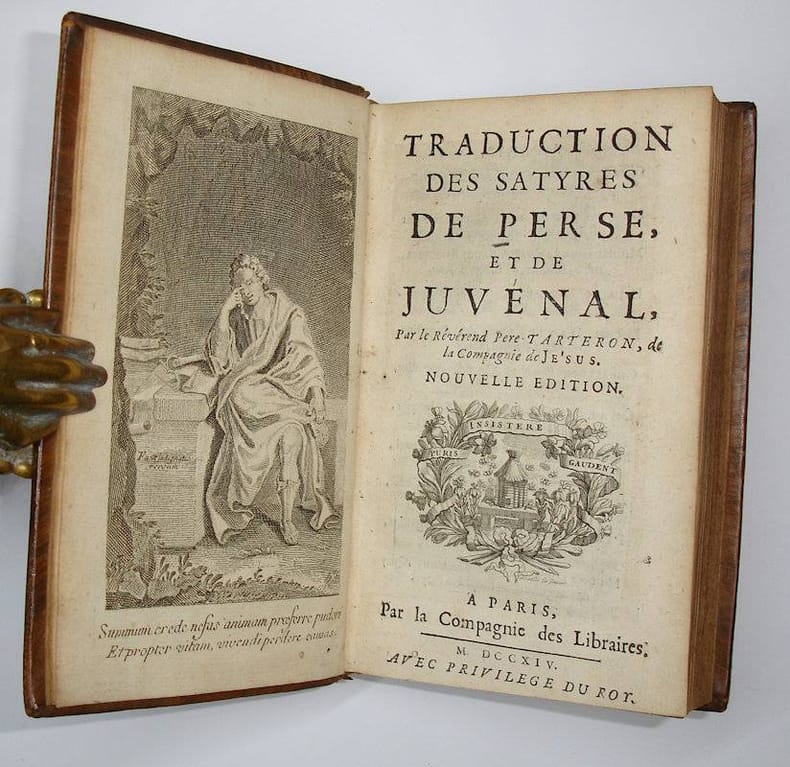 12mo in eights & fours. (XLVIII),591,(1 blank) p. Calf 17 cm Two poets exploring the limits of satiric free speech (Ref: Schweiger 2,517; cf. Graesse 3,522; Ebert 11273) (Details: Back gilt and with 5 raised bands, shield in the second compartment. The frontispiece depicts a poet/thinker in a robe, and seated on a stone bench; on the bench the inscription Facit indignation versum. Printer's mark, a beehive, on the title. The Latin text & French translation are printed side by side in different typefaces) (Condition: Wear to extremities of the binding: head & tail of the back slightly chafed. Back rubbed. Shield on the back vanishing. Wormhole near the gutter of the left lower corner of the first 64 p.) (Note: The stoic poet Aulus Persius Flaccus, 34-62 A.D., is a representative of the imperial Latin satire. His stoic satires form one 'libellus' of 6 satires, together 650 hexameters. 'They are well described as Horatian diatribes transformed by Stoic rhetoric'. 'He wrote in a bizarre mixture of cryptic allusions, brash colloquialisms, and forced imagery'. (OCD, 2nd ed. p. 805) The Stoic philosopher is in the work of Persius not a figure of fun, but a wise man. The Roman poet Juvenalis, ca. 55-140 AD, was the last and most influential of the Roman satirists. He 'uses names and examples from the past as protective covers for his exposés of contemporary vice and folly'. (The Classical Tradition, Cambr. Mass., 2010, p. 501) His main theme is the dissolution of the social fabric. He had a lasting influence on neolatin and vernacular writers of the Renaissance and later centuries. A striking feature of this book is, when one runs it through for the first time, is the discrepancy between the space occupied by the Latin text and the French translation. Take for instance the pages 2 and 3: on p. 2 we count 56 Latin words, on the opposing page 152 French words. Concise verses are transformed into long phrases in prose. The translator of these verses, the French Jesuit Jérôme, or Hieronymus Tarteron, 1644-1720, was professor of rhetoric. He translated also the Satires, Letters and the Ars Poetica of Horace. As usual with Jesuit editions, here also 'le pere Tarteron a eu soin de retrancher ce qui dans ces poëts pourroit nuire aux bonnes moers', so we read in the second volume of the Nouveau Supplement au Grand Dictionnaire Historique, de L. Moreri, Paris 1749. The edition was first published in 1689 and met with some success: it was reissued in 1695, 1706, 1714, 1729, 1737 and 1752) (Collation: pi1 (frontispiece), â8, ê4, î8, ô4; A8-3B4 (:gatherings A - 3B alternating), 3C8)) (Photographs on request)