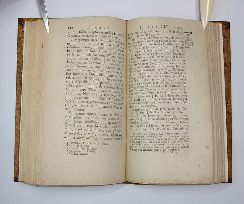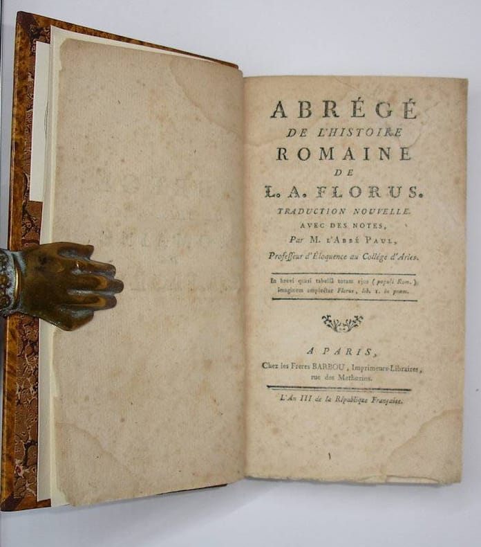 12mo. (IV),384 p. Modern half calf. 18.5 cm (Ref: This edition not in Schweiger and Brunet; however cf Schweiger 2,366; cf Brunet 2/2,1312; cf Ebert 7698) (Details: Latin text with facing French translation. Back with five raised bands; marbled boards, marbled endpapers. Only the upper margin has been cut) (Condition: Small bookplate on the front pastedown. Small waterstain in the right lower corner and the left inner corner of the first 30 p. Paper yellowing) (Note: This is the chief work of the Roman historian Lucius Annaeus Florus, who lived at the beginning 2nd century AD. It is an abridgement (epitome) of Roman history with special reference to the wars waged up to the age of Augustus. Florus 'shows a certain literary gift, marred, however, by a strong tendency to rhetoric. His brevity often entails obscurity, though he sometimes produces a felicitous epigram. (...) As an historian he is often inaccurate in both chronology and geography, but the work as a whole achieves a limited success as a rapid sketch of Roman military history. It was a favourite school-book in the 17th century'. (OCD, 2nd ed. p. 442) The Abbé Armand-Laurent Paul, 1740-1809, was a French jesuit and grammarian. He wrote a number of scholarly works; the first Barbou edition of his Florus, together with his notes and translation, dates from 1774 (Brunet 2,2 p. 1312). The edition of 1774 is common, the edition of 1794 is rather rare. The translations by Paul are said to be trustworthy, but dry) (Provenance: Bookplate of the Belgian ancient historian and archaeologist Marie Therèse Charlier on the front pastedown) (Collation: pi2, A-Q12) (Photographs on request)