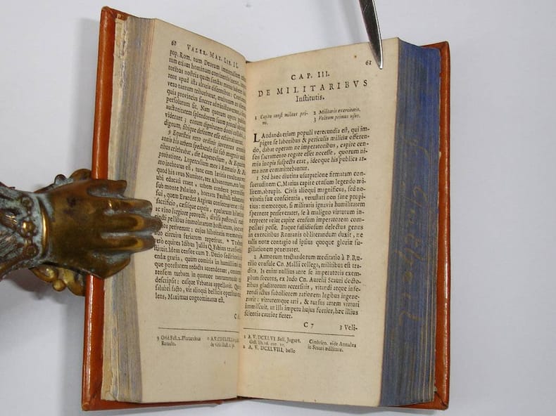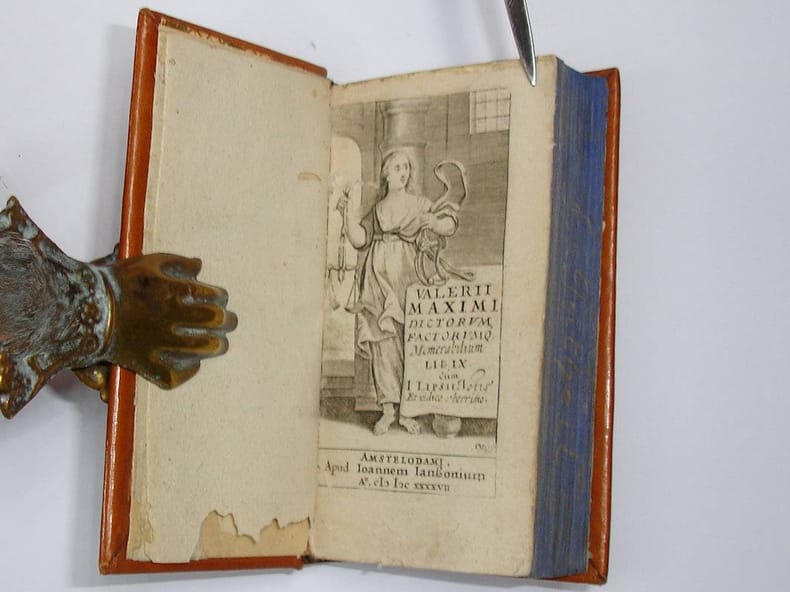 12mo. (XII),486,(26 index) p. Modern calf 14 cm (Ref: Schweiger 2,1110; Graesse 6/2,245) (Details: 20th century new binding, antique style. Back with three raised bands. Gilt short title in second compartment. Marbled endpapers. Engraved title: a woman holding in her hands a balance scale and reins. Woodcut initials. Edges of the book-block dyed blue) (Condition: Back spotted. Title page thumbed. Lower margin of the blank front flyleaf damaged. A few small wormholes in the lower margin of the title page, outside the engraving. Two small wormholes near the gutter of the first 3 leaves, nibling at a few letters) (Note: The Roman historian Valerius Maximus, who lived during the reign of the emperor Tiberius, composed a manual of illustrative examples for rhetoricians, the Factorum ac dictorum memorabilium libri IX. 'The subject-matter of the nine books has no clearly defined plan, but is divided under headings, mostly moral or philosophical in character (e.g. Omens, Moderation, Gratitude, Chastity, Cruelty), which are usually illustrated by Roman (domestica) and foreign (externa) examples. (...) The work is shallow, sententious, and bombastic, full of the boldest metaphor and rhetorical artifices of the Silver Age. (...) Yet the variety and convenience of the compilation ensured some measure of success in antiquity, and considerably more in the Middle Ages'. (OCD 2nd ed. 1106) Medieval education drew heavily from classical authors, for pagan learning was necessary for understanding the Scripture. The focus often was on memorizing sententiae and offering exempla and anecdotes that exemplified virtues. The critical and historical approach of the Renaissance to the school curriculum eliminated most post-classical authors in favor of 'Cicero for rhetoric, Virgil for poetry, and Caesar, Valerius Maximus or Sallust for history, on the argument that antiquity provided the best models for understanding people and their place in society'. (The Classical Tradition, Cambr. Mass. 2010, p. 294) This edition of 1647 by Johannes Janssonius is a reissue of the Valerius Maximus edition of Leiden publisher Hegerus of 1640. The notes are by the humanist scholar Justus Lipsius, 1547-1606, which were first published by Plantin in 1585. Lipsius consulted for his notes two new manuscripts. Lipsius was probably interested in Valerius Maximus as source for his own Monita et exempla politica (1605)) (Provenance: On the front flyleaf the owner's inscription: J. Piper, Gryphiae 1778. This probably is Johannes Gottfried Piper, a German Schulmann and paedagogue who studied in Greifswald. Till 1792 he was Rector at Ribnitz, a small city in Mecklenburg-Vorpommern. He died in 1814. (Jöcher, Allgemeines Gelehrten-Lexicon, Bremen 1819, Volume 6, p. 248) On the front flyleaf in ink the name Groskurd. This is probably the German classical scholar Christoph Gottlieb Groskurd, born 1770, who died in 1834 in Stralsund. 'Ab 1790 studierte er in Göttingen bei den Professoren Gottlieb Jakob Planck, Johann Friedrich Schleusner und Johann Gottfried Eichhorn protestantische Theologie sowie bei den Professoren Christian Gottlob Heyne, Arnold Hermann Ludwig Heeren, Johann Georg Heinrich Feder, Christoph Meiners, Anton August Heinrich Lichtenstein und Splitter (klassische) Philologie. Von 1793 bis 1797 war er Kollaborator am Pädagogium in Ilfeld. Von 1797 bis 1823 unterrichtete er die Tertia am Stralsunder Gymnasium. Er trat 1823 wegen einer schweren Erkrankung in den Ruhestand und widmete sich darauf den Studien der Werke des Strabon'. (Source Wikipedia) On the frontflyleaf also the inscription: Cunow, in Potsdam. A former owner, probably the one who had this binding restored, outlined his name in the blue paint at the right edge of the book-block: F. Gutheil) (Collation: *6, A-X12, Y4) (Photographs on request)