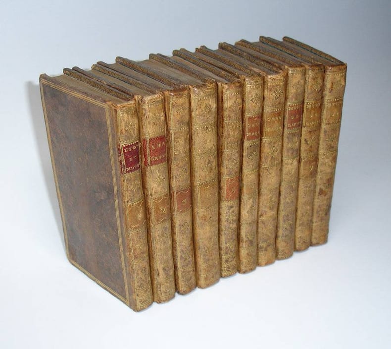 12mo. 6 parts in 10 volumes: (ad 1:) 106,(2) p., 2 engraved plates, including a portrait of Gail. (ad 2:) (IV),XX,74,(4) p., 4 plates. (ad 3:) 2,107 p. (ad 4:) 2 volumes: IV,261,(3 blank); (IV),132 p.; (ad 5:) (II),104;142,(1),(1 blank) p. (ad 6:) (IV),VIII,105,(1 blank); (IV),111,(1 blank); (IV),178 p., 5 plates. Mottled calf 13 cm (Ref: Ad 1: Hoffmann 1,426; Ebert 2429; Graesse 1,428; Brunet 1,950. Ad 2: Hoffmann 1,141; cf Ebert 568; Brunet 1,255. Ad 3: Hoffmann 3,604; Ebert 24146. Ad 4: Oldfather 278; Hoffmann 2,16; Brunet 2,1015; Ebert 6785; Graesse 2,484. Ad 5: Hoffmann 1,430; Graesse 2,18; Ebert 3356. Ad 6: cf. Hoffmann 2,561; Brunet 3,1213; cf. Graesse 4,264; Ebert 12407) (Details: Backs gilt, and with a red or brown morocco shield on the second 'compartment'. On a shield in the middle 'compartment' the gilt numbers: 1 to 10. Boards with triple fillet gilt borders. Edges of the boards and the book-block gilt. Inside dentelles gilt. Endpapers blue marbled. The portrait and plates are engraved by Barbier, Chaudet et alii. Only the 4 volumes dedicated to Epictetus and Callimachus offer a Greek text with a facing French translation, the other volumes have a French translation only. We found in the catalogue of the library of the important Dutch statesman Rutger Jan Schimmelpenninck, 1761-1825, which is preserved in the mansion Nijenhuis at Diepenheim, an identical set, same title, same publisher, same duodecimo (12mo) format, published in 1794/95, with the same numbering on the back, and, as far as we can judge from the description in the catalogue, the same binding. We suppose that the publishers Didot and Gail or another bookseller composed several portable sets in a nice binding for educated and well to do gentlemen and women, who probably were not able to read the original texts) (Condition: Bindings slightly worn & scratched. Head of the spines of volume 1 & 2 slightly chafed. Some corners somewhat bumped. Excellent paper. Some faint foxing. A charming set) (Note: At the end of volume 7, the second volume of the Callimachus, there is an advertisement for a collection of 10 titles to be sold as a unit at the price of 300 livres. The publisher and editor of the 10 volumes is Monsieur J.B. Gail. The collection consists of works Gail translated himself, i.e. Bion & Moschus, Lucianus, Xenophon, Anacreon (6 volumes); the other 4 volumes were translated by others, he tells in the advertisement, the two volume sets of Callimachus and of Epictetus. The translator of Callimachus is J.F.G. de la Porte Du Theil, the translator of Epictetus is Lefebvre de Villebrune. (See for the assignment of this Epictetus to the collection of Greek authors of Gail: F. Schoell, 'Répertoire de littérature ancienne, ou choix d'auteurs classiques grecs et latins', Paris 1808, Tome I, p. 51) Jean Baptiste Gail, 1755-1829, was a celebrated French Hellenist. 'In 1791 he was appointed deputy, and in 1792 titular professor at the 'Collège de France'. During the Revolution he quietly performed his professional duties, taking no part in politics, although he possessed the faculty of ingratiating himself with those in authority. In 1815 he was appointed by the King Keeper of Greek MSS. (...) Without being a great Greek scholar, Gail was a man of unwearied industry, whose whole life was devoted to his favourite studies, and he deserves every credit for having rescued Greek from the neglect into which it had fallen during the troublous times in which he lived'. (Encyclopaedia Britannica 1911, vol. 11, p. 387) His most valuable work were his French translations and his editions of Greek authors. He published also editions of Thucydides and Herodotus) Epictetus' Enchiridium and the 'Tabula Cebetis' in this series were produced by the French sholar and translator Jean-Baptiste Lefebvre de Villebrune, 1732-1809. He was professor of Hebrew at the 'Collège de France' from 1791 to 1794, and librarian of the 'Bibliothèque de la Nation' in 1794/95. He was a polyglot who translated from Latin, Spanish, Italian, English, German, Swedish, and Greek. His best known translation is that of the Greek compiler Athenaeus, 'Banquet des Savans', 1789-1791, 5 volumes. (See his French lemma in Wikipedia) In 1782 Lefebvre de Villebrune had already published a Greek text of the Enchiridium, and a year later a Greek text accompanied by a French translation, and some critical notes. His edition was completely eclipsed by the Epictetus edition of the German scholar Schweighaeuser, which was published a few year later in 1798 and which was the starting point of a new era of Epictetus scholarship. In the eyes of Schweighaeuser Lefebvre de Villebrune was an incompentent and sloppy scholar. The first volume of this Epictetus set of two contains the Greek text of the Enchiridium, with an opposing French translation, an introduction of 100 p. and 70 p. notes. The second volume contains a Greek text of the 'Tabula Cebetis', also with an opposing French translation, an introduction of 19 p., and notes on 30 pages) (Photographs on request)