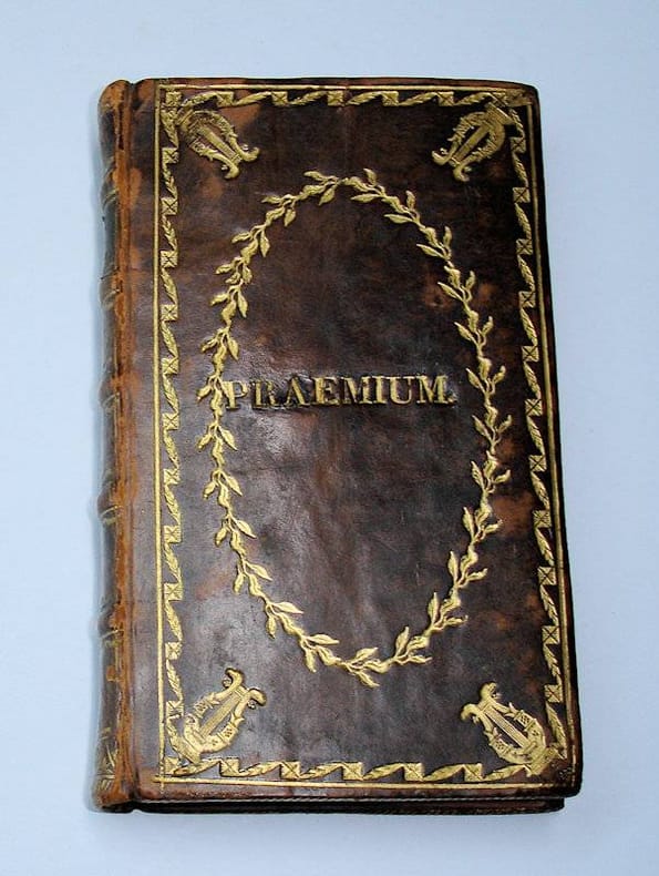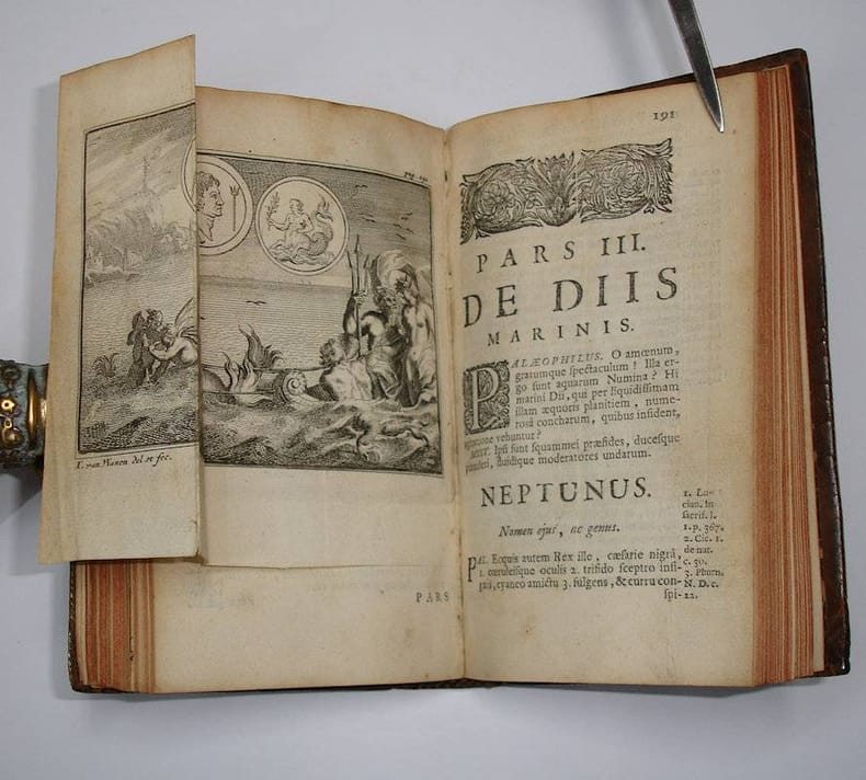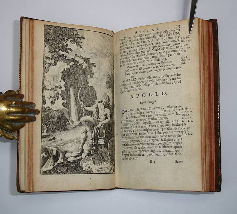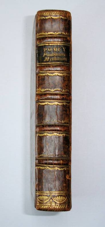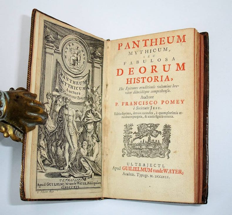 8vo. (XVI),298,(14) p., frontispiece & 26 engraved plates. Calf. 16 cm "Prize copy' (Ref: STCN ppn 20819178X; Brunet 4,793; Michaud 34 p. 12: 'la meilleure édition est celle qu'a publiée Sam. Pitiscus') (Details: Prize copy, probably of a Belgian Jesuit College. Back with 5 raised bands between gilt fillets & floral rolls. Black morocco gilt lettered shield in the second compartment. Boards with gilt fillet borders. Within the fillet border a gilt row consisting of ears of corn and quadrangles. A gilt lyre in all 4 corners. A gilt oval laurel wreath with in its center the gilt text PRAEMIUM. Edges of the boards gilt. Marbled endpapers. Title in red & black. Woodcut printer's mark on the title. Engraved frontispiece depicting deities. 26 engraved plates with mythological scenes) (Condition: Wear to extremes, back somewhat rubbed. Prize gone. Front hinge cracking, but still hanging on 2 ties) (Note: This is the 6th edition of the most popular and authoritative mythology manual of the 17th and 18th century. It was first published in Lyon in 1659. There are more than 40 editions, and it was translated into English, French, Spanish and Polish. The manual was produced by the French Jesuit schoolmaster François Antoine Pomey, 1618-1673, who lectured humanities and rhetoric at several colleges. He is also the author of a number of schoolbooks and dictionaries. His 'Pantheum Mythicum' became to be regarded as an essential work which provided the indispensable ornaments of formal discussion. It was also popular as a schoolbook, for the stories formed a body of moral precepts, hidden under the mask of agreable fiction. 'Perinde quasi, alius esse debeat, cum omnibus, tum mihi maxime, ac studium & propagatio Divinae gloriae?'; In the praefatio to this 6th edition the Dutch classicist of German origin, Samuel Pitiscus (Samuel Petiski), 1636-1727, tells the reader that the publisher had sold within 4 years 1300 copies of the 5th edition of 1697. To surpass this tremendous success he asked him to produce a new edition purged from all erroneous inventions and extensions of later editors, and mistakes of ignorant printers. Pitiscus really was the expert for the job. He produced editions of several Roman historians, and did also lexicographic work. He was well acquainted with the 'Romanae Antiquitates' of Rosinus and Dempster, and in 1713 he published an encyclopaedic 'Lexicon Antiquitatum Romanarum') (Collation: *8, A-T8 V4 (Photographs on request)