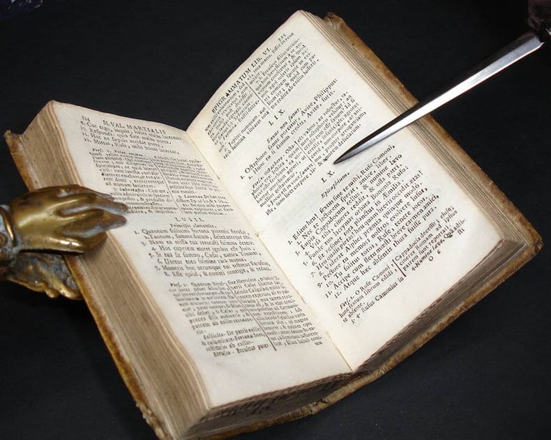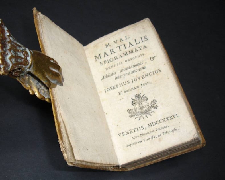12mo. (X),685,(24 index) p. Vellum 15.5 cm (Ref: Schweiger 2,599 mentions only the first edition of 1693) (Details: 2 thongs laced through cover. Latin text followed by a commentary in 2 columns) (Condition: Binding soiled. Lower corner bumped. Title dust-soiled) (Note: The Roman epigrammist Martial, ca. 41-104 A.D., embraced in his 14 books of epigrams 'many topics: flattery of social superiors, satire of man's foibles, eroticism'. (The Classical Heritage, Cambr. Mass., 2010, p. 565/66). Contemporaries valued his work for its frankness and wit. Later Renaissance authors mined his work and sparked a resurgence of Neo-Latin and vernacular epigrams throughout Europe. Martial's obscenity created a dilemma for editors. Censors banned and expurgated the 151 pornographic epigrams, the so-called Obscoena, not wanting to hurt the taste of the civilized reader, or they simply hid them at the end of the text before the index, as happened e.g. in the edition for the young Dauphin. (Paris 1680) Voltaire did not appreciate Martialis, he chided him for his images grossières. This school edition of Martial is the work of the French Jesuit scholar, poet and paedagogue Joseph de Jouvancy, or Jouvency, in Latin Josephus Juvencius, 1643-1719. Jouvancy entered the Society of Jesus when he was sixteen, 'and after completing his studies he taught grammar at the college at Compiègne, and rhetoric at Caen and the College of La Flèche. He made his profession in the latter place in 1677 and was afterwards appointed professor at the Lycee Louis-le-Grand in Paris. In 1699 he was called by his superiors to Rome to continue the history of the Society of Jesus begun by Niccolo Orlandini, and was engaged on this work until his death. (...) Jouvancy edited a large number of school editions of Latin authors, including Terence, Horace, Juvenal, Persius, Martial, the Metamorphoses of Ovid and the philosophical writings of Cicero, such as De Officiis, Cato Major and Laelius'. The texts were revised and purged for school use, and supplied with footnotes in Latin. 'These expurgated editions were frequently reissued well into the 19th century, both in France and other countries'. (Source for Jouvancy Wikipedia)) (Collation: A - 2G12) (Photographs on request)