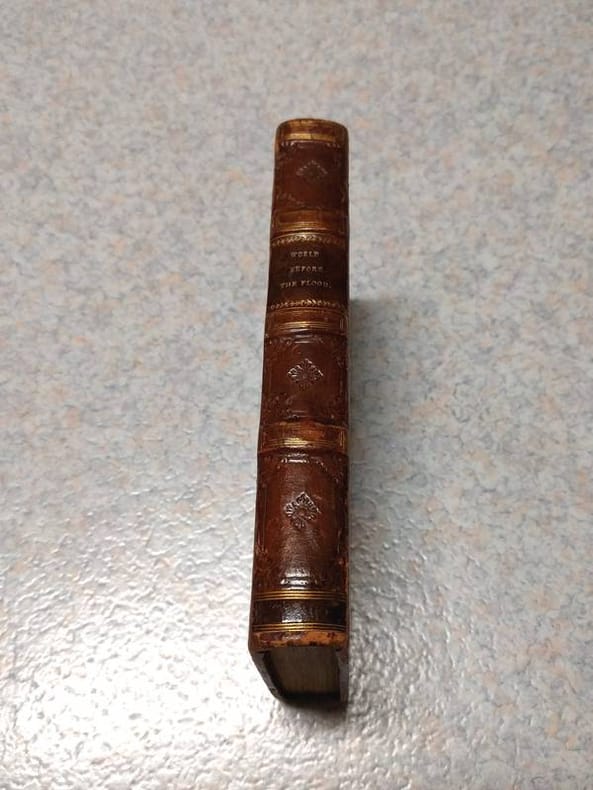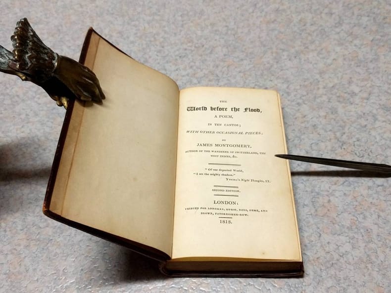 12mo. III-XVI;328,(1),(3 blank) p. Calf. 17 cm (Details: Back with 3 gilt raised bands; gilt title in second compartment; other 3 compartments with blindstamped palmette cornerpieces. Both boards with tenfold blindstamped fillet borders, within blindstamped floral borders, a blindstamped wave/flood pattern in the central panel) (Condition: Cover shows wear to the extremes. Lacking the half-title before the title, with the text: 'The world before the flood, with other occasional pieces') (Note: James Montgomery, 1771-1854, was a British poet, philanthropist and campainer for humanitarian causes. He achieved some literary fame with 'The wanderer of Switzerland' in 1806, against the annexation of that country by the French. The abolishment of slavery is the theme of his 'The West Indies', published 3 years later. He created a reconstruction of the world from the creation to the Deluge in his 'The world before the flood', published in 1812. The author states in his preface that he is 'under obligation of no other authority whatever'. The work was a success, and sold more than 10000 copies) (Collation: pi-6, A4, 2A8, B4, 2B8 etc.- N4, 2N8, O2, 2O4, P4 (leaf P3 verso and leaf P4 blank) (Between the gatherings A till N there is a regular alternation in the signature of the gatherings, each gathering, signed A etc. till N numbers 4 leaves, and is immediately followed by a gathering signed 2A etc. till 2N, numbering 8 leaves)) (Photographs on request)