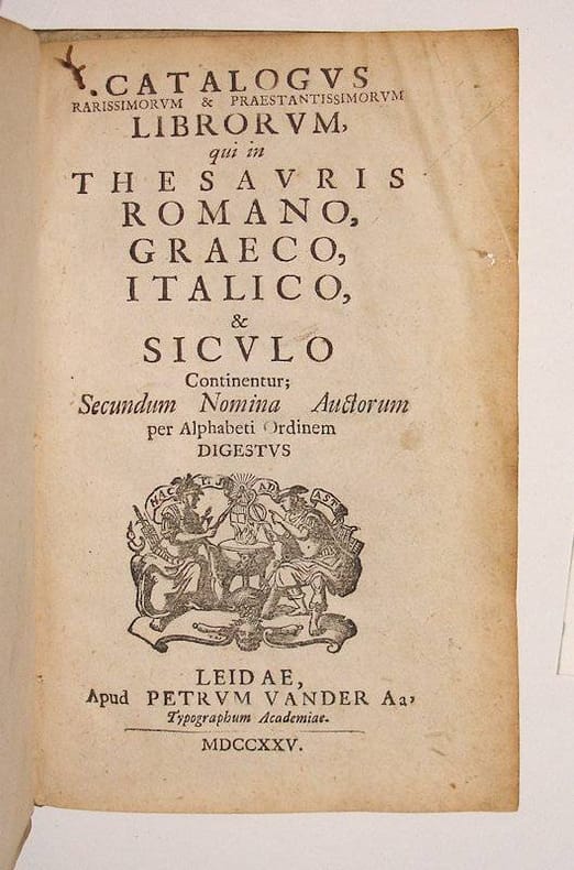 8vo. (VIII),88 p. Vellum 20.5 cm (Details: Woodcut printer's mark on the title, it depicts Athena and Hermes, the motto is: 'Hac itur ad astra', borrowed from Seneca's 73th letter. The words that complete this saying are often forgotten: 'hac secundum frugalitatem, hac secundum temperantiam, hac secundum fortitudinem') (Condition: Vellum age-tanned. Some small wormholes in the gutter of the blank upper corner, sometimes nibbling at a letter. Pinpoint wormhole in the blank right margin) (Note: The Dutch classical scholar Pieter Burman, latinized as Petrus Burmannus, 1668-1741, was professor of History and Eloquence (Latin) at the University of Utrecht from 1696, and was transferred to Leiden in 1715. As an editor he confined himself to the Latin classics, such as Phaedrus, Horace, Ovid and Lucan. 'His numerous editorial and critical works spread his fame as a scholar throughout Europe, and engaged him in many of the stormy disputes which were then so common among men of letters. Burman was rather a compiler of editions than a critic; his commentaries show immense learning and accuracy, but are wanting in taste and judgement.' (Wikipedia 'Pieter Burman the Elder') The great powers of endurance of this manufacturer of 'Variorum editions' of classical authors, and his laborious patience have led to his being described as the 'beast of burden' of classical learning. (Sandys, vol. 2, p. 445) This catalogue of 1725 is a proof of Burmannus' great powers of endurance and laborious patience. It is a bibliography, offering a list of the authors and works that are mentioned in Jacobus Gronovius' (1645-1716) huge thirteen volume 'Thesaurus Antiquitatum Graecarum' (1697-1702), and Johannes Georgius Graevius' (1632-1703) equally huge twelve volume 'Thesaurus Antiquitatum Romanarum' (1694/99), and Graevius' huge 45 volume 'Thesaurus Antiquitatum et Historiarum Italiae, Neapolis, Siciliae, Sardiniae, Corsicae etc.', (1704-1725) which was continued by Burmannus after the death of Graevius. Burmannus produced the catalogue, he tells in the preface (Lectoribus s.d. Petrus Burmannus), because he felt the need, having completed the last volume of this third series to which he contributed, to produce a supplementary volume, which was to create order in the multitude of names and the farrago of titles, and to make these huge enterprises accessible. (p. *2 recto) At the end of the preface has been printed a small advertisement of the printer/bookseller P. van der Aa, offering a complete set of the third Thesaurus for 580 guilders. The pages 84/88 are filled with another advertisement of Van der Aa: 'Catalogue de quelques livres nouveaux & autres, que Pierre Vander Aa à Leide a imprimé ou reçu de divers endroits, & qui se trouvent dans sa boutique') (Collation: *4, A-E-8, F4) (Photographs on request)