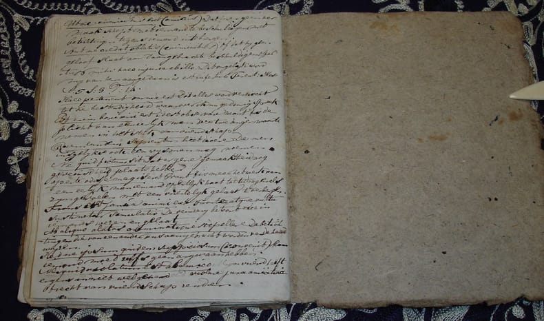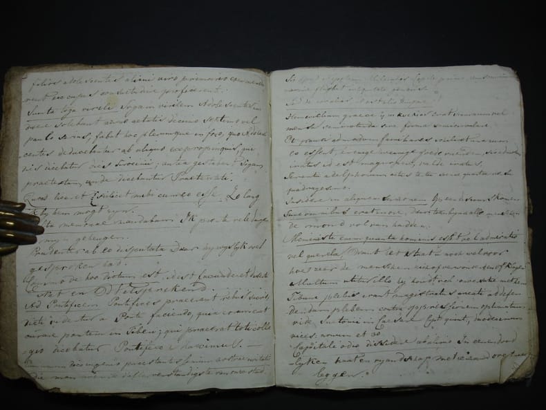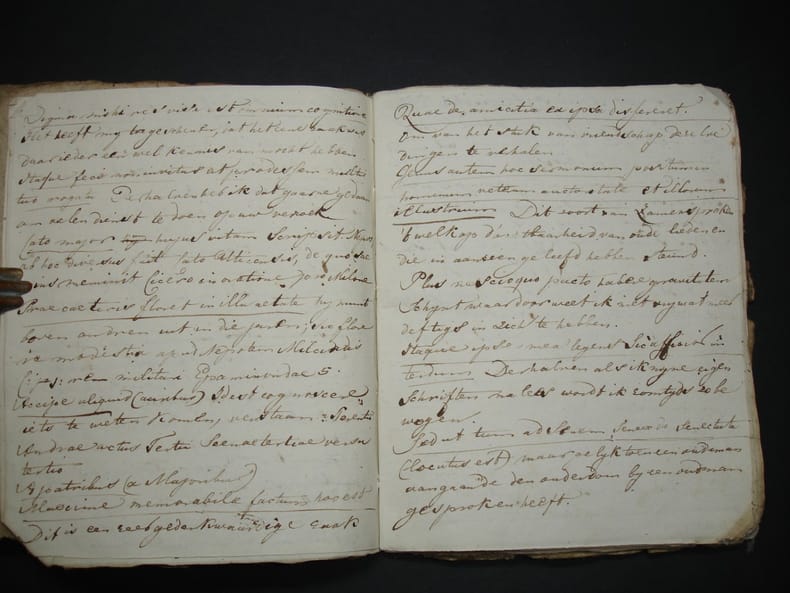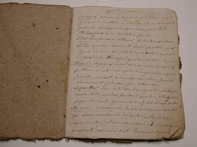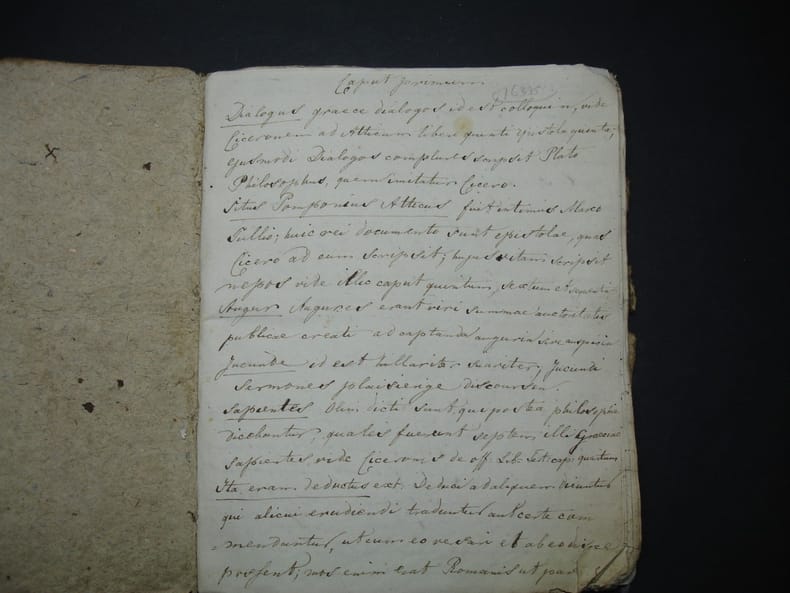 Boards. 20 cm (Details: The handwriting, which is of the first half of the 18th century, is hasty but very well legible. The leaves are bound by pamphlet stitch, within plain grey boards. (Condition: Right lower corner somewhat dog-eared; some small damage to the right lower corner of about 12 pages, with the loss of some letters) (Note: The notes are from the hand of a Dutchman. They explain words, verbs, and syntax and offer references to other works of Cicero and other writers, especially Nepos. Regularly Latin expressions and phrases have been translated into Dutch)(Photographs on request)