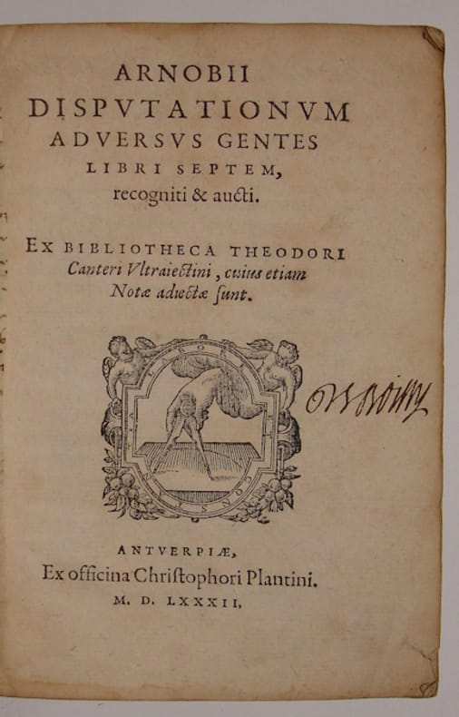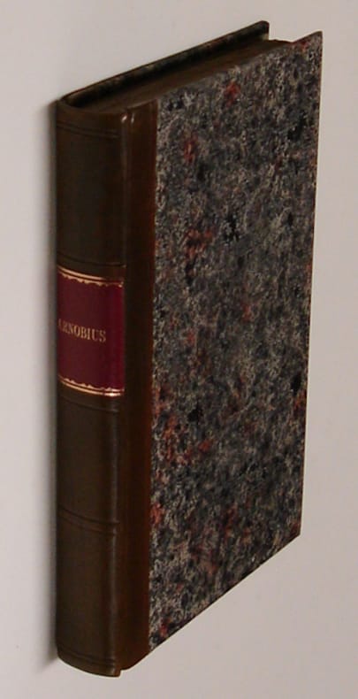 8vo. 285,(1 errata, & 2 blank) p. Tasteful modern half calf. 18 cm (Ref: Belg. Typ. 172; STC Dutch p. 14; Adams A1996; Voet 596 variant A; Sorgeloos 113; Dibdin 1,215: 'An excellent edition, in which the modesty and learning of its editor are successfully opposed to the rashness of his predecessor Gelenius' (in his edition of 1546); Ebert 1219; not in Brunet) (Details: Woodcut printer's device on the title. Red morocco letterpiece on the back. The binder used a broad strip of vellum as spine lining; this strip was probably cut from an old manuscript contract) (Condition: Name on the title. Very small tear near the right lower corner of the title. Occasional old ink underlinings on ca. 70 pages. Right margin of the last 60 pages slightly waterstained, the last gathering however more so) (Note: Arnobius, a teacher of rhetoric at Sicca Veneria in Numidia, 'was suddenly converted to Christianity (ca. A.D. 295) and a year or two later, at the instance of his bishop, he wrote seven books 'Adversus Nationes', 'Against the Pagans'. 'His work throws light on the Christian-pagan debate immediately before the Great Persecution, while the venom of his attack on traditional Roman paganism shows that this was by no means dead'. (OCD 2nd edition p. 122) His style is easy-flowing. Arnobius makes little use of the New, and none of the Old Testament. His view of God is platonic. The unintended side effect of the efforts of Arnobius and other Church Fathers to ridicule or crush paganism, was that their writings form an archive which preserves knowledge and practices of polytheism in the years of its decline in late antiquity. Just as the early christians bolstered their piety by contrasting it with the demonic foulness of pagan religion, so the protestants of the 16th century used their knowledge of pagan idolatry to scourge their catholic adversaries. Critics of Catholicism, like Calvin, compared catholic mass e.g. with the bloody rituals of the pagans, and used the sacrifices of the ancients to score theological points against their opponents. 'Protestants detected in the Catholic cult of images, the pagan idols so well described by late antique critics like Arnobius'. (The Classical Tradition, Cambr. Mass., 2010, p. 678, s.v. Paganism) The work of Arnobius was first published in Rome in 1542 (although the preface is dated 1543). Other editions followed in 1546, 1560 and 1580. Our edition of 1582 was produced by the Dutch scholar Theodorus Canterus (Dirk Canter), 1545-1617. He followed the edition of Gelenius of 1546, who sometimes rewrote the text 'ope ingenii' to make difficult passages intelligible. Canterus inserts some modifications of his own, and returns for readings to the 'editio princeps' of 1542, edited by Faustus Sabaeus. This was a wise policy and a sensible thing to do. Canter's textual and exegetical notes appear as endnotes. (See for Canter and his Arnobius edition 'History of Scholarship: A Selection of Papers from the Seminar on the History of Scholarship Held Annually at the Warburg Institute', edited by Christopher Ligota, Jean-Louis Quantin. Oxford University Press, 2006, page 97-100). The history of classical philology saw strange creatures, and Dirk Canter sure was one. He was the brother of the great classical scholar Willem Canter, studied classics in Paris under Lambinus, but was the rest of his life primarily a political and religious adventurer in his hometown, the city of Utrecht. He was there mayor, political agitator, religious opportunist and extremist, a conspirator to overthrow the government of the city to seize power. He was banished in 1611. Still he managed to find time to produce this excellent scholarly edition and other philological work, such as 'Variarum lectionum libri duo', Antwerp 1574) (NNBW 1,558) (Provenance: the signature on the first and last page is probably of a member of the Soissy family, originating from the Champagne) (Collation: A-S8 (leaf S8 blank) (Photographs on request)