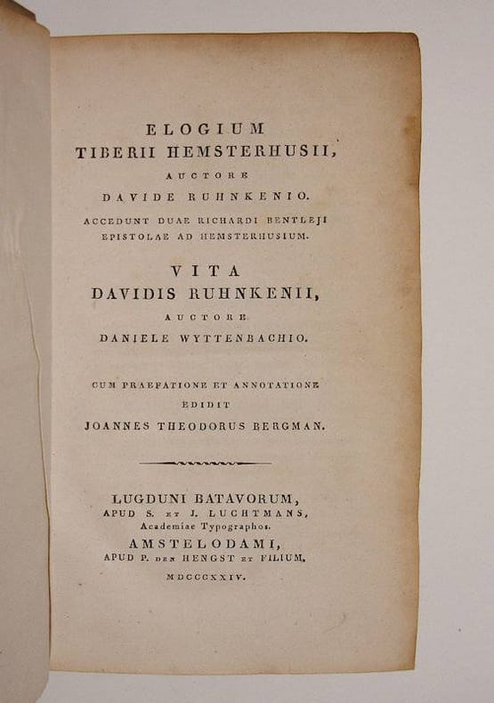 8vo. (VIII),XLIV,(IV);532 p. Vellum 22 cm (Ref: Ebert 24055: 'Beste Ausgabe dieser beiden Meisterwerke'; Graesse 6/1,191 & 6/2,481; Spoelder p. 545, Dordrecht 2) (Details: Prize copy, but without the prize. Back and boards gilt, gilt coat of arms of Dordrecht in the centre of both boards. The last 230 pages contain the notes of Bergman) (Condition: Prize gone. Vellum age-toned, back soiled, red label in the 'second compartment' gone. Upper board slightly curved. Several marginal pencil annotations and some foxing) (Note: The honour of reviving the study of Greek in the Netherlands belongs to the Dutch classical scholar Tiberius Hemsterhuis, 1685-1766, who became professor Mathematics and Philosophy at the Athenaeum of Amsterdam at the age of 19. His great example was the English classical scholar Richard Bentley, 1662-1742, Master of Trinity College, Cambridge, with whom he corresponded early in his career. In 1705 Hemsterhuis was promoted to a professorship in Harderwijk, and in 1717 he was appointed professor of Greek at the University of Franeker. In 1740 he was finally called to Leiden. He produced an edition of Pollux (1706), 'Luciani colloquia et Timon' (1708), the complete works of Lucianus (1743) and of the Plutus of Aristophanes (1744), a work which Gudeman calls 'epochemachend'. He contributed also notes to the editions of many other scholars. Sandys observes that 'the work of a Hemsterhuis was worth whole bundles of the mechanically manufactured products of a Burman'. (Sandys 2,451) Hemsterhuis was the founder of a Dutch school of criticism, the so-called 'Schola Hemsterhusiana', which had disciples in Valckenaer, Jacob van Lennep and David Ruhnken. The last one was the most famous of his pupils. 'Hemsterhuis has had the supreme felicity of being immortalised by a 'laudator eloquentissimus'. The 'Elogium' delivered in 1768 by his devoted pupil Ruhnken (...) is one of the Classics in the History of Scholarship. It presents us with the living picture of the perfect critic'. (Idem, ibidem) The Dutch scholar of German origin David Ruhnken, or Ruhnkenius, 1723-1798, was born in Pommern, and was sent by his parents in 1737 to the Friedrichscollegium in Königsberg, where he read Latin authors together with his friend Immanuel Kant. To finish his studies he went in 1744 to Leiden, to study Greek under Tiberius Hemsterhuis, whom he admired. He later told his biographer Wyttenbach that he found in his teacher the combined gems of Leiden classical scholarship, Scaliger and Salmasius, in one person. Hemsterhuis wanted to create a worthy successor and appointed him in 1757 to assist him as Reader in Greek. In 1761 Ruhnken succeeded the Latin chair vacated by Oudendorp. He became one of the leading scholars of his days. 'Die Führerstellung der Philologie erbte (...) von Hemsterhuys der Pommer David Ruhnken, der ganz zum Holländer ward und die vornehme und behäbige Würde eines Princeps criticorum zu wahren wusste. Als solchem hat ihm Fr.A. Wolf die Prolegomena gewidmet. (...) Musterhaftes Latein galt ihm soviel wie Wissenschaft. Aber als Lehrer muss er glänzend gewesen sein. (...) Alles was Ruhnken veröffentlicht hat, ist in seinen Grenzen tadellos'. (U. von Wilamowitz-Moellendorff, Geschichte der Philologie, Lpz./Bln. 1921, p. 39/40) Ruhnken was immortalized by Daniel Wyttenbach, 1746-1820, born at Bern in Switzerland, who came to Holland in 1770 to stay there, like Ruhnken before him. 'In the next 28 years he held professorships at Amsterdam (1771-99), and then returned to Leyden as Ruhnken's successor for 17 years (1799-1816)'. (Sandys 2,463). He published an edition of the complete Moralia of Plutarchus (with Latin translation) (1795-1806), a work of permanent value. On the death of Runken he became the most influential classical scholar in the Netherlands. 'The highest praise must be assigned to his Life of Ruhnken, a work of absorbing interest to his scholarly contemporaries, which still retains its importance as a comprehensive picture of the Scholarship of the Netherlands, and not of the Netherlands alone, in the age of Ruhnken'. (Idem 2/465)) (Provenance: in ink on front flyleaf: 'W.J.W. Kosteri ex libris'. The specialties of the Dutch scholar Willem Johan Wolff Koster, 1896-1986, were metrics and Aristophanes. In his dissertation 'De Re Metrica tractatus Graeci inediti' , Leiden 1922, he argued that the current views concerning Greek metrics were founded on an unstable basis, and that it would be wise to return to the sources, the ancient tractates on metrics. Very influential was his 'Traité de métrique grecque' of 1936, 4th. edition 1966. In 1940 he was appointed professor of Greek at the University of Groningen. Linked to his interest was his work on the metrics and the scholia of Aristophanes. In 1927 he already published 'Scholia in Aristophanis Plutum et Nubes', which was only the start of his 'opus magnum', the edition of the 'Scholia in Aristophanem', a scholarly entreprise of nearly half a century, that started in 1960 under his supervision, and then of D. Holwerda, who has seen it through to completion with the appearance of the scholia to the Thesmophoriazusae and Ecclesiazusae in 2007. This enormous project offers the first new critical edition of the complete scholia to Aristophanes since Dübner's in 1842. (J.C. Kamerbeek, 'Levensbericht W.J.W. Koster', in: Jaarboek, 1988, Amsterdam, p. 140/45. See also the review of R. Tordoff: 'R.F. Regtuit (ed.), Scholia in Thesmophoriazusas; Ranas; Ecclesiazusas et Plutum. Scholia in Aristophanem, III 2/3', Bryn Mawr Classical Review 2008.09.24)) (Collation: pi4, *-3*8; A-2K8, 2L2) (Photographs on request)