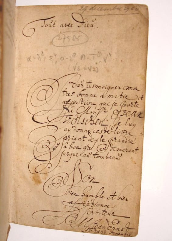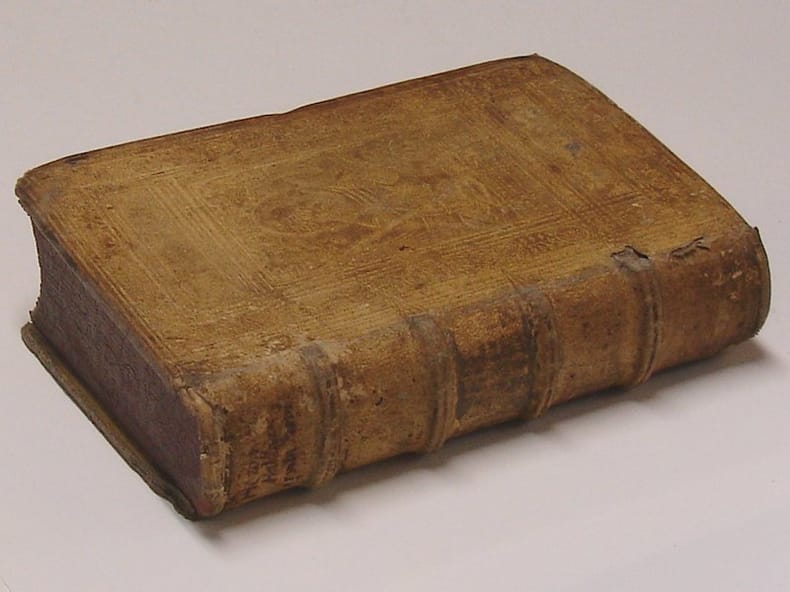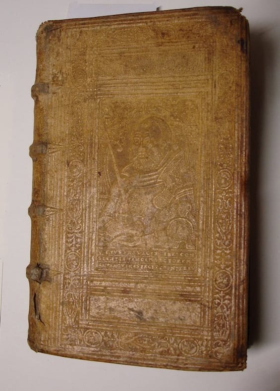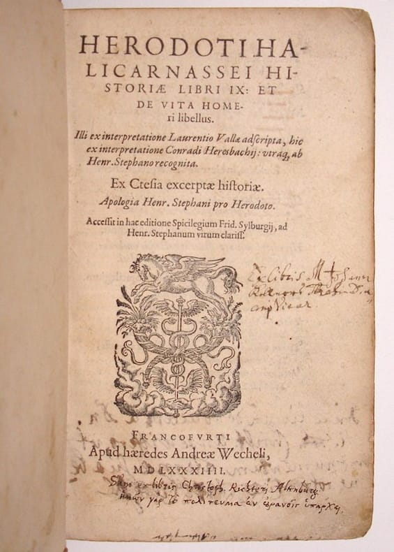 8vo. LXXII,592,(88) p. Pigskin 18.5 cm (Ref: VD16 H 2515. Weitere Nummern: VD16 C 6157, VD16 E 4005, VD16 H 2533; Hoffmann 2,236; Graesse 3,256; Ebert 9560, but see also 9542) (Details: Latin translation only. The binding of this book is important in the context of the cultural history of Lutheranism. The binding dates from the last 2 decades of the 16th century. The back has 4 raised bands. The boards are decorated with blind stamped triple fillet borders and a row consisting of floral motives and some tiny portraits. The central panel of the upper board shows a fine example of a well preserved portrait of Johann Friedrich I, the Magnanimous (der Grossmüthige), Elector of Saxony (Kurfürst und Herzog von Sachsen), 1503-1554, in full armour, with 3 lines of text at the bottom: 'Victus eras acie, fidei con / stantia tandem victorem / ante homines fecit et ante deum'; on the lower board the blindstamped impressive and also well preserved coat of arms of this Elector of Saxony, who became after his death a kind of protestant Saint. He still is, for the 3rd of March, the day he died, is still commemorated in the evangelical church of Germany. Because the portrait of this nobleman also figures on a book held in the Penn Libraries, where it is described as 'Elector of Saxony, possibly August I, 1526-1586' (Cicero, Philosophical works, 1565, copy in Rare Book & Manuscript Library, Call no.: LatC C4855.10 1565), we will investigate this in some detail. Johann Friedrich I was an ardent follower of Martin Luther, with whom he corresponded. He was a lifelong promotor of the reformatory movement, and one of the movement's most important political leaders. Johann Friedrich was defeated and taken prisoner on the 24th of april 1547 by troops of the emperor Charles V in the neighbourhood of Mühlberg (battle of Mühlberg), 'mannhaft fechtend, am Backen verwundet'. (On this wound on the cheek and the resulting scar, see below) On the 10th of May he was sentenced to death. This sentence was not carried out. Johann Friedrich had however to abdicate, but he refused to be converted to Catholicism. In captivity his political role came to an end, but in prison he became a protestant Saint. 'Mit diesem jähen Sturzen, war Johann Friedrichs politische Rolle zu Ende. Nicht aber seine politische Bedeutung für das evangelische Deutschland. Die heitere Ruhe mit dem er sein Unglück hinnahm, die Unerschütterlichkeit seiner religiösen Überzeugung (...) machten ihn zum leuchtende Vorbilde seiner Glaubensgenossen (...)'. Charles V tried to force him to accept catholicism, he humiliated him, but 'Alles, erklärte er (J.Fr.), habe er bisher hintangesetzt, um das Wort Gottes lauter und rein zu erhalten. Obwohl er bereits Alles verloren und ein armer Gefangener geworden, solle ihn doch Gott davor behüten, dass er nun zu letzt noch davon abweichen, die erkannte Wahrheit verleugnen, und das Papstthum annehmen solle'. The duke was released in 1552, and his way home was a real triumph. 'Die Heimkehr des fürstlichen Martyrers über Nürnberg und Bamberg glich einem Triumphzuge; wohin er kam, strömte das Volk ihm entgegen. (...) Zu Jena empfingen ihn Professoren und Studenten der neubegründeten Universität'. (...) Melanchthon wrote after his death: 'Die Bekenntniss und Beständigkeit Herzog Johann Friedrichs, hat unsere Kirche mehr gefrommt, als vielleicht die Victoria hat dienen mögen'. (German quotations: ADB 14 p.326/330) In 1551 Matthes Gebel made a medal with the portrait of a bearded duke, with a clearly visible scar on his left cheek. There is also an engraved portrait with a scar made in 1547, the year of the battle of Mühlberg. This scar on the left cheek, which is apparantly part of the iconography of the Duke, is also clearly visible on the blindstamped portrait on the front of this book. So our conclusion must be that this portrait belongs to Johann Friedrich I. The coat of arms on the backcover was made after an engraving of Lucas Cranach, a friend of Johann Friedrich. In Jena there is a statue of Johann Friedrich, the socalled 'Hanfried-Denkmal' to commemorate the founding of the University in 1558, of which Johann Friedrich had been the driving force. The 'Deutsches Historisches Museum' holds a number of paintings (1630), which depict the life of this protestant Saint in 28 scenes. Wechel's woodcut printer's mark on the title, depicting the winged horse Pegasus gracefully arched over a caduceus and 2 intertwined cornucopiae) (Condition: Cover soiled and worn at the extremities. Some damage to the head and tail of the back, and to the upper board. Corners heavily bumped. 2 old ownership inscriptions on the title. Small inscription with references to Cicero on the front pastedown. Small inscription on the verso of the title. Occasional old red ink underlinings. Occasional marginalia in the Apologia, probably made by Christoph Richter (see below) (Note: This book is a reissue of a revised Latin translation of Herodotus' 'Historiae', made by Lorenzo Valla, and published by the French humanist/scholar Henri Estienne, or in Latin Henricus Stephanus, in Geneva in 1566. Stephanus plays an important role in the history of the reception of Herodotus. In 1474 the Latin translation of Valla was first published. 1502 saw the 'editio princeps' of the Greek text. In the same time the work of the detractors and critics of this Greek historian came on the market, especially Plutarch's 'De Herodoti malignitate' (1509), but also works of Aristotle (Herodotus is ignorant), Flavius Josephus (he is a liar), Strabo (he likes to tell simple stories), Lucianus (does not tell the truth), Gellius (he invents stories). The supporters of Herodotus were in the minority. We only mention Cicero, who called him 'Pater historiae'. When Henri Estienne was planning to publish a new revised Latin translation of Herodotus, he decided to try his talents as a critic on Herodotus, and wrote in his defence his 'Apologia pro Herodoto', to accomp