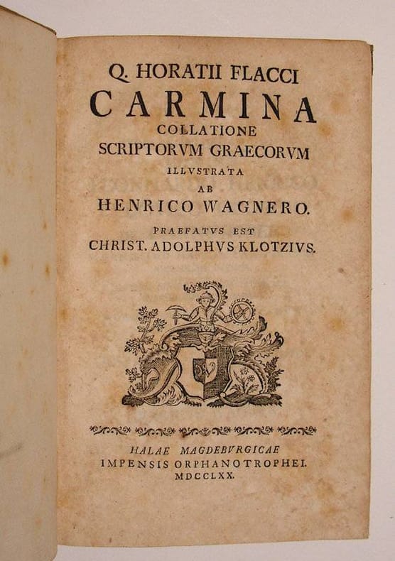 8vo. (VIII),XXII,136 p. Contemporary boards 20 cm (Ref: not yet in VD18; Schweiger 2,461; Ebert 10280; Brunet 6, no. 12507) (Details: Woodcut printer's mark on the title) (Condition: Binding scuffed and spotted. Owner's inscriptions written on the front endpapers. First and last leaves browning, the rest is yellowing) (Note: The works of the Roman poet Quintus Horatius Flaccus, 65-8 B.C., have enjoyed a continuous presence in European culture. His memorable phrases made him the most quoted ancient author. Till well into the 20th century he stood central in school curricula. Earlier, in the Middle Ages, he was next to Vergil the most important school author. Horace is transmitted in around 300 medieval manuscripts. The Renaissance saw the beginning of a flood of editions. 'For Neo-latin poetry until modern times, and for all the vernacular literature of Europe from the 16th through the 18th centuries, Horace provided the dominant model both for private lyrics celebrating wine and love and for public lyrics celebrating affairs of state'. Young poets used Horace to learn the trade. 'Horace's elegant rationalism and moral wisdom, and also his disabused and tolerant tone, made his poems favorite reading during the Enlightenment'. (The Classical Tradition, Cambr. Mass., 2010, p. 454/60)) The style of many of Horace's poems displays polished techniques derived from Hellenistic Greek poetry. In his odes Horace claims the early Greek lyric poets Sappho and Alcaeus as his models, and to have introduced into Latin poetry their style and rythms. The German jurist Heinrich Wagner (Henricus Wagnerus), 1747-1814, tried in his 'Horatii Flacci Carmina collatione' to locate the Greek sources of Horace's poetry. (For Wagner see 'Killy Literaturlexikon', 2nd edition, 2011, vol. 12, p. 73/74)) (Provenance: On the front pastedown: 'Schol. Gustrov. acc. 1816'. This school is the 'Domschule' at Güstrow, in Northern Germany, a 'schola latina' founded in 1552, and later transformed into a Gymnasium. In 1942 the school was merged with the local Realgymnasium. Its new name was 'Vereinigte John-Brinckman-Schule und Domschule'. Nowadays it is called the 'John-Brinckman-Gymnasium'. On the flyleaf: 'No. 58 May 1788'. On the same leaf in a different hand: first an erased name, and then: 'Hic liber a Professore nostro, viro generosissmo, XIVa Cal. Mart. 1802 mihi est datus'. Car. Piper') (Collation: *4, )(-2)(8, -H8, I4) (Photographs on request)