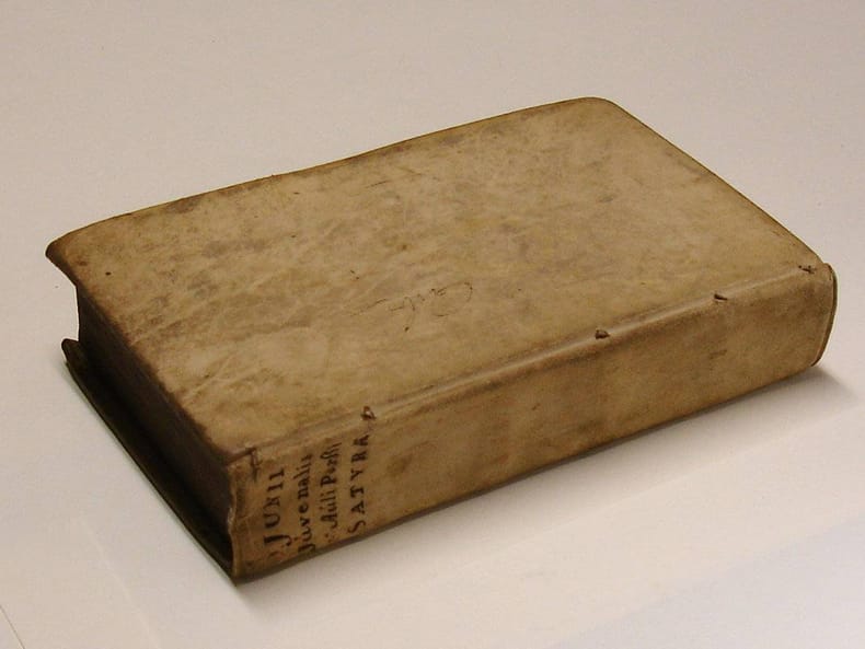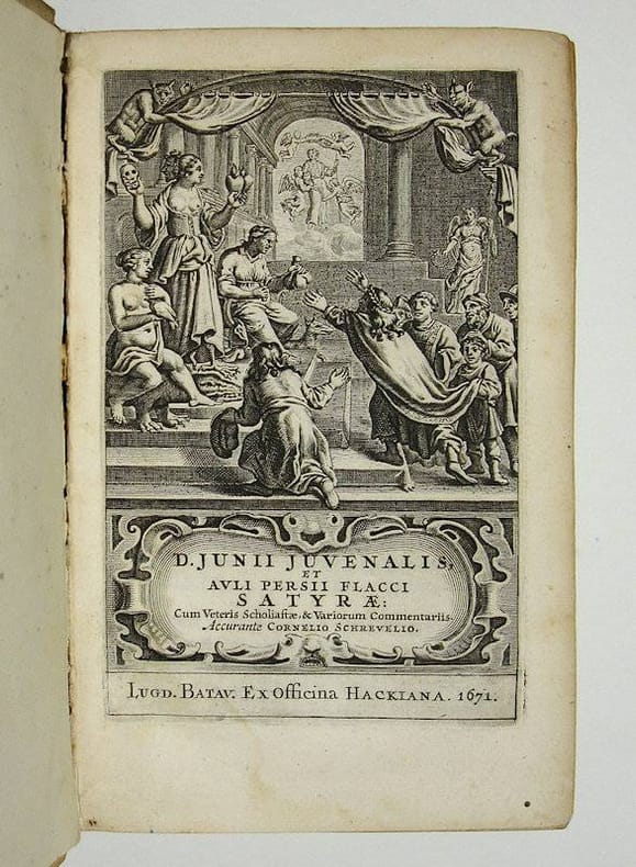 8vo. (XVI),604,(42 index) p. Vellum 20 cm (Ref: STCN ppn 840013876; Schweiger 2,511; Dibdin 2,154; Moss 2,158/9; Ebert 11242; Graesse 3,520) (Details: 5 thongs laced through both joints. Short title in ink on the back. The engraved title, which is not signed, is used here for the third time. It was first used for the original edition of 1648, for a repetition in 1658, and for this 1671 reissue. In 1648 the engraved title still bears the name of the engraver, it is executed by the Dutch Golden Age engraver Reinier van Persijn. The title depicts a complicated allegorical scene: on the left a naked woman sitting on a crocodile, holding in her hand a parrot; then a Janus-headed woman, with bird feet and a tail, holding up in her left hand a Momus-mask, and in her right 2 flaming hearts; in the centre sits on a throne an old woman, holding in her left hand a sack of money (?), and in her right what seems a little flask; on the right in the foreground a king reaching for that sack; he is accompanied by a priest, a farmer (?) and a soldier; in a window central above the old woman we see the ascension of the poet. See for an explanation of the allegory the note below) (Condition: Vellum age-toned and soiled. Boards worn at the extremities. Front hinge cracking but still strong. Front flyleaf loosening. Name on the front flyleaf. Small old inscription on the rear pastedown. Occasional small ink underlinings. Small wormhole in the right lower corner of the first 14 gatherings, never even coming near to the text) (Note: The Roman poet Juvenalis, ca. 55-140 AD, was the last and most influential of the Roman satirists. He 'uses names and examples from the After p. 65 has been added a plate showing a allegoric triumph scene with prince Frederik Hendrik of Orange. See for this plate: rkd.nl/nl/explore/portraits/record?filters[plaats][]=Den+Haag&filters[kunstenaar][] =Vinckboons%2C+David+%28I%29&query=&start=2)past as protective covers for his exposés of contemporary vice and folly'. His main theme is the dissolution of the social fabric. (The Classical Tradition, Cambr. Mass., 2010, p. 501) The satires of the stoic poet Aulus Persius Flaccus form one 'libellus' of 6 satires, together 650 hexameters. 'They are well described as Horatian diatribes transformed by Stoic rhetoric'. 'He wrote in a bizarre mixture of cryptic allusions, brash colloquialisms, and forced imagery'. (OCD, 2nd ed. p. 805) This edition of 1671 is a 'Variorum' edition. It offers the 'textus receptus' which is widely accepted, accompanied with the commentary and the annotations of specialists, taken from earlier useful, normative or renewing editions. Editions like these, 'cum notis Variorum', were useful, but never broke new ground. The production of this kind of editions was the specialty of Dutch scholars of the 17th and 18th century. The compilers seldom were great scholars, but often hard working schoolmasters. Their involvement in publishing a new edition was limited to the necessary, but ungrateful task of the beast of burden. Such a plodder was the Dutch editor Cornelius Schrevelius, who taught classics at the Schola Latina at Leiden, where he had been raised himself. In 1642 he succeeded his father, Theodorus Schrevelius, as the rector (Moderator) of the school. He raised at least 11 kids, and fell in 1664 victim to the then raging plague. His first Juvenal edition he published in 1648, and it was reissued by Hackius in 1658, 1664 and in 1671. Schrevelius' aim was to promote the studies of his young students and to instill in them a necessary fear (optatam metam), which would make them useful citizens and the pride of their parents. Juvenal is a suitable author for such an enterprise, for he flogs wrongdoers, and learns them to avoid the path of wickedness and to embrace honesty. (Dedicatio p. *2 verso) Especially in shameless times as ours, he continues, satyre is needed. Decent behaviour and faith have been replaced by deceit and swindle. In a short 'Benigno Lectori' (*4 verso and *5 recto) Schrevelius tells that he relies for the text on the earlier editions of Robertus Stephanus and Pithoeus, and that he excerpted the notes and commentaries of Lubinus, Farnabius and Casaubon. In addition he offers, he says, a complete and emendated edition of the old Scholiast. Schrevelius even used two excellent manuscripts which were lent to him by the Leiden professor Salmasius, which, he tells, helped him to solve many difficult problems. The engraved title deserves some attention. The easiest description we found was 'an engraved title with many figures'. To us, it seems an allegorical scene based on the tenth satire, Juvenal's famous declamation on the folly of men in desiring in their prayers from the gods vane things as honor, fame, wealth, power, beauty, or a long life, instead of a sane spirit in a healthy body. 'Whole households have been destroyed by the compliant gods in answer to the masters' prayers. In camp (nocitura militia) and city (nocitura toga) alike we ask for things that will be our ruin'. (Vss. 7/9, in the Loeb-translation of Ramsay) Juvenal offers a list of pityful examples, such as the once powerful Sejanus, who like the Libyan general Gadaffi many centuries later was 'being dragged along by a hook, as a show and joy to all'. (Vss. 66/67, translation Ramsay) Victims of their lust for power were Alexander the Great, Xerxes, or the punic conqueror Hannibal, the man who was once about to destroy Rome. We assume that the royal figure who reaches out for the sack of money, or from whose hands it is being snatched, is Hannibal. The clue for this assumption is the woman on the crocodile. Such a woman was in 17th century iconography the common personification of Africa, for instance on maps. The fate of this scourge of Rome is treated by Juvenal in evocative language in 20 beautiful verses. It begins like this: 'Put Hannibal into the scales; how many pounds' weight will you find in that greatest of commanders? This is 