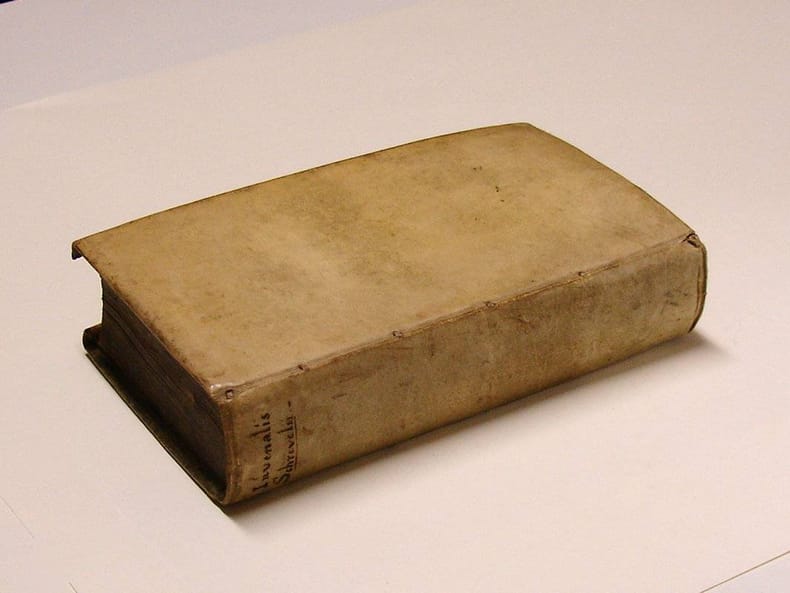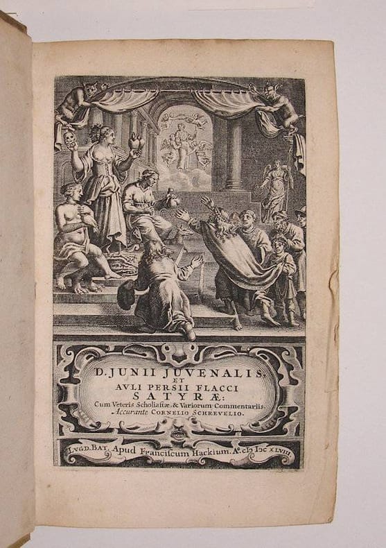 8vo. (XVI),604,(42 index) p. Vellum 20 cm (Ref: STCN ppn 840013876; Schweiger 2,511; Dibdin 2,154; Moss 2,158/9; Ebert 11242; Graesse 3,520) (Details: 5 thongs laced through both joints. Short title in ink on the back. The engraved title, which is not signed, is used here for the third time. It was first used for the original edition of 1648, for a repetition in 1658, and for this 1671 reissue. In 1648 the engraved title still bears the name of the engraver, it is executed by the Dutch Golden Age engraver Reinier van Persijn. The title depicts a complicated allegorical scene: on the left a naked woman sitting on a crocodile, holding in her hand a parrot; then a Janus-headed woman, with bird feet and a tail, holding up in her left hand a Momus-mask, and in her right 2 flaming hearts; in the centre sits on a throne an old woman, holding in her left hand a sack of money (?), and in her right what seems a little flask; on the right in the foreground a king reaching for that sack; he is accompanied by a priest, a farmer (?) and a soldier; in a window central above the old woman we see the ascension of the poet. See for an explanation of the allegory the note below) (Condition: Vellum age-toned and soiled. Boards worn at the extremities. Front hinge cracking but still strong. Front flyleaf loosening. Name on the front flyleaf. Small old inscription on the rear pastedown. Occasional small ink underlinings. Small wormhole in the right lower corner of the first 14 gatherings, never even coming near to the text) (Note: The Roman poet Juvenalis, ca. 55-140 AD, was the last and most influential of the Roman satirists. He 'uses names and examples from the After p. 65 has been added a plate showing a allegoric triumph scene with prince Frederik Hendrik of Orange. See for this plate: rkd.nl/nl/explore/portraits/record?filters[plaats][]=Den+Haag&filters[kunstenaar][] =Vinckboons%2C+David+%28I%29&query=&start=2)past as protective covers for his exposés of contemporary vice and folly'. His main theme is the dissolution of the social fabric. (The Classical Tradition, Cambr. Mass., 2010, p. 501) The satires of the stoic poet Aulus Persius Flaccus form one 'libellus' of 6 satires, together 650 hexameters. 'They are well described as Horatian diatribes transformed by Stoic rhetoric'. 'He wrote in a bizarre mixture of cryptic allusions, brash colloquialisms, and forced imagery'. (OCD, 2nd ed. p. 805) This edition of 1671 is a 'Variorum' edition. It offers the 'textus receptus' which is widely accepted, accompanied with the commentary and the annotations of specialists, taken from earlier useful, normative or renewing editions. Editions like these, 'cum notis Variorum', were useful, but never broke new ground. The production of this kind of editions was the specialty of Dutch scholars of the 17th and 18th century. The compilers seldom were great scholars, but often hard working schoolmasters. Their involvement in publishing a new edition was limited to the necessary, but ungrateful task of the beast of burden. Such a plodder was the Dutch editor Cornelius Schrevelius, who taught classics at the Schola Latina at Leiden, where he had been raised himself. In 1642 he succeeded his father, Theodorus Schrevelius, as the rector (Moderator) of the school. He raised at least 11 kids, and fell in 1664 victim to the then raging plague. His first Juvenal edition he published in 1648, and it was reissued by Hackius in 1658, 1664 and in 1671. Schrevelius' aim was to promote the studies of his young students and to instill in them a necessary fear (optatam metam), which would make them useful citizens and the pride of their parents. Juvenal is a suitable author for such an enterprise, for he flogs wrongdoers, and learns them to avoid the path of wickedness and to embrace honesty. (Dedicatio p. *2 verso) Especially in shameless times as ours, he continues, satyre is needed. Decent behaviour and faith have been replaced by deceit and swindle. In a short 'Benigno Lectori' (*4 verso and *5 recto) Schrevelius tells that he relies for the text on the earlier editions of Robertus Stephanus and Pithoeus, and that he excerpted the notes and commentaries of Lubinus, Farnabius and Casaubon. In addition he offers, he says, a complete and emendated edition of the old Scholiast. Schrevelius even used two excellent manuscripts which were lent to him by the Leiden professor Salmasius, which, he tells, helped him to solve many difficult problems. The engraved title deserves some attention. The easiest description we found was 'an engraved title with many figures'. To us, it seems an allegorical scene based on the tenth satire, Juvenal's famous declamation on the folly of men in desiring in their prayers from the gods vane things as honor, fame, wealth, power, beauty, or a long life, instead of a sane spirit in a healthy body. 'Whole households have been destroyed by the compliant gods in answer to the masters' prayers. In camp (nocitura militia) and city (nocitura toga) alike we ask for things that will be our ruin'. (Vss. 7/9, in the Loeb-translation of Ramsay) Juvenal offers a list of pityful examples, such as the once powerful Sejanus, who like the Libyan general Gadaffi many centuries later was 'being dragged along by a hook, as a show and joy to all'. (Vss. 66/67, translation Ramsay) Victims of their lust for power were Alexander the Great, Xerxes, or the punic conqueror Hannibal, the man who was once about to destroy Rome. We assume that the royal figure who reaches out for the sack of money, or from whose hands it is being snatched, is Hannibal. The clue for this assumption is the woman on the crocodile. Such a woman was in 17th century iconography the common personification of Africa, for instance on maps. The fate of this scourge of Rome is treated by Juvenal in evocative language in 20 beautiful verses. It begins like this: 'Put Hannibal into the scales; how many pounds' weight will you find in that greatest of commanders? This is 