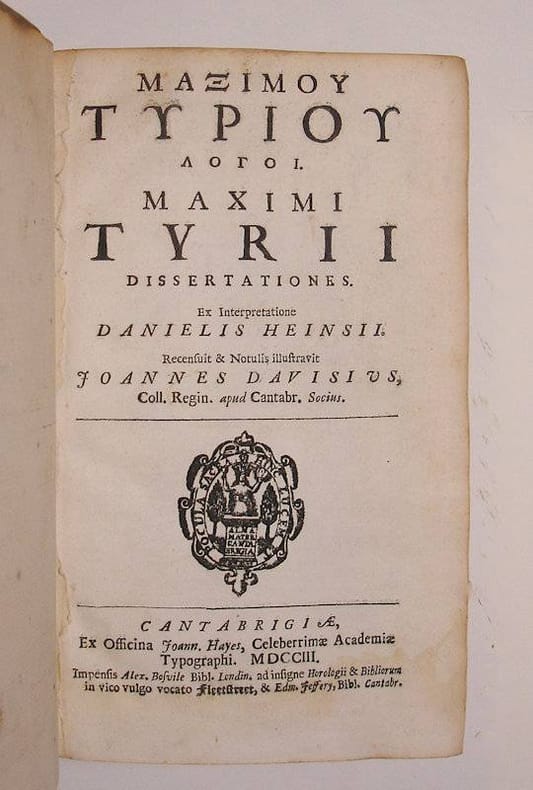 8vo. (XVI),435,(1 blank);(10 index),(2 blank) p. Vellum 20 cm (Ref: ESTC Citation No. T98323; Hoffmann 2,586: 'Diese Ausgabe übertrifft die früheren'; Dibdin p. 2,233: 'Foreign critics seem to consider Davies the best editor of Maximus Tyrius. (...) but it is to be regretted that Heinsius's notes are not given entire. At the bottom of each page some short critical and historical observations are given; and there are two very useful indexes'; Brunet 3,1552; Graesse 4,453; Ebert 13454: 'Die Anmerkungen sind theils kritisch, theils die Geschichte der Philosophie betreffend'; Spoelder p. 578, 's-Gravenhage 3) (Details: Prize copy, without the prize. 6 thongs laced through the joints. Boards with double fillet gilt borders and the coat of arms of The Hague in the center. Woodcut printers' mark on title, with the University's motto: 'Hinc lucem et pocula sacra', 'From this place, we gain enlightenment and precious knowledge'. At the end is bound a manuscript 'actio gratiarum' of 16 lines, i.e. a note of thanks. (See Provenance below)) (Condition: Vellum slightly scratched and soiled. Lower margin of the first 30 p. very slightly waterstained. Prize gone) (Note: The Greek Platonist Maximus Tyrius, ca. 125-185 AD, was an itinerant philosopher/lecturer, who lived during the Second Sophistic, and left us 41 dissertations (dialexeis) on theological, ethical and philosophical subjects. The lectures were delivered in Rome, apparently during the reign of Commodus (180-92). They deal with ethics, physics, theology and epistemology, but are not great literature, nor specimina of great learning. Themes are for example: 'die Lust (hêdonê, 29-33), sokratische Liebe (18-22), platonische Theologie (11), 'daimones' (8-9), Gebet (5), Weissagung und freier Wille (13), das Böse (41) und Wiedererinnerung (10)'. (Neue Pauly, 7,1074/75) Maximus Tyrius 'was well read in Greek literature, but apparently not in Greek philosophy except in Plato, of whom he claimed to be a follower. His lectures show no philosophical originality, and are simple eloquent exhortations to virtue decked out with quotations, chiefly from Plato and Homer'. (OCD 2nd ed. p. 658) As a philosophic orator he is comparable with contemporaries like Dio Chrysostomus and Apuleius. He was widely read by the humanists of the 15th century, e.g. Poliziano, Bessarion, Lascaris, Reuchlin. The 'editio princeps' was published in 1557 by the French scholar/publisher Henricus Stephanus. The next important and authorative edition was published in 1607 by the Dutch classicist Daniel Heinsius, 1580-1655. The English scholar John Davies, Fellow of Queens' College at Cambridge based the Greek text of his edition on that of Stephanus, he tells us in the 'praefatio', and adopted the Latin translation of Heinsius with corrections, and with notes and 2 useful indexes of his own. (p. *4 verso) John Davies, or Joannes Davisius, 1679-1732, studied at Queens College, of which he was elected fellow, and subsequently became Rector, or Praeses, in 1717. He chiefly devoted his attention to the philosophical works of Cicero. His editions show great learning and knowledge of the history of and the systems of ancient philosophy. Davies also produced editions of Caesar, Minucius Felix and Lactantius. He was a friend and ally of the greatest classical scholar of his age Richard Bentley) (Provenance: At the end has been added a leaf with the text of the 'Actio gratiarum' of the schoolboy who received this book: 'Celeberissime Princeps. Nobilissimi atque Amplissimi Scholae curatores. Doctissime Rector. Quanto diligentius vestram in me munificentiam mente agito, tanto amplior beneficii vestri magnitudo mihi videtur, Viri Nobilissimi, quod praemio hoc magnifico iterum decoratus laudibusque et victoria clarus in altiorem militiae scholasticae gradum promoveor. Quocirca nolite dubitare, Curatores nobilissimi, sinceram benignitatis vestrae memoriam nullo apud me tempore esse intermorituram. Credite vero nihil unquam quidquam deincpes mihi dulcius fore, quam si meum in Vos animum gratissimum meamque observantiam Vobis probare queam'. See for this kind of speeches Spoelder, Prijsboeken op de Latijnse School. Amsterdam 2000, p. 176/184) (Collation: *8, A-2E8 (leaf 2E8 blank)) (Photographs on request)