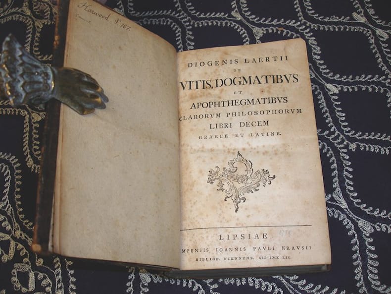 8vo. (XIV),756 (recte 736),(94 index) p. Contemporary calf. 19.5 cm The greatest known source of information about the philosophers of antiquity (Ref: VD18 10213392-008; Hoffmann 1,566; Dibdin 1,504; Moss 1,400/01; Brunet 2,720; Graesse 2,396; Ebert 6177) (Details: Printed in 2 colums, Greek text with facing Latin translation) (Condition: Binding scuffed & chafed, especially at the extremes. Back & boards rubbed. Paper foxing, yellowing and occasionally browning. Right upper corner of the last 80 p. is slightly waterstained. Some small and old ink annotations and underlinings) (Note: The 'Lives and Doctrines of the Philosophers' of the Greek author Diogenes Laertius, who lived probably in the first half of the third century A.D., is still 'our best indirect source of knowledge for classical philosophy'. The 'Lives' comprises both a biographical and a doxographical account, basically focused on Greek thinkers from the 6th to the 3rd century B.C. (from Thales to Epicurus), although references to schools and individuals extend to at least the 2nd century A.D.' (The Classical Tradition, Cambr. Mass. 2010, p. 271) Diogenes Laertius drew his material from earlier compilations, and his doxographic account offers long excerpts from primary texts not transmitted elsewhere, for example Epicurus' 'Principal Doctrines'. Diogenes' reliability and value differ from passage to passage. Some give invaluable information, other passages offer mere caricature. His approach is not a 'systematic analysis, but rather a eulogistic narrative of the course of ancient philosophy, and of the four main classical schools, the Academy, Peripatetics, Stoics and Epicureans. Anecdotal and perhaps largely apocryphal in nature, still it gave to Renaissance humanists, like Leonardo Bruni, Machiavelli, Erasmus et alii, some conception of ancient philosophy, especially of Platonic and Epicurean thought.' (Ch.L. Stinger, 'Humanism and the Church Fathers: Ambrogio Traversari (1386-1439) and Christian antiquity in the Italian Renaissance', Albany 1977, p. 71) The 'editio princeps' was published in Basel in 1533. The Latin translation was published much earlier in Rome in 1472. This translation was later revised several times and appears also in this book. It was made by the Italian Hellenist Ambrogio Traversari, also known as Ambrosius Traversari, 1386-1439. Our 1759 edition is a reissue of the edition of 1731 of Longolius, which in turn was a revision of the 1692 edition, which was produced by the Danish philologist Marcus Meibom, or Marcus Meibomius. The edition of 1731 was produced by the German philologist and historian Paulus Daniel Longolius, 1704-1779, from 1735 till his death Rector of the Gymnasium in Hof. He wrote on local history and was an editor of Zedler's Universallexikon. He also published three texts of classical authors: 'Plinii epistolae' (Amsterdam 1734), this Diogenes edition (Curiae, i.e. Hof, Saale, 1739), and a Gellius edition (Curiae, 1741). (ADB 19, 156/57) The 1731 edition contained, besides the Greek text and Latin translation, a preface, commentaries and engraved portraits. Because this edition was out of print, and there was much demand for it, the publisher Paulus Krausius decided to produce this Leipsic edition of 1759, which is in fact a reissue of the 1731 edition of Longolius, omitting however the portraits, the preface and the commentaries, and offering the Greek text , the Latin translation, and 94 pages of indexes. (Praefatio leaf *5 verso and *6 recto) (Provenance: on the front flyleaf in pencil 'RtK', this is Rijkel ten Kate 1918-2008. He taught classics at the Willem Lodewijk Gymnasium in Groningen. In 1955 he wrote his dissertation: Quomodo heroes in Statii Thebaide describantur quaeritur, on the Thebaid of the Roman poet Statius) (Collation: *8 (minus blank leaf *8), A-3F8 (minus blank leaf 3F8); the pagination jumps between the gatherings 2Y and 2Z from 721 to 741, the catchword on leaf 2Y4 verso is correct)) (Photographs on request)