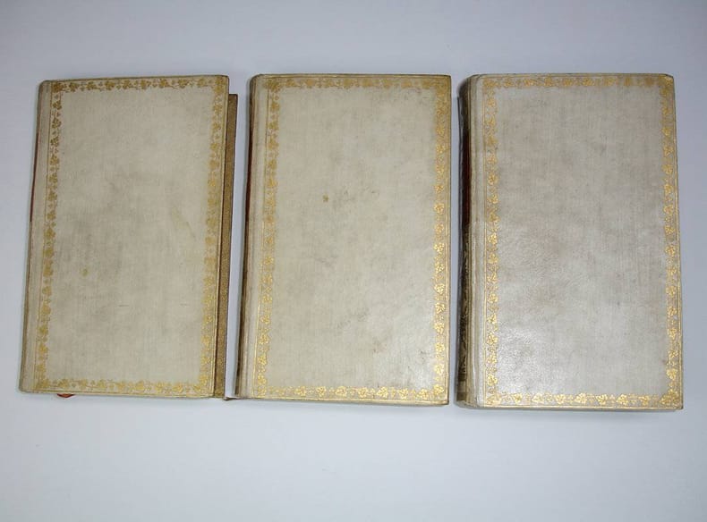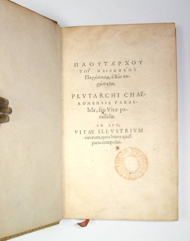 8vo. 3 volumes: vol. 1: (II),579,(1 blank); vol. 2: (2, = p. 581/82), p. 583-1213,(3 blank = p. 1214/16); vol. 3: p. (2 = p. 1217/18),1219-1923,(1 blank). 19th century vellum. 18 cm (Ref: GLN-2438; Renouard 134/35; Brunet 4,733; Hoffmann 3,171; Schweiger 2,258/9; Dibdin 2,336/7; Moss 2,507; Ebert 17406; Not in Graesse) (Details: These three volumes are the volumes 4, 5 & 6 of the 13 volume set 'Plutarchi Chaeronensis quae extant opera', which is the first edition of the complete works of Plutarch published by Henri Estienne in Geneva in 1572. The 3 volumes contain the complete Greek text of 'Ploutarchou tou Chairôneôs Parallêla, ê bioi parallêloi. Plutarchi Chaeronensis Parallela, seu vitae parallela', being tomus primus, secundus and tertius. Backs gilt with floral motives in 4 compartments. Red morocco shield on the backs. Boards with gilt borders that consist of a long floral wreath of wine leaves. Board edges decoratively gilt with complementary inside (inner) dentelles. Edges gilt. Marbled endpapers) (Condition: Bindings slightly soiled and very slightly scratched. Bookplate on the front endpaper of the first volume. Faint and small library stamp on the titles) (Note: The Greek philosophic stylist Plutarchus of Chaeroneia, ca. 46-120 A.D., wrote numerous short treatises on ethics and philosophy. He is however best known as historian and biographer. Plutarch composed with his famous 'Vitae' (or Parallel Lives), written ca. 100-120 A.D., a work of timeless quality. His aim was not writing history, but biography, so his chief interest was in the characters of the heroes and villains he portrayed, never avoiding a good story. Plutarch exercised a very profound influence on Western civilisation. His collection of 'Vitae' has been one of the most frequently and continuously read books of the Western tradition. Treacherous to the historian, Plutarch has won however since the Renaissance the affection of the many generations to whom he has been a main source of understanding of the ancient world, that is, early modern Europe discovered the ancient world through Plutarch's eyes. The Lives could gain an enormous impact by providing later biographers and literary authors an outstanding model. Authors like Montaigne, Corneille, Racine, Rousseau, Schiller and Shakespeare heavily drew upon the Lives. Until the 19th century the Lives were invoked as models of totalitarism, anticlericalism by supporters and opponents. 'The founders of American democracy were avid readers of Plutarch as well, and some laced their prose with evidence of that fact. Franklin and Hamilton, in particular, proclaimed their admiration for the Lives'. (The Classical Tradition, Cambr. Mass., 2010, p. 749) The first complete edition of Plutarch was published by the French humanist scholar/printer Henri Estienne (Henricus Stephanus), 1531-1598, who contributed greatly in the field of classical philology. He produced 58 Latin and 74 Greek editions of ancient authors, of which 18 were 'editiones principes'. He is still famous for his huge 'Thesaurus Graecae Linguae' of 1572, his Plutarch edition of the same year, and his 3 volume Plato edition of 1578. Scholars today still refer to the works of Plato and Plutarch by their Stephanus pagination) (Provenance: Bookplate of 'docteur Paul Lecène'. It depicts a faun who is sitting on a book, while playing a flute. Around him a motto in Greek: 'GÊRASKÔ D'AEI POLLA DIDASKOMENOS'. A famous text of the Greek philosopher Solon, one of the Seven Wise. It means 'I grow old forever learning many things'. Monsieur Lecène, 1878-1929, was a wellknown French surgeon. He has his own street, 'La rue du Docteur-Lecène' in the 13th arrondissement of Paris. The round stamp on the title is rather vague, it seems to read: 'BIBLIOTHECA DUACENA'. This set must once have belonged to the University (Library) of Douai, in the North of France. In 1793, during the French Revolution, this Catholic bulwark against protestantism, which was founded in 1560 by the Spanish king Philipp II, was closed down, and its library was incorporated in the 'Bibliothèque Municipale'. This library numbered 115000 works, when it burned down by a bombardment on the 11th of August 1944. Nine tenth of the books were destroyed, but the core of the collection, manuscripts and 8 000 old books, among which 450 incunables were saved. How this set of Plutarch escaped the confiscation and fire, we do not know. (See Wikipedia French: 'Universités de Douai') (Collation: 1: pi1, a-z8, A-M8, N10 (N10 verso blank). 2: pi1, a6, b8, Cc-Zz8, aA-rR8 (leaf rR7 verso and rR8 blank). 3: Aa-Zz8, Aaa-Vvv8, Xxx10 (leaf Xxx10 verso blank)) (Photographs on request) (Heavy set, may require extra shipping costs)