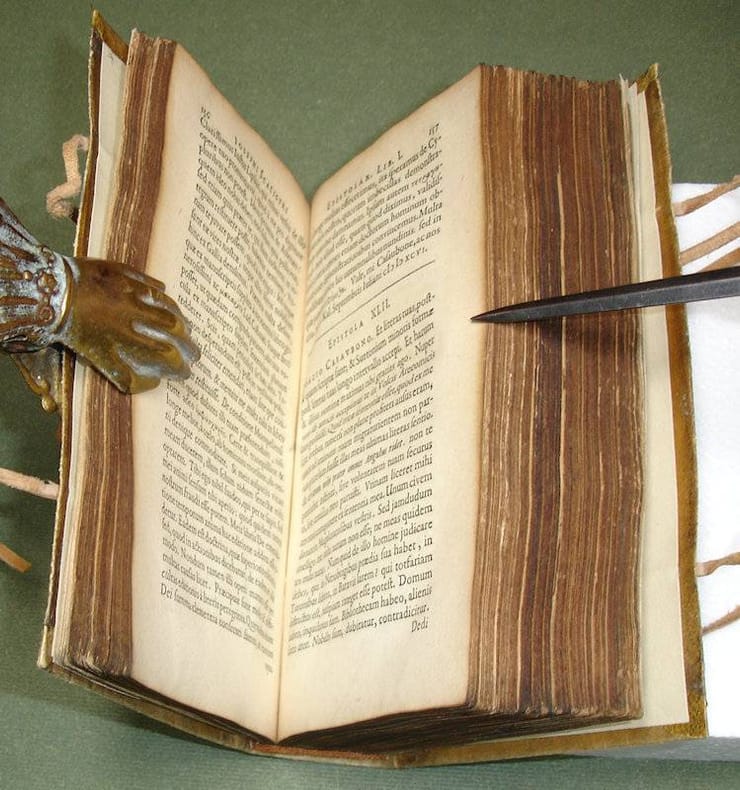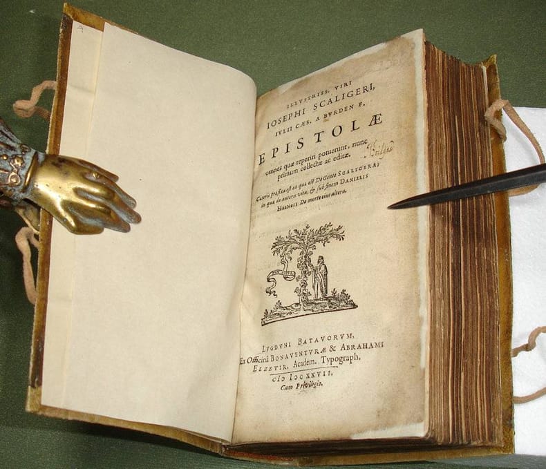 8vo. (XXIV),887,(1 blank) p. Limp restored vellum 18 cm (Ref: STCN ppn 840010095; Willems 288; Berghman 1393; Rahir 253; Smitskamp Scaliger Collection 166; Graesse 6/2,289; Ebert 20438) (Details: Elsevier's printer's mark on the title, depicting an old man who stands in the shade of a vine- elmtree, symbolising the symbiotic relationship between scholar and publisher; the motto: 'Non solus', probably indicates the interdependency of publisher and scholar) (Condition: Binding recently restored antique style. Vellum soiled. Endpapers renewed. Old and small ownership entry on the title. Edges of the title and last leaf, and the tip of the upper corner of first & last 2 leaves skillfully restored. Last 2 leaves slightly soiled. Some faint pencil) (Note: The place of Josephus Justus Scaliger, 1549-1609, in the history of classical scholarship is royal. His preeminence is summarized masterly in the blurb text of the dustjacket of the intellectual biography of Anthony Grafton 'Joseph Scaliger, A study in the history of classical scholarship', Oxford, 1983/93. 'In an age of great classical scholars, Joseph Scaliger was the greatest. His early work as an editor of Latin texts won the attention of the learned throughout Europe and contained technical innovations that remain of interest. His later work as the founder of the discipline of historical chronology involved him in the superhuman task of trying to reconstruct every sophisticated calender and to date every significant event in human history. Along the way he emended hundreds of corrupt passages in classical texts, collated scores of manuscripts, quarrelled with dozens of his rivals, failed humiliatingly (...) to prove that he was descended from the della Scala of Verona - and dashed off in his spare time works that would remain standard for centuries, like Gruter's Corpus of inscriptions, the publication of which Scaliger oversaw. His work was perhaps most important in that it showed that the Bible and the events it recorded could not be understood except in the light of the writings of the pagans and the methods of classical scholarship'. In 1593 he filled the vacant place left by Justus Lipsius at the young the University of Leiden. 'His disinclination to lecture was duly respected; all that the authorities at Leyden desired was his living and inspiring presence in that seat of Protestant learning' (Sandys p. 202). On this honorary post he produced works that made him immortal, and lend lustre to Leyden and its Universtiy. Scaliger spent the last 16 years of his life in Leiden as the jewel of the University. There he enjoyed also the friendship of a great numbers of pupils and admirers. To his circle belonged H. Grotius, D. Heinsius, the Dousae, and in France Du Thou and Casaubon. Scaliger died in the arms of his favourite pupil and closest friend Daniel Heinsius, who wrote a funerary oration for him. The correspondence reflects his relations with contemporary scholars and scientists, and the scholarly circles in which he moved. He corresponded with Salmasius, Heinsius, Casaubon, Lindenbrogius, Gruter, Lipsius, Labbaeus and many others. Scaliger had inherited from his father Julius Caesar Scaliger a profound belief in his descent from the noble Veronese family Della Scala. The correspondence opens with a 58 page letter addressed to Dousa, and is on this matter, 'De vetustate gentis Scaligerae in qua & de vita utriusque Scaligeri'. Here Scaliger tries to prove his princely descent) (Provenance: Old ownership entry on the title of one 'J. Bridges', who also contributed some small marginalia in a clear and legible hand) (Collation: *8, 2*4; A-3I8, 3K4) (Photographs on request)
