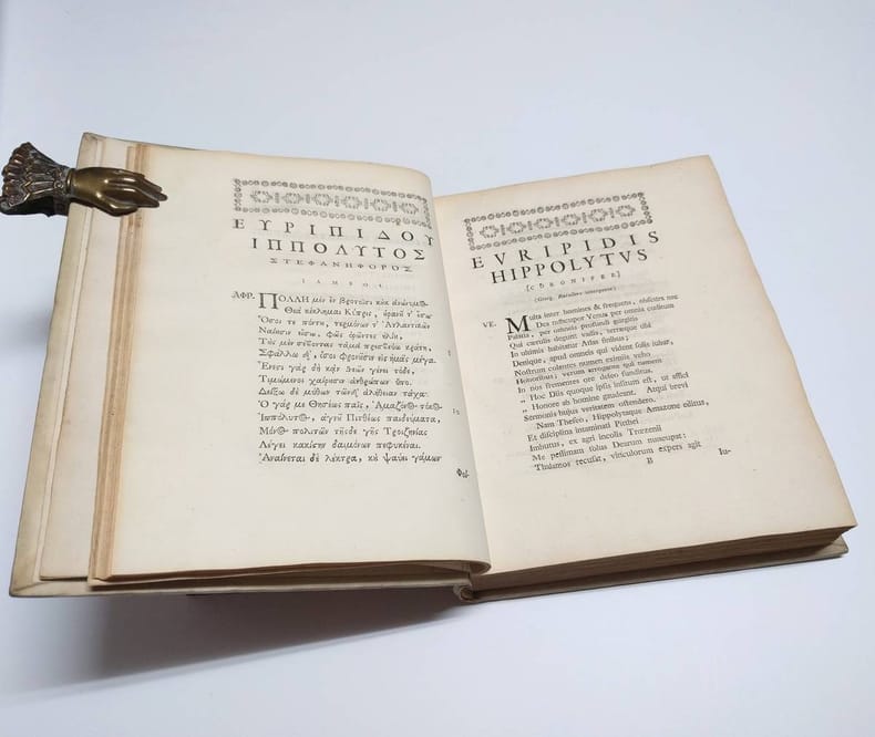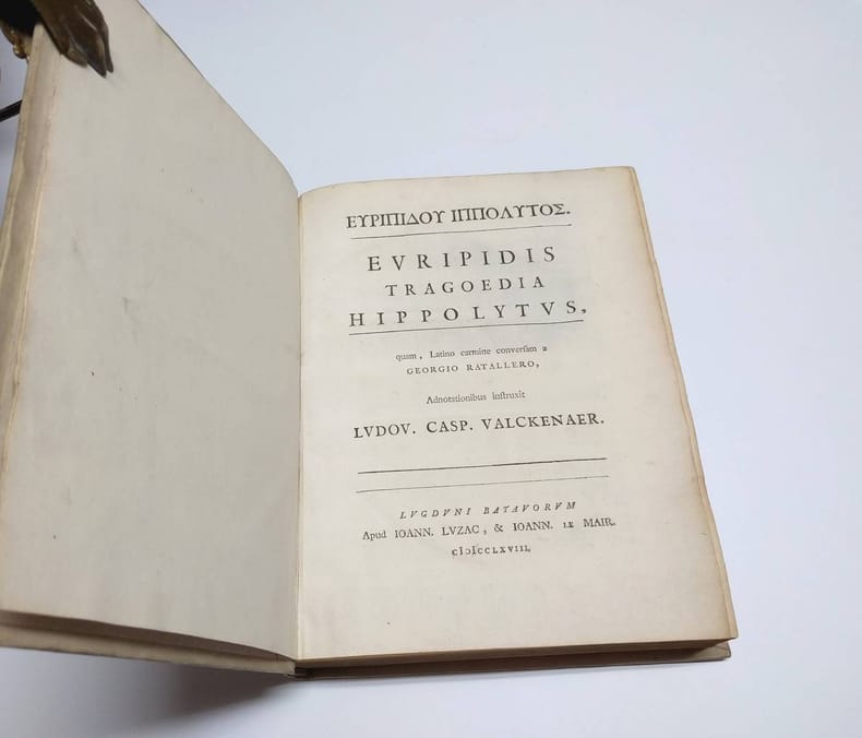 4to. 2 volumes in 1: XXVIII,322,(XVIII);VIII,312 p. Vellum 26 cm (Ref: Hoffmann 2,78; Moss 1,425: 'A very elegant and excellent edition, containing a very correct text'; Dibdin 1,548/49: 'It is a perfect specimen of careful research, acute emendation, and copious illustration'; Brunet 2,1104: 'Édition très recherchée'; Graesse 2,522; Ebert 7107; Spoelder p. 684, Utrecht 4; Ad 1: STCN 238032841; Ad 2: STCN 23803271X; Hoffmann 2,97) (Details: Prize copy Utrecht, without the prize. Back gilt and with 5 raised bands. Boards with gilt borders and the gilt coat of arms of Utrecht, within a gilt rectangle) (Condition: Vellum very slightly soiled. The prize has been removed. All 4 decorative fastening ribbons gone. Front starting to split only at the foot of the spine, for a few centimeters. Nice, clean copy) (Note: 'With Sophokles Greek tragedy reaches its culmination. Euripides, great poet though he was, represents the first symptom of the inevitable decline, for in him we can recognize a certain impatience with the form he found ready to his hand'. This is how H.J. Rose started his chapter on Greek the tragedian Euripides, ca. 480-406 B.C., some 80 years ago. (H.J. Rose, 'A history of Greek literature', 4th ed., London 1965, p. 177, first published in 1934) That opinion has now been superseded. Euripides' play 'The Bacchae', which drew little attention before 1900, 'has come to seem one of the defining models of Greek tragedy and even of tragedy itself, rivalling Aeschylus' Oresteia and Sophocles' Oedipus Tyrannus and Antigone'. (The Classical Tradition, Cambridge Mass. 2010, p. 347) For this, Euripides has to thank the German philosopher Friedrich Nietzsche. The upsurge was caused by his 'Die Geburt der Tragödie aus dem Geiste der Musik' (1872) in which he drew attention to the idea of 'the Dionysiac', a key element in the Bacchae. This idea 'has had a massive influence not only on understandings of tragedy, but on theories of theatrical performances itself'. (Idem, ibidem) The Frisian scholar Lodewijk Caspar Valckenaer, latinized Ludovicus Casparus Valckenarius, 1715-1785, who produced this Hippolytus edition, was a pupil of Tiberius Hemsterhuis, a Frisian too, and after him the greatest Dutch classical scholar of the 18th century. Hemsterhuis was professor of Greek at the University of Franeker from 1717 till 1740, and from 1740 till 1765 at the University of Leiden. Hemsterhuis was the founder of a Dutch school of criticism, the so-called 'Schola Hemsterhusiana', which had in Valckenaer its best known disciple. Valckenaer studied Greek in Franeker under Hemsterhuis, and succeeded to his chair in 1741. In 1765 he left for Leiden, once again as successor of his beloved teacher. Both created a golden age of Greek studies in the Netherlands. Still a student he edited a Greek lexicon of the grammarian Ammonius, 'De adfinium vocabulorum Differentia', Leiden 1739. In Franeker he produced a revised and augmented edition of Fulvio Orsini's 'Virgilius illustratus', Leeuwarden 1747. This title is important for the history of scholarship for its inclusion of the text of the 22nd book of the Iliad of Homer, accompanied by an introduction, 'variae lectiones' and the 'editio princeps' of scholia of Porphyrius and other hellenistic and byzantine scholars. In 1755 Valckenaer published an edition of Euripides' 'Phoenissae', with his rich commentary, and a Latin translation by Hugo Grotius. Among his best works are two other Euripides editions, this Hippolytus edition of 1768 and his 'Diatribe in Euripidis perditorum dramatum reliquias' of 1767. Valckenaer also produced editions of the Idylls of Theocritus, Leiden 1773, and of the complete works of bucolic poets Theocritus, Bion and Moschus, Leiden & Kampen 1779. His Callimachus was published posthumously by J. Luzac in Leiden in 1799. In the introduction to the Hippolytus edition Valckenaer follows the opinion of Longinus who thought that Euripides was not inferior to Sophocles, and that he had been 'felicissimus', in the poetic expression of the 'mentis concitatae pertubationis, furore atque amore'. (Praefatio p. IX) Valckenaer's notes are not printed below the text, but fill the pages 159-322. Valckenaer's Hippolytus edition is usually accompanied by his 'Diatribe in Euripidis perditorum dramatum reliquias', which was published one year earlier, 1767. In it Valckenaer discusses the fragments of the lost plays of Euripides. This treasure of erudition, found in the Hippolytus and the Diatribe, and in the Phoenissae, contributed decisivily to attract the attention of scholarship to Euripides. Valckenaer is considered one of the best commentators of Euripides) (Collation: Ad 1: *-3*4, 4*2; A-T4, V-X2, Y-2V4, 2X2. Ad 2: *4, A-2Q4) ( Photographs on request)