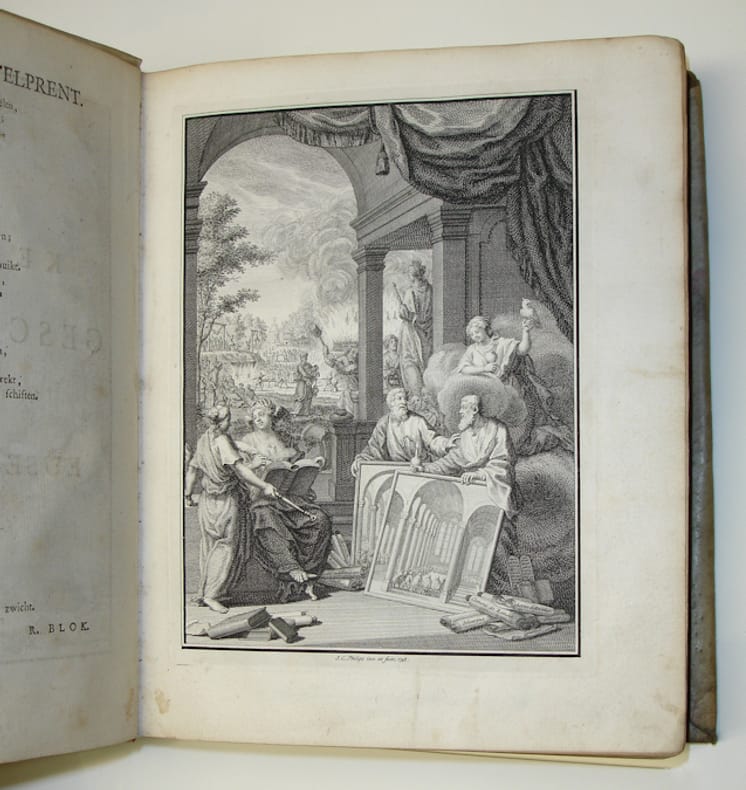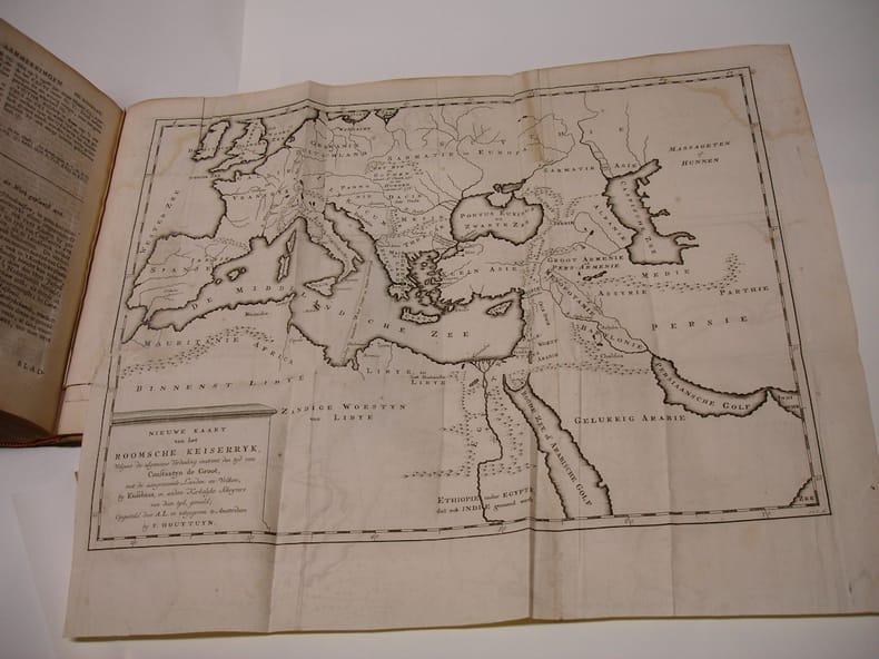 4to. Frontispiece, (XLVI),584,L,116,(36) p., 2 folding maps. Vellum. 26.5 cm (Ref: STCN ppn 82986403, STCN does not mention the cancel of leaf 2Y4, p. 359/360, which our copy has; OiN p. 180) (Details: Title printed in red & black. The frontispiece by J.C. Philips depicts an allegorical scene of the battle between False and True Religion. 15 engravings in the text, 2 folding maps, 43x30 cm, of the Roman empire under Constantine the Great, and of Asia Minor) (Condition: Vellum wrinkled & soiled. Back worn. The vellum seems ill-fitting, it looks as if the binder has tried to make the vellum of an other book fit to this binding. The interior is ok. New endpapers. The maps are slightly waterstained) (Note: Eusebius Caesariensis, ca. 263-339, became bishop of Caesarea in 313, shortly after the Great Persecution of christians, which lasted from 303 till 313. Eusebius was not an original thinker or historian. Nevertheless, he has 'mit Gelehrsamkeit und gründlicher Quellenkenntnis zu vielen Gebieten Beachtliches in einer grossen Anzahl von Schriften beigetragen'. (N.P. 4,310) The most important of his works is his 'Historia Ecclesiastica', the History of the Church. The first 7 books run up to 280 A.D., books 8 & 9 describe the Great Persecution, and book 10 offers the events from 313 till 324; Eusebius developped the idea that a christian emperor has, as a successor of Christ, divine power. This is the first Dutch translation of this work. The book contains also a translation of the appendix to book 8, 'De martyribus Palestinae'. Then follows a translation of 50 p. of Hieronymus' Latin version of the 'Chronicon' of Eusebius, and of its continuation by Hieronymus. At the end 116 p. of annotations by Vander Meersch. Abraham Arent vander Meersch, 1720-1792, was professor of Theology and Church history at Amsterdam. He lectured also on philosophy. He was succeeded by Daniel Wyttenbach in 1771. (See for a vita NNBW vol. 10; and 'Gedenkboek van het Athenaeum en de Universiteit van Amsterdam 1632-1932', p. 684) (Collation: *-6*4 (frontispiece after leaf *1, minus blank leaf 6*4), A-2X4, 2Y4 (cancel leaf 2Y4), 2Z-3A4, 3B4 (leaf chi 1 after 3B3), 3C-4D4; a-f4, g2 (minus blank leaf g2); A-T4 (2 maps after leaf P2)) (Photographs on request) (Heavy book, may require extra shipping costs)