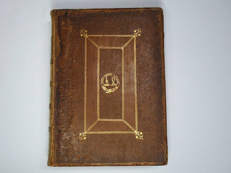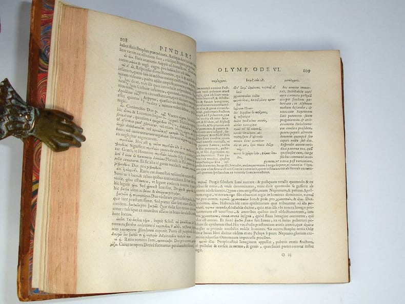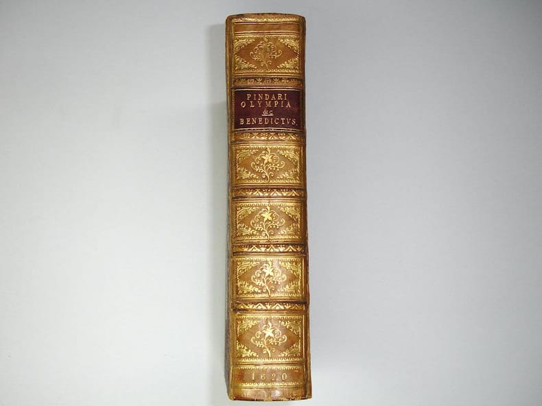 4to. (XVI),756,(recte 750),(56 index) p. Calf 24 cm (Ref: Gerber p. 5; Rico p. 13; Hoffmann 3,99; Schweiger 1,235; Dibdin 2,288; Moss 2,410: 'a very good and critical edition'; Brunet 4,659; Graesse 5,294; Ebert 16864) (Details: The Greek text is accompanied by a Latin paraphrasis on the left and a Latin translation on the right. Back with 5 raised bands, elaborately gilt & expertly rebacked in antique style (in the 19th century?). Boards with gilt fillet borders, having also 2 double fillet gilt rectangles, and a gilt coat of arms in the center. 19th century marbled endpapers. Woodcut ornament on the title. Edges dyed red) (Condition: Binding worn at the extremes. Edges of the boards chafed. Corners bumped. Leather on the boards crackled. Strip of 1 cm cut from upper margin of the title, and repaired with a new strip. A few old ink marginalia) (Note: A quarter of the works of the Greek poet Pindar, ca. 518-438 B.C., survives, his four books of 'epinicia', named after the Great Games, the Olympian, Pythian, Nemean and Isthmian. Pindar wrote eulogistic hymns to celebrate a victory in athletics, boxing and horse racing. Praised in a magnificent way are the victor, his family, the native city. 'Each ode draws from a variety of historical, cultural, and mythological sources. The highly allusive manner by which this material is presented is complemented by an equally rich repertoire of metrical patterns from epic, Doric, and Aeolic systems'. (The Classical tradition, Cambridge Mass., 2010, p. 729) 'Extended similes and difficult metaphors, intricate syntax and rapid narration, far-reaching digressions and bold disruptions' result in grandiose, but also obscure, enigmatic and sometimes seemingly awkward poetry. Already in antiquity the comic playwright Aristophanes presented in the 'Aves' Pindaric poetry as foolish, pretentious and embarrassing. The Hellenistic poets Callimachus and Theocritus wrote poetry under his influence. The Roman poet Horace thought him grandiose and sublime. Pindar's influence on European literature is great. The great number of editions in Greek, and Latin translations of Pindar's odes that were printed in the 16th century are an indication of a continuous and widespread humanist interest. Pindar was, with the Roman poet Horace, the chief classical model for modern formal lyric poetry. The lyric poets of the Renaissance borrowed first of all thematic material from Pindar. It brought a nobler and graver spirit. 'They enriched their language on the model of Pindar's and Horace's odes, taking it father away from plain prose and from conventional folk-song phraseology. And in their eagerness to rival the classics, they made their own lyrics more dignified, less colloquial and song-like (...) more ceremonial and hymn-like'. (G. Highet, 'The classical tradition', Oxford 1978, p. 230) The 'loudest and boldest answer to the challenge of Pindar's style and reputation came from France', beginning with Pierre de Ronsard, born 1524. Ronsard wanted to be the French Pindar, introducing the Pindaric ode into the vernacular literature of France. He, together with his poetic friends 'were the energy and the material, of the group of poets who rebelled against the traditional standards of French poetry and proclaimed revolution in ideals and techniques. They called themselves the Pléiade, after the group of seven stars which join their light into a single glow'. (Op. cit. (Highet) p. 231) Their work amounted to a closer synthesis between French and Greco-Latin literature, and was the annunciation of a new trend in French, and European literature. Many of Pindar's gnomic maximes and punctuated statements, containing elements of traditional wisdom, were collected in Renaissance anthologies of 'sententiae', for example in Erasmus's Adagia. Already the first full Latin translation of Pindar (1528) indexed all the gnomes according to moral lessons. 'The sententious Pindar (...) provided the Humanists of the Reformation with pithy statements of moral instruction and wordly advice, which ensured the poet's place in pedagogical circles. Moreover, as a source of proverbial wisdom, Pindar was elevated nearly to the status of biblical Salomon. (...) The sheer variety of Pindarically influenced traditions -the political ode and the personal, the religious hymn and the song of genius, the freely aimless and the rigorously concise- all serve as a testament not only to Pindar's versatility, but also to his rich potential to inspire'. (The Classical tradition, Cambridge Mass., 2010, p. 729/30) For Filelfo, Pontano, Cowley, Dryden Pindar was a model for political encomium, and there are quite a number of imitators of Pindar in European literature. The French author Voltaire made the witty remark that Pindar wrote verses that no one understood, and everyone had to admire. This Pindar edition of 1620, produced by the scholar Jean Benoist, or Johannes Benedictus, (died 1664) is based on the edition of Wittenberg of 1616 by the German scholar Erasmus Schmi(e)d(t), or Schmidius, 1570-1637, who was the first truly important Pindaric scholar, and according to Dibdin the 'eruditorum Pindari facile princeps'. Benoist was a doctor of medecin, and, it is said, of German origin. He was appointed on the recommandation of the great Greek scholar Isaac Casaubon the King's professor of Greek at the protestant Academy of Saumur. A year before Benoist had published in Saumur an edition of Lucian, also with his Latin translation. His Latin translations leaves however, according to Hutton, much to be desired. (J. Hutton, 'The Greek Anthology in France', Ithaca, N.Y., 1946, p.176/77) The commentary of Benoist on the other hand is excellent, for many philological, historical and mythological problems are explained in a sagacious manner. The text also contains many valuable readings from other earlier works, and there are excerpts of scholia. 'Benedictus contributed 23 emendations, 4 of which are printed and 2 mentioned in 