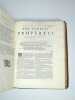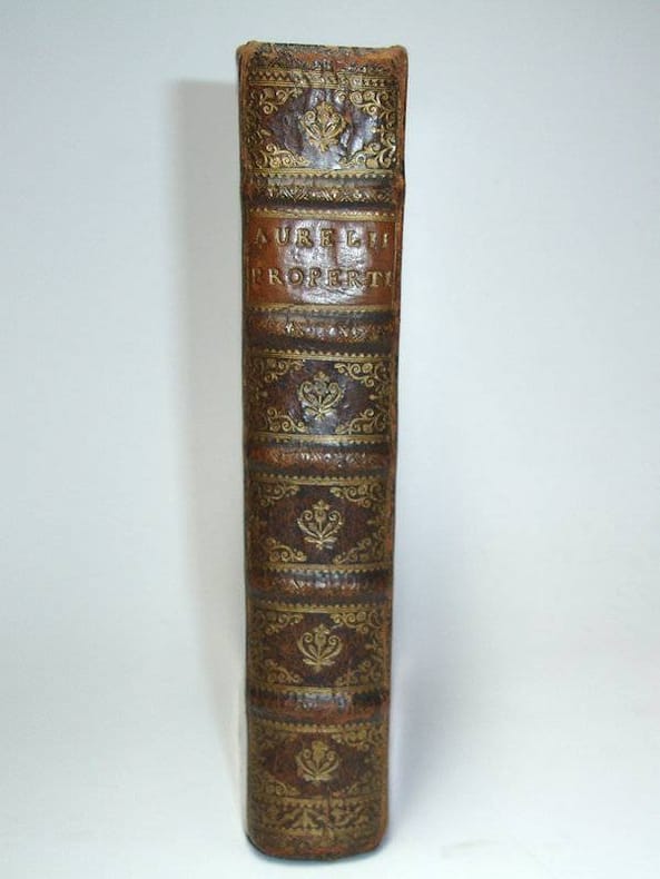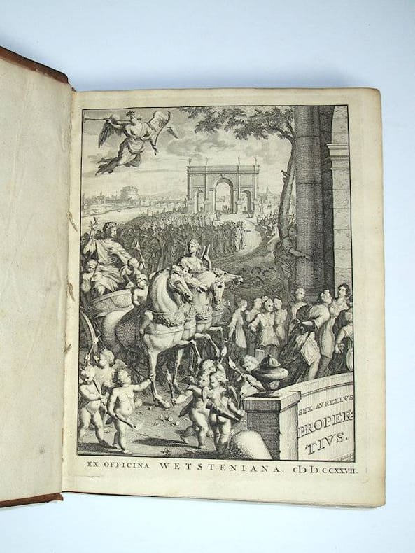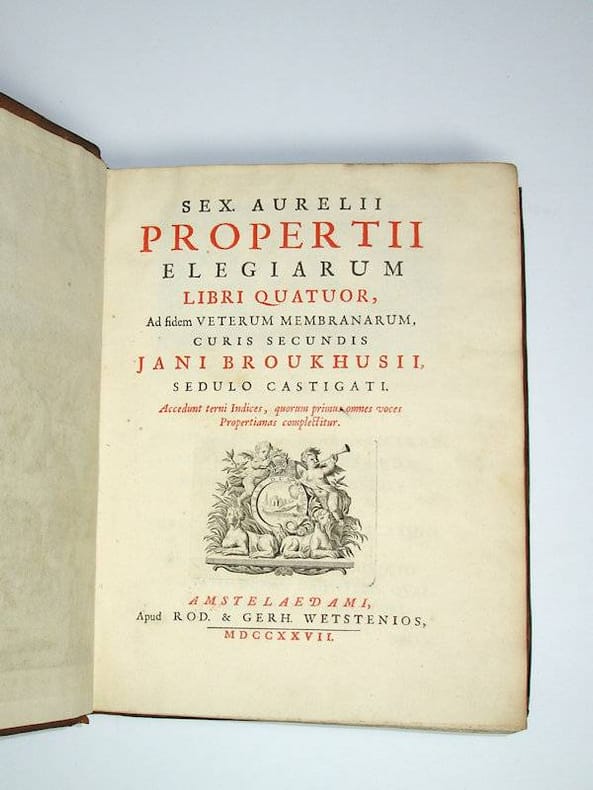 4to. (XXXII, including the frontispiece), 489,(1),(109 indices),(1 blank) p. Contemporary calf. 24 cm (Ref: STCN ppn 18661859X; Schweiger 2,830; Dibdin 1,384: 'very valuable'; Moss 1,274: 'A good edition, containing a valuable and useful commentary'; Graesse 5,460: 'belle édition'; Ebert 18028; Brunet 4,904/05: 'Édition assez recherchée'; Fabricius/Ernesti 1,435) (Details: Back gilt and with 5 raised bands. Brown morocco shield in the second compartment. Frontispiece designed and executed by J. Mulder, it depicts a Roman Emperor in a chariot; he is leading a triumph; in front of him the wives of his conquered ennemies with their hands bound behind their backs; in the background a triumphal arch and the monumental grave of Augustus. Title printed in red & black. On it the engraved printer's device, it depicts a burin being sharpened on a whetstone (Wetstein!), around it the device: 'Terar dum prosim'. At the beginning of the 'dedicatio' the engraved coat of arms of Stephanus Hurgronje) (Condition: Some slight wear to the extremities of the binding. First gathering slightly yellowing) (Note: The young equestrian Sextus Propertius, born ca. 50 B.C., is one of the most fascinating Roman love poets. His surviving work consists of four books of 'Elegiae', containing 4046 lines of elegiac verse. His poetry, at times obscure, learned and eccentric, can be witty, shows dramatic power, and combines polish and refinement. From the Renaissance onward Propertius formed part of a triumvirate of Latin erotic poets, together with Catullus and Tibullus. They were already united in one edition published in Venice in 1472. The list of combined editions of these 3 is huge. A fashion for imitating them arose. Many humanist elegiac poets produced poems addressed to some alluring girl, as Propertius had done for his Cynthia. Propertius influenced among others the Dutch erotic poet Janus Secundus, the English poet John Donne and the German author Goethe. Wellknown is Ezra Pound's 'Homage to Sextus Propertius' (1917). This 1727 edition of Propertius is a revised edition of the edition of 1702. The first edition was produced by the Dutch scholar/soldier Joan van Broekhuizen (Janus Broukhusius), 1649-1707, who during an adventurous life pursued his classical studies and poetry at leisure. As a neolatin poet he is known as the 'Propertius of Holland'. (Sandys 2,329) In 1684 he published his 'Carmina', a collection of his Neolatin poetry. (Utrecht 1684) His editions of Propertius (1702) and Tibullus (1707) laid the foundation for his reputation as a classical scholar. He was admired as a latinist, for his taste and for his erudition. (NNBW 4,309/12) This second edition was produced by the Dutch scholar and minor poet Pieter Vlaming, 1686-1733. In the preface (L.B., Lectori Benevolo) Vlaming tells us that he once bought at the auction of the library of the Dutch classical scholar and schoolmaster David Hoogstraten a 'codex' (manuscript), filled with annotations from the hand of Broukhusius, which he apparantly had been collecting for a projected second edition of Propertius. Nothing came however of such an edition. (Hoogstraten died 1724) Now, at the request of the publishers Wetstein, Vlaming produced a new revised and augmented edition of Propertius. 'Nihil dedimus nisi mere Broukhusianum'. (p. **3 recto) One year later, in 1728, and 21 years of the death of Broukhusius, Vlaming published also Broukhusius' edition of the 'Opera omnia' of the Italian neolatin poet Sannazarius/Sannazaro) (Provenance: On the front flyleaf 2 small names: ''Margadant 1912', and 'F.J. Brevet 1914'. The first name must be of the Dutch man of letters Steven Willem Floris Margadant, born in The Hague in 1887; he died in 1946. In 1929 he published 'De psychologie van het Grieksche werkwoord'. ('Persoonlijkheden in het Koninkrijk der Nederlanden in woord en beeld', Amsterdam 1938, p. 979) The next owner, the jurist Frederik Jacobus Brevet, 1893-1983, was a businessman and also a man of letters. In 1958 he published a translation of 16 odes and an epode of Horace. In 1966 followed a more varied collection, 'Mozaïek', which contained, besides more translations of Horace, also Catullus, a number of poems from the 'Carmina Burana', and from Greek poet Meleager, and poetry of his own. In 1978 appeared a translation of all 103 odes of Horace. From 1952 till the end his life he contributed a great many articles on classical culture to the periodical Hermeneus of the Dutch Classical Society (NKV). He bought this book at the age of 21 when he was studying law in Leiden) (resources.huygens.knaw.nl/bwn1880-2000/lemmata/bwn3/brevet)) (Collation: *-4*4; A-4F4 (leaf 2F4 verso blank)) (Photographs on request)
