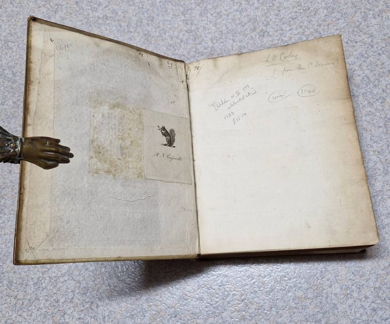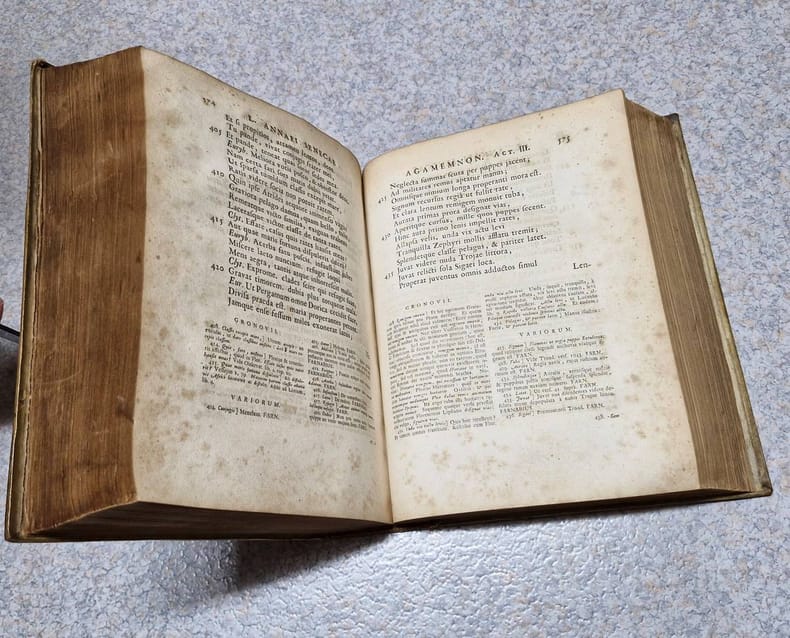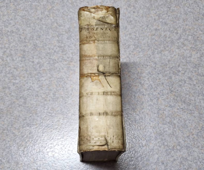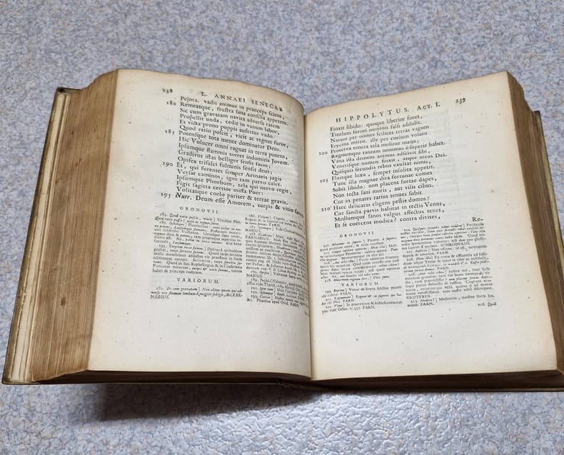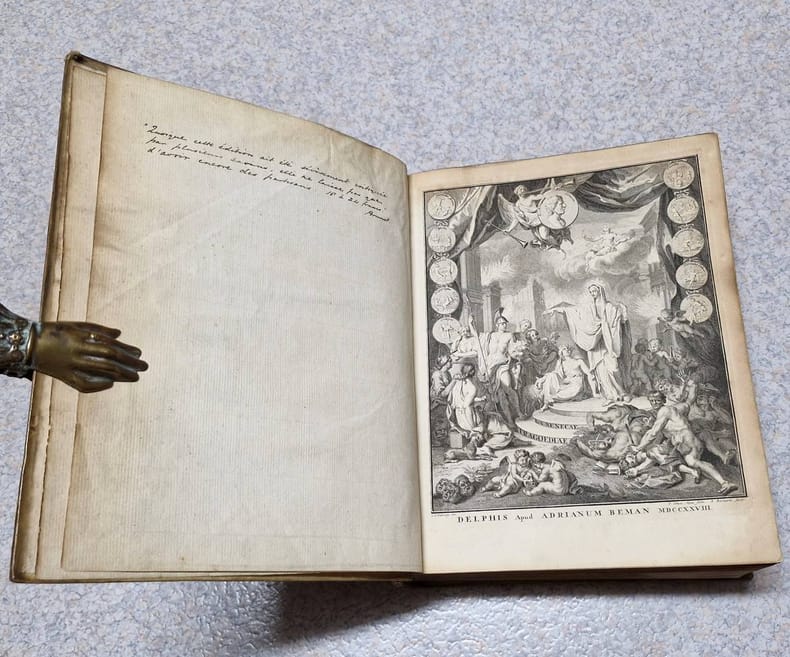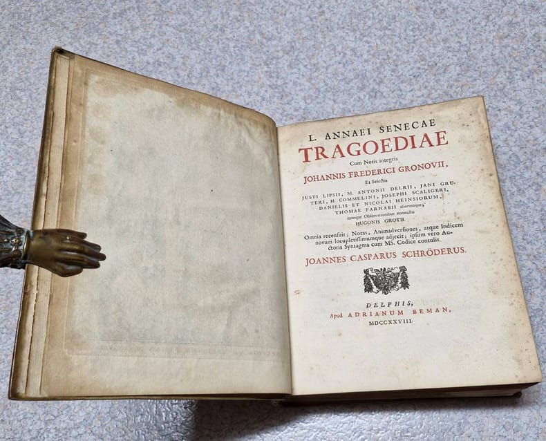 4to. (XXIV including frontispiece),(98),802,(214 index) p. Vellum 27 cm (Ref: STCN ppn 14155522X; Schweiger 2,941; Dibdin 2,399: 'a very elaborate and celebrated edition'; Fabricius/Ernesti 2,136/37; Brunet 5,286; Moss 579/80: 'its merits are highly and justly appreciated'; Graesse 6/1,359; Ebert 20942; Ter Meulen/Diermanse 540) (Details: Back with 6 raised bands. Boards with blind double fillet borders, and a blind stamped oval ornament in the center. Frontispiece designed by L.F. Dudourg and executed by F. Ottens and B. Bernarts, depicting some scenes from the tragedies. Title printed in red & black. Upper part of the page has the Latin text, the lower part the commentary) (Condition: Vellum soiled. Back cracked and damaged, partly discoloured; its head repaired with chemical glue. Both joints are split, but strong. Paper partly foxed, yellowing and browning. Bookplate on the front pastedown) (Note: There is 'widespread agreement that Seneca's tragedies are important dramas and that the question whether they were composed for recitation or for performance is largely irrelevant. (...) Modern opinion is divided over the extent of Stoic doctrine in them; the majority incline toward judging them solely as dramas. Knowledge of the tragedies was spotty in late antiquity; (...). The earliest complete manuscript is the Codex Etruscus from Italy in the 11th century. It was read by Poliziano and was the basis of the edition of J.F. Gronovius (Amsterdam 1661), the first reliable printed text. The 'editio princeps' was printed at Ferrara in 1484; the first edition with a critical text and commentary of any value was that of Jodocus Badius (Paris 1514), which included the conjectures of Erasmus. (...) Seneca was by far the most important classical model for Renaissance tragedy, at a time when Greek tragedy was hardly known. (...) There is philosophical reflection, especially in the choruses, but that is not their main purpose, and there is psychological subtlety, despite the rhetoric. (...) Julius Caesar Scaliger in his 'Poetices' maintained that Seneca surpassed the Greek tragedians in dignity ('maiestas') and had greater polish and brilliance ('cultus ac nitor') than Euripides. (The Classical Tradition, Cambridge Mass., 2010, p. 876) This 1728 edition of the tragedies of Seneca is based on the Amsterdam edition of Gronovius of 1682. It offers the entire notes of the Dutch scholar of German origin Johannes Friedrich Gronovius, 1611-1671, who was professor of Greek at the University of Leiden, and the selected notes of Lipsius and of many other scholars, among whom Hugo Grotius. Seneca owes more to Gronovius than to all the preceding editors. His edition marked the beginning of a new age in Senecan scholarship. His commentary is superb, and he greatly amended the text. This so-called 'Variorum' edition of 1728 was produced by the Dutch schoolmaster Johannes Caspar(us) Schröder(us), who was Rector of the 'Schola Latina' at Delft. He added also notes of his own, which are according to Dibdin 'frequent and judicious', but according to Schweiger 'weder zahlreich, noch besonders werthvol'. A 'Variorum' edition offers a 'textus receptus' which is widely accepted, accompanied with the commentary and the annotations of various specialists, taken, or excerpted from earlier useful, normative or renewing editions. Editions like these, 'cum notis Variorum', were useful, but never broke new ground. The production was the specialty of Dutch scholars of the 17th and 18th century.) (Provenance: Engraved bookplate on the front pastdown of 'R.N. Cresswell', above the name a squirrel cracking a nut. This might well be the member of the landed gentry and member of the English bar R.N. Cresswell, Esq. Barrister-at-Law, once, in 1844, working at the Insolvent Court, London. The squirrel figures in the coat of arms of that family. On the front flyleaf in pencil 'L.H. Cooley, from Rev. C. Dea....') (Collation: pi1, *-3*4; a-m4, n1; A-6M) (Photographs on request) (Heavy book, may require extra shipping costs)