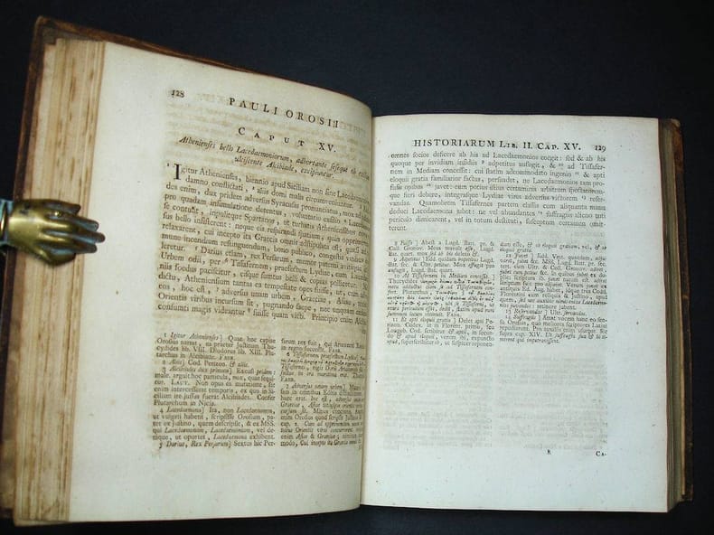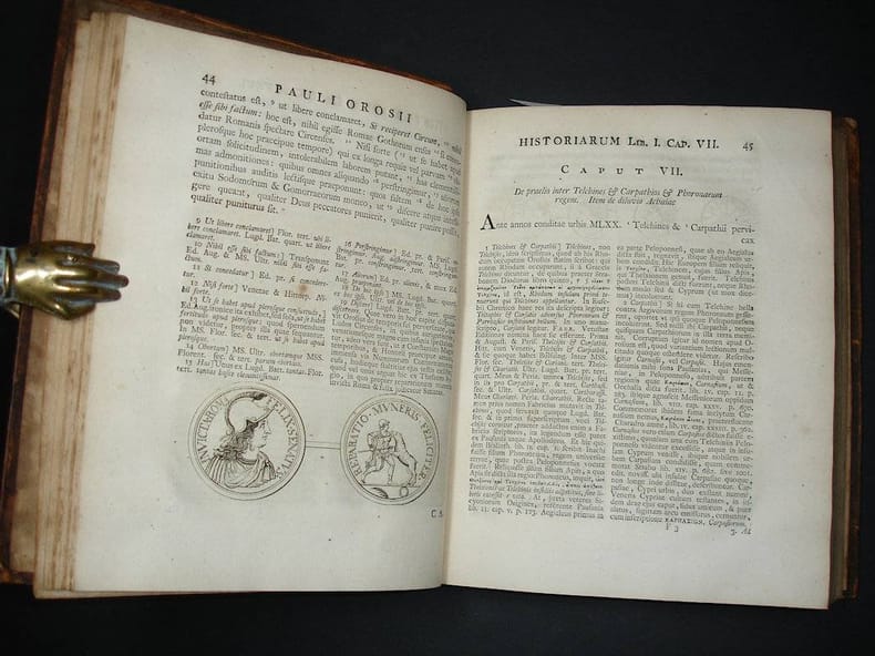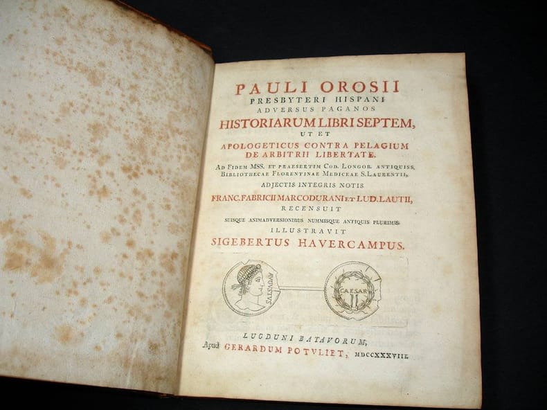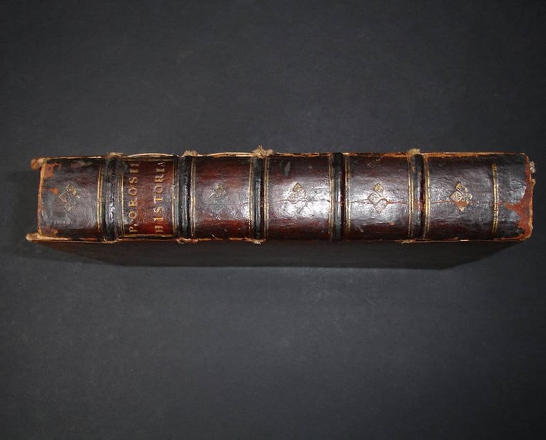 4to. (XXXVIII),634,(30 index) p. Calf 25.5 cm (Ref: STCN ppn 238889998; Schweiger 2,622: 'Neue Recens. der Geschichtsbücher nach 11 Hdschr. u. älteren Ausgg.'; Schoenemann p. 502/3: 'quae ad Historiae illustrationem spectant docte ubique apposita sunt, ut nihil ex hac parte desiderari possit'; Brunet 4,237: 'Édition la meilleure que l'on ait de cet auteur, elle est peu commune et très recherchée'; Ebert 12256; Graesse 5,52) (Details: Back ruled gilt, and with 5 raised bands, & with a red morocco letterpiece in the second compartment. Title printed in red & black, and with an engraved numismatic vignet: both sides of a coin of Caesar Augustus. Numismatic text engravings on about 100 p.) (Condition: Head & tail of the spine gone. Front joint cracked and hanging on 3 bands. Rear joint cracking. Boards scratched, corners bumped. Paper partly somewhat browning. Endpapers foxed) (Note: Paulus Orosius, 5th century A.D., was a priest from Portugal. Fled before the Vandals he became a pupil of Augustine. It is on his instigation that Orosius wrote his 'Historia adversus Paganos', the first Christian universal history, from the creation of the world to the founding and history of Rome until A.D. 417. His pagan sources for Roman history were Livy, Tacitus, Suetonius, Justinus and Eutropius. We see here the course of history through the eyes of his master Augustine, who asked Orosius to write a historiographic 'supplement' to his 'City of God'. The work was apologetic, and attacked the pagan complaint that Rome's troubles were caused by her abandonment of the pagan Gods. He proved that there were also sufferings before the rise of Christianity. 'Ego initium miseriae hominum ab initio peccati hominis docere (ducere) institui', he tells the reader in the first chapter, and wanted to demonstrate that the sufferings of humanity diminished since Christ. The History was widely read in the Middle Ages. (Neue Pauly 9,53/4) An edition of this work was produced by the Dutch scholar Siegbert Havercamp, 1684/174, since 1721 professor of Greek at Leiden University. Schoenemann praises Havercamp because he offered also the 'praefationes' of worthy predecessors. Havercamp included the complete commentary on the 'Historiae' of Franz Fabricius of Düren, (also called Marcoduranus) 1527-1572. Fabricius studied in Paris under Ramus and Turnebus, and published much on Cicero. His Orosius edition dates from 1561. (Sandys 2,268, and ADB 6,507) Havercamp also incorporated the commentary of Ludovicus Lautius, a Flemish priest, who's commentary was published in 1615 in Mainz. (Van der Aa 11,214)) (Provenance: In the right margin of the title a small oval embossed ownership stamp of the 'Free Church College Library Glasgow'. The 'Free Church College Library', Glasgow, was established in 1856, and renamed 'United Free Church College Library' after the reunion of the 'Free Church of Scotland and United Presbyterian Church' in 1900; then it was renamed 'Trinity College Library' after reunion of the 'United Free Church' and the 'Church of Scotland' in 1929. Now it is incorporated in the University of Glasgow Divinity Hall Library) (Collation: +-2+4, *-3*4 (minus blank leaf 3*4), A-4O4) (Photographs on request)